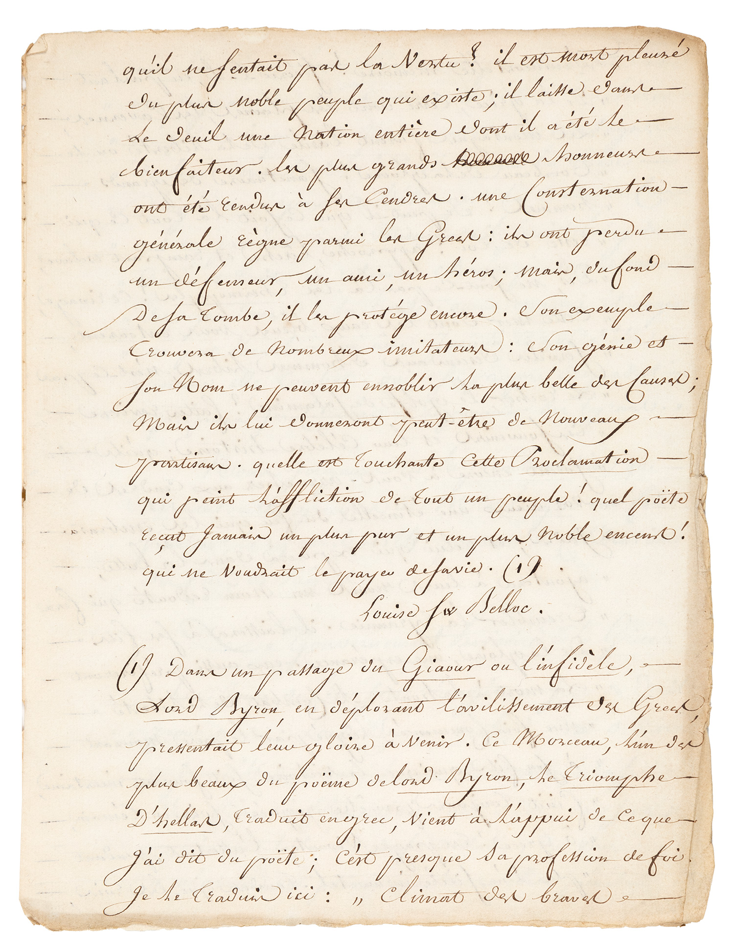 Τιμή εκτίμησης: € 800 - 1.200Γραμμένο με μελάνι σε δύο λυτά δίφυλλα, [7] σ., 262 x 200 mm. (η σ. [8] λευκή). Υπογεγραμμένο στη σ. [3]: «Louise Sw. Belloc». • H Louise Belloc δημοσίευσε κατά τα έτη 1824-1825 το δίτομο έργο της Lord Byron (Παρίσι, A.-A. Renouard, βλ. Droulia 821 και 1152), ενώ το 1830 κυκλοφόρησε η πεντάτομη μετάφρασή της από τα αγγλικά του Mémoires de Lord Byron, published by Thomas Moore (Παρίσι, A.
