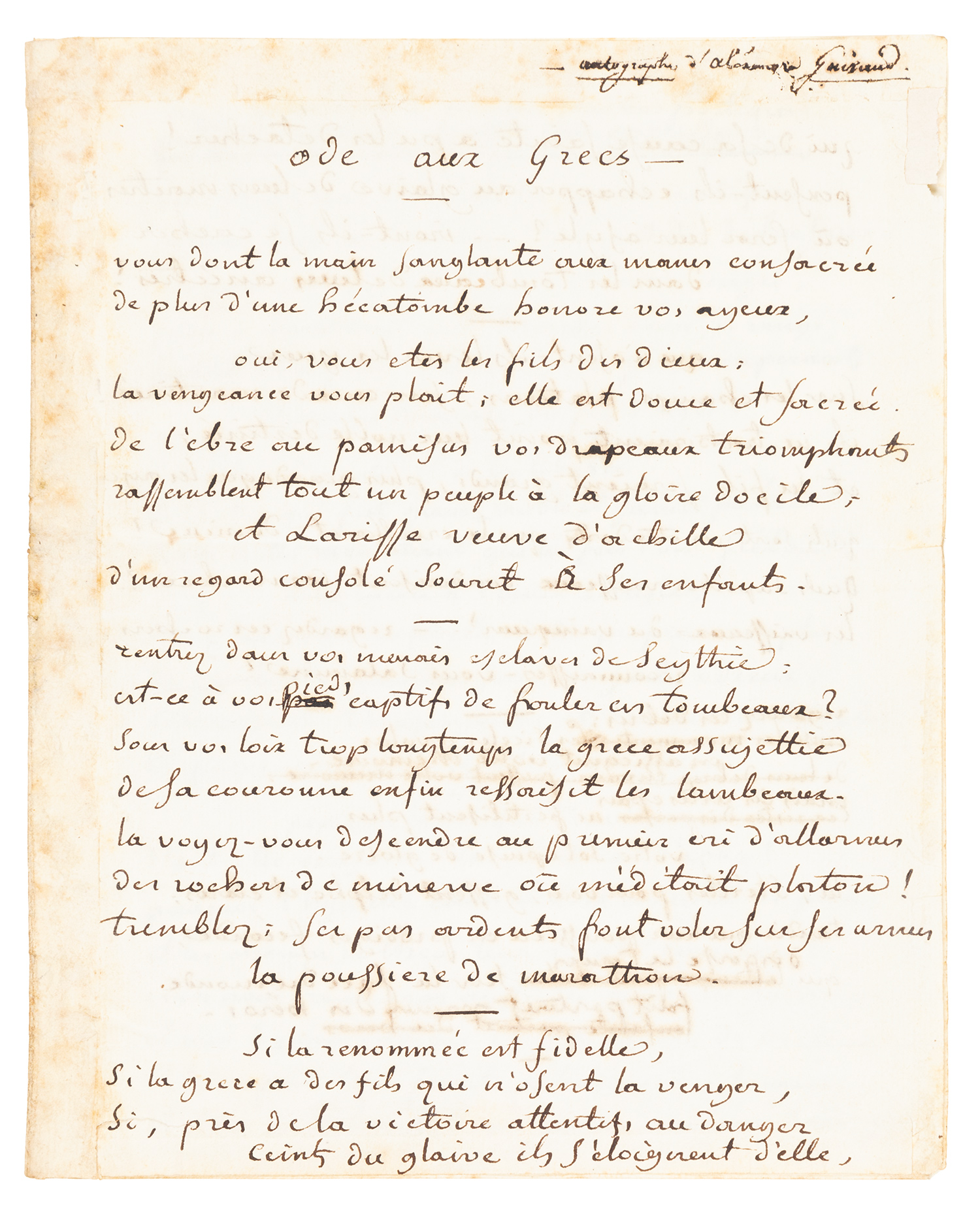 Αὐτόγραφο τοῦ ποιήματός του «Ode aux Grecs».