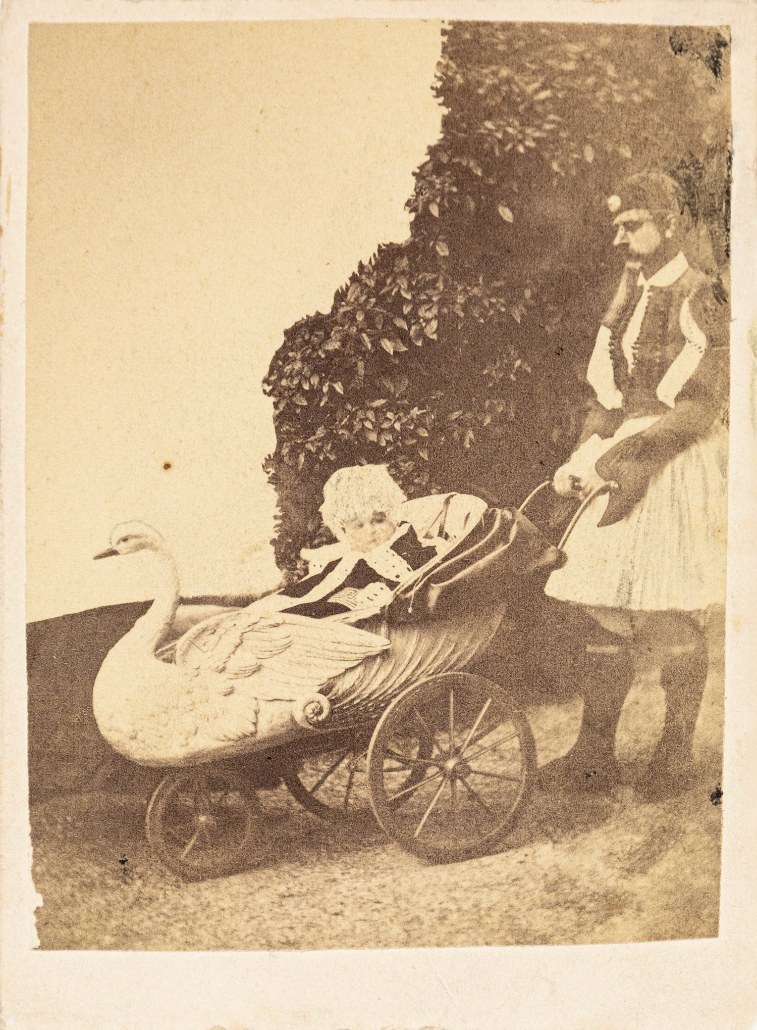 Τιμή εκτίμησης: € 200 - 300Σημείωση με μελάνι στην πίσω όψη («Il piccolo / Principe ereditario della / Grecia / Costantino figlio di Giorgio I. / Re degli Elleni / e della / Regina Olga Constantinovna / Gran Duchessa di Russia / offre / Fr. S. a Luigia Zeni / nel di 21. Giugno 1869»), τύπωμα αλμπουμίνας επικολλημένο σε λεπτό χαρτόνι, 82 x 62 mm. • ΣΠΑΝΙΟ.