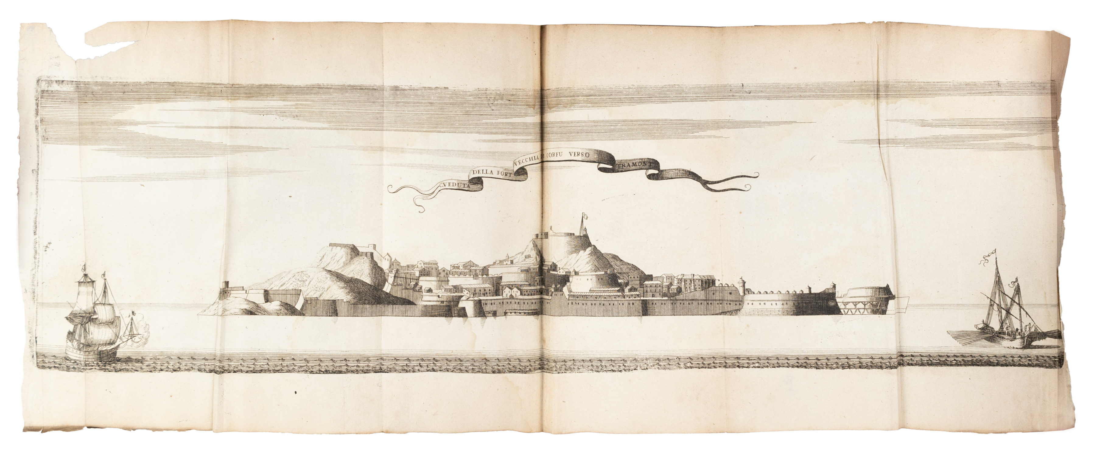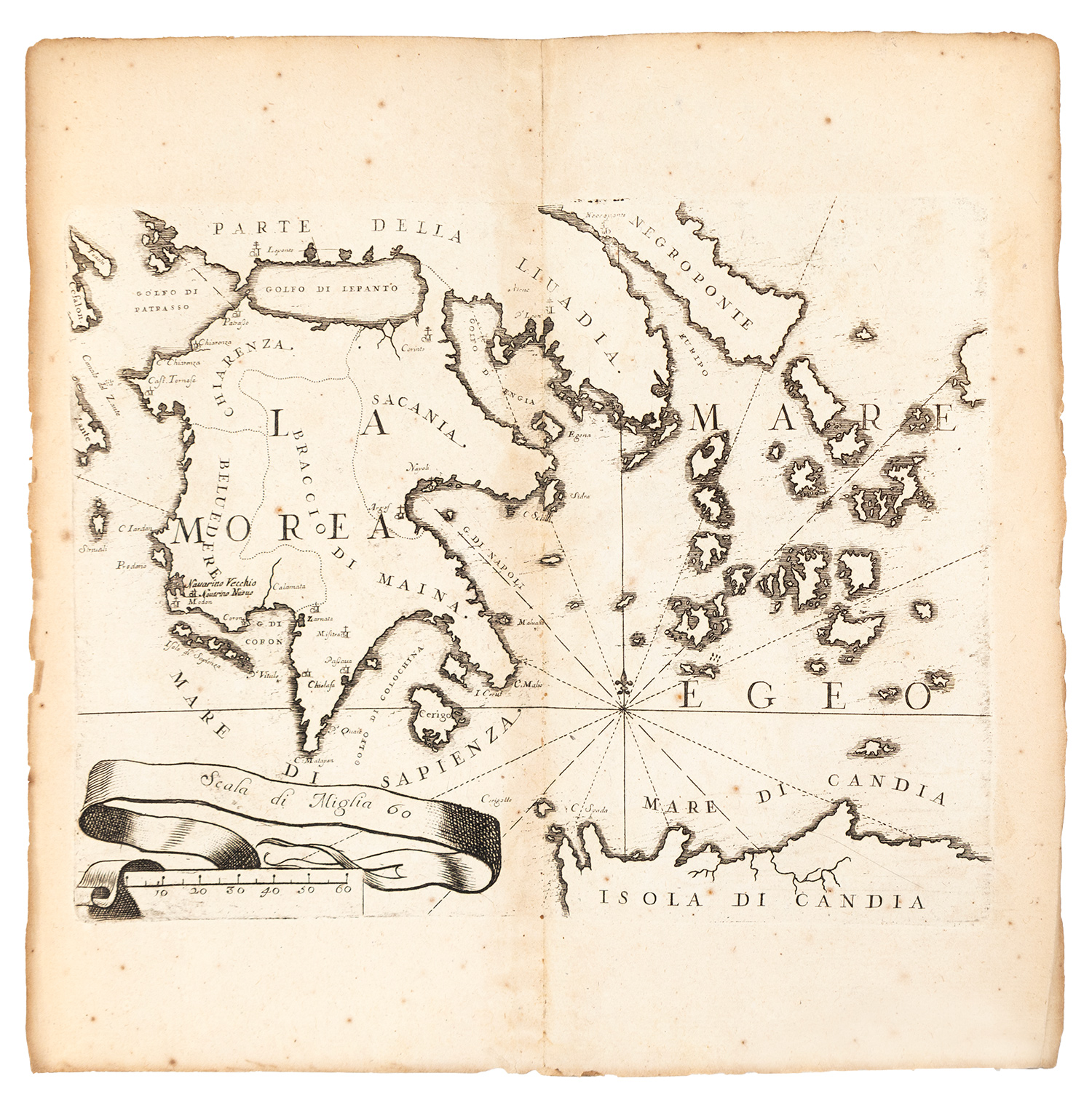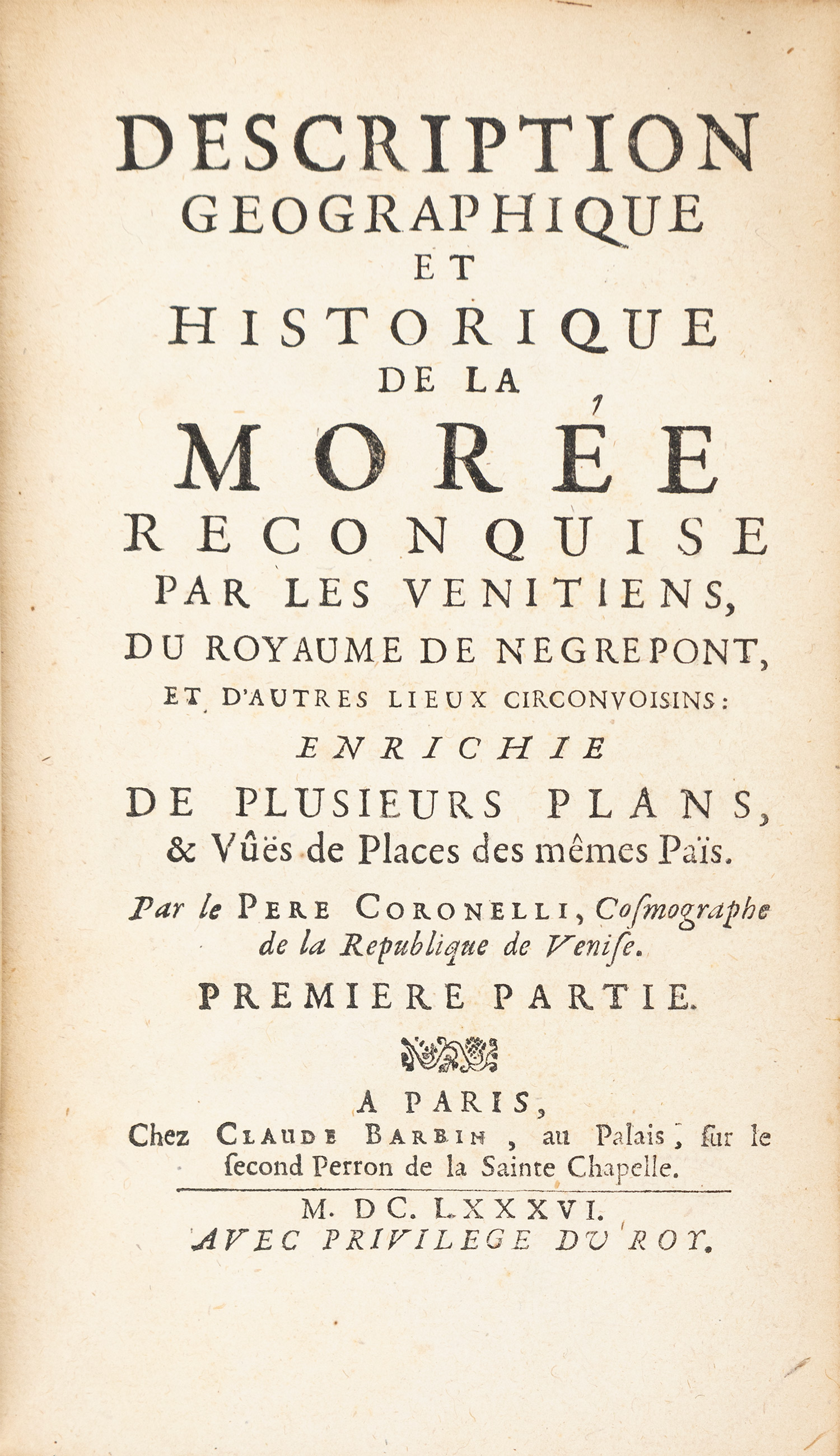Τιμή εκτίμησης: € 800 - 1.200Πρώτη έκδοση στα γαλλικά, 2 μέρη σε έναν τόμο, 8o (190 x 110 mm.), 164 και 131 σ. (λείπουν 2 πίνακες: «Plan de Passava» και «Porto Lione», λυμένος ο χάρτης, σχεδόν λυμένος ένας πίνακας, δεμένος ανάποδα ένας άλλος, δεμένα με λάθος σειρά τα φύλλα του τεύχους D του Β´ τόμου). Με έναν δισέλιδο χαλκόγραφο χάρτη και 55 χαλκόγραφους πίνακες (όλοι δισέλιδοι εκτός από 2 αναδιπλούμενους), ξυλόγραφα επίτιτλα και πρωτογράμματα. Μεταγενέστερο δέρμα (μικρό σχίσιμο στην πάνω και την κάτω ένωση, λείπει πολύ μικρό τμήμα από την κορυφή της ράχης, μικρές φθορές, χρυσή διακόσμηση στη ράχη). Armao 35, Zacharakis 1043 κ.έ., πρβ. Atabey 287, Brunet, II, στ. 293, Contominas 168. • Σύμφωνα με τις οδηγίες προς τον βιβλιοδέτη του Β´ μέρους, θα έπρεπε στην αρχή του να επαναλαμβάνονται οι πίνακες «Venize triomphante» και «Carte generale geographique de la Morée», ωστόσο στο παρόν, όπως και στα διαθέσιμα ψηφιοποιημένα αντίτυπα, είναι δεμένοι μόνο στην αρχή του Α´ μέρους.