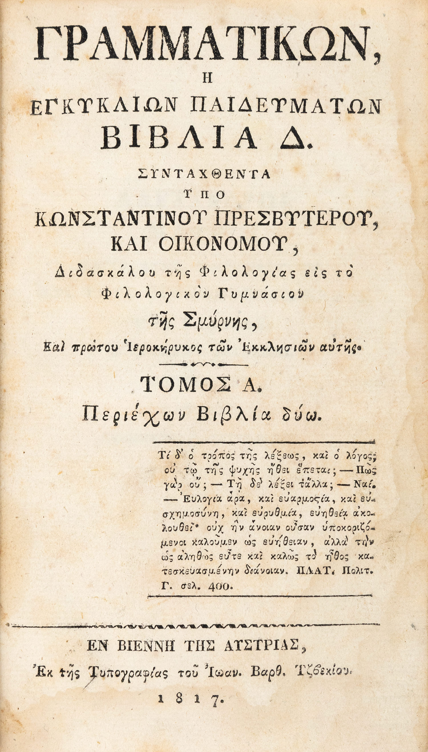 Γραμματικῶν, ἤ ἐγκυκλίων παιδευμάτων βιβλία Δ. Συνταχθέντα ὑπόΚωνσταντίνου Πρεσβυτέρου, καί Οἰκονόμου, Διδασκάλου τῆς Φιλολογίας εἰς τό Φιλολογικόν Γυμνάσιον τῆς Σμύρνης, καί πρώτου Ἱεροκήρυκος τῶν Ἐκκλησιῶν αὐτῆς.