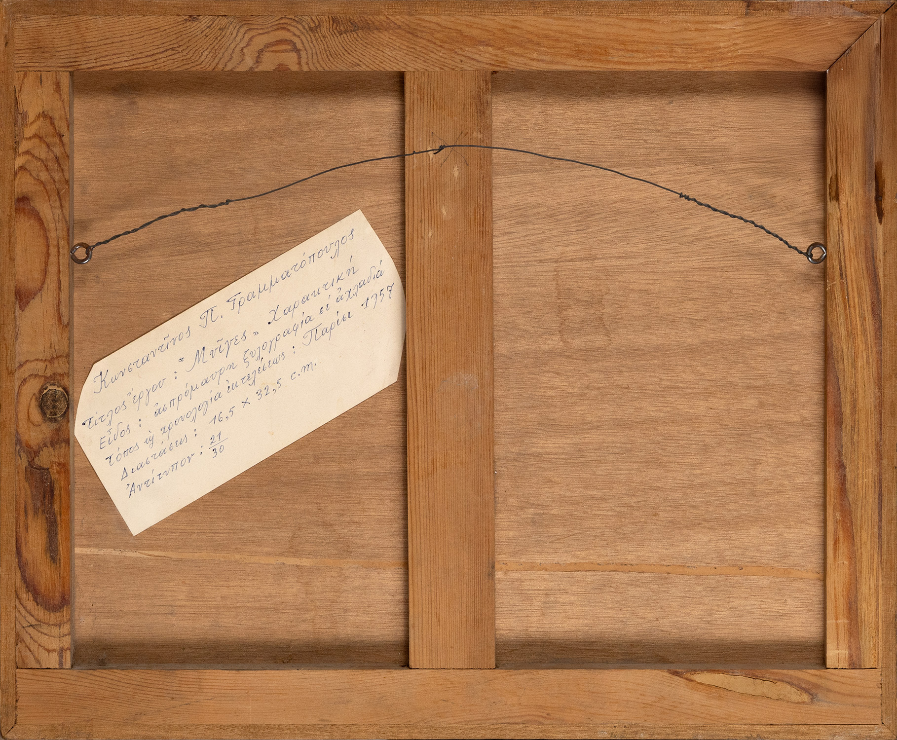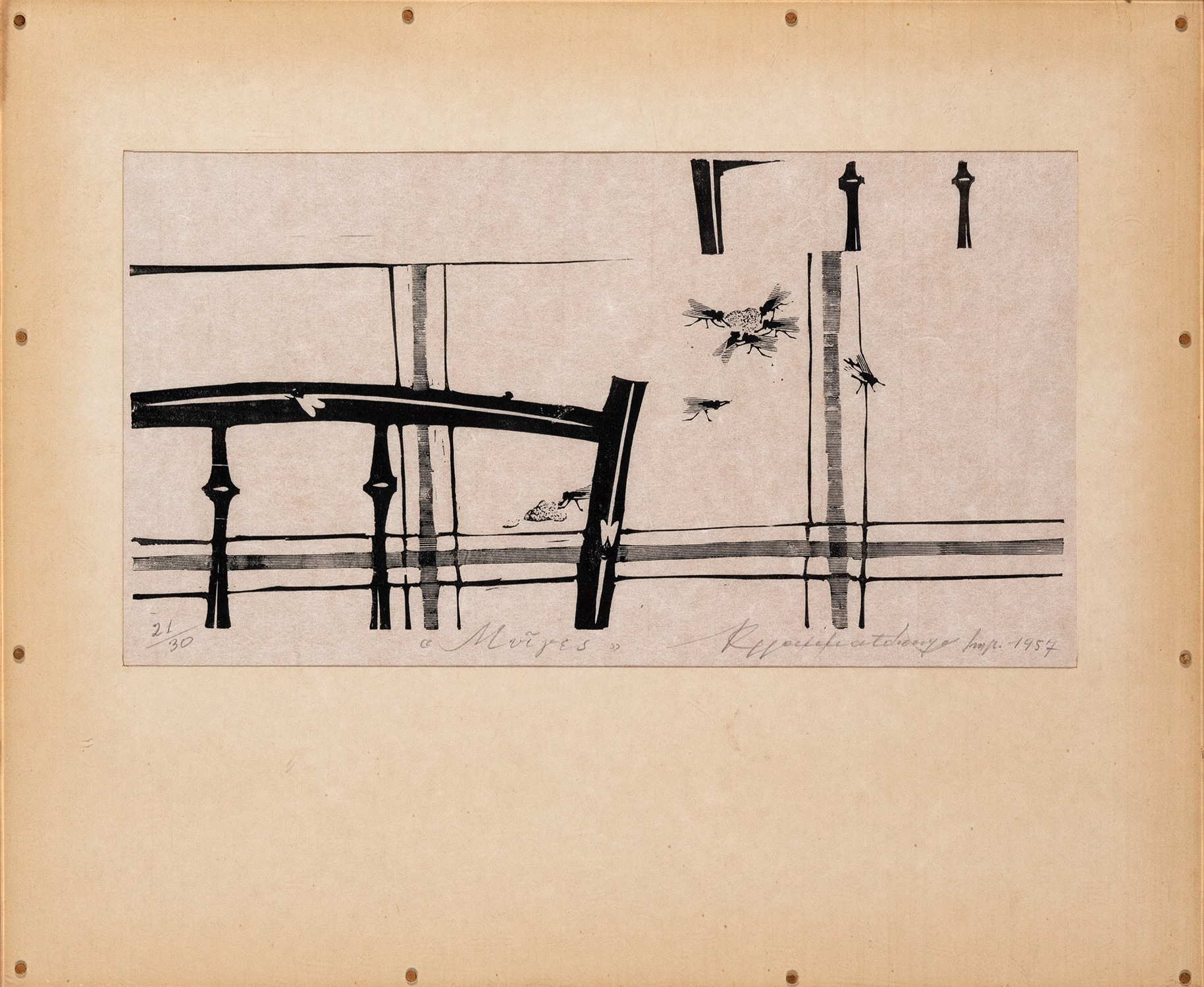 Ξυλογραφία σε πλάγιο ξύλο, 180 x 335 mm. Έκδοση σε 30 αντίτυπα, αρίθμηση, τίτλος, υπογραφή και χρονολογία στο κάτω περιθώριο με μολύβι. Σε κορνίζα.