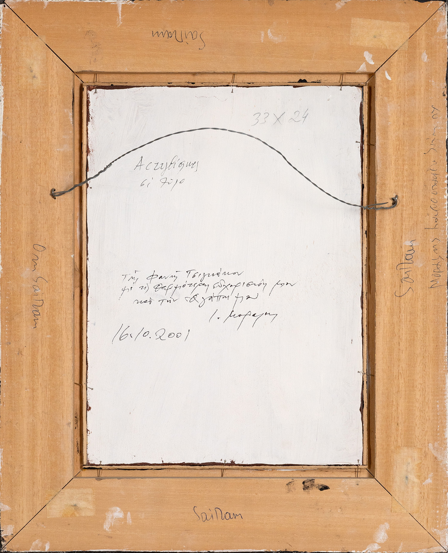 υπογεγραμμένο και χρονολογημένο κάτω δεξιά: Ι. Μόραλης/2000 με αφιέρωση του καλλιτέχνη στην πίσω όψη