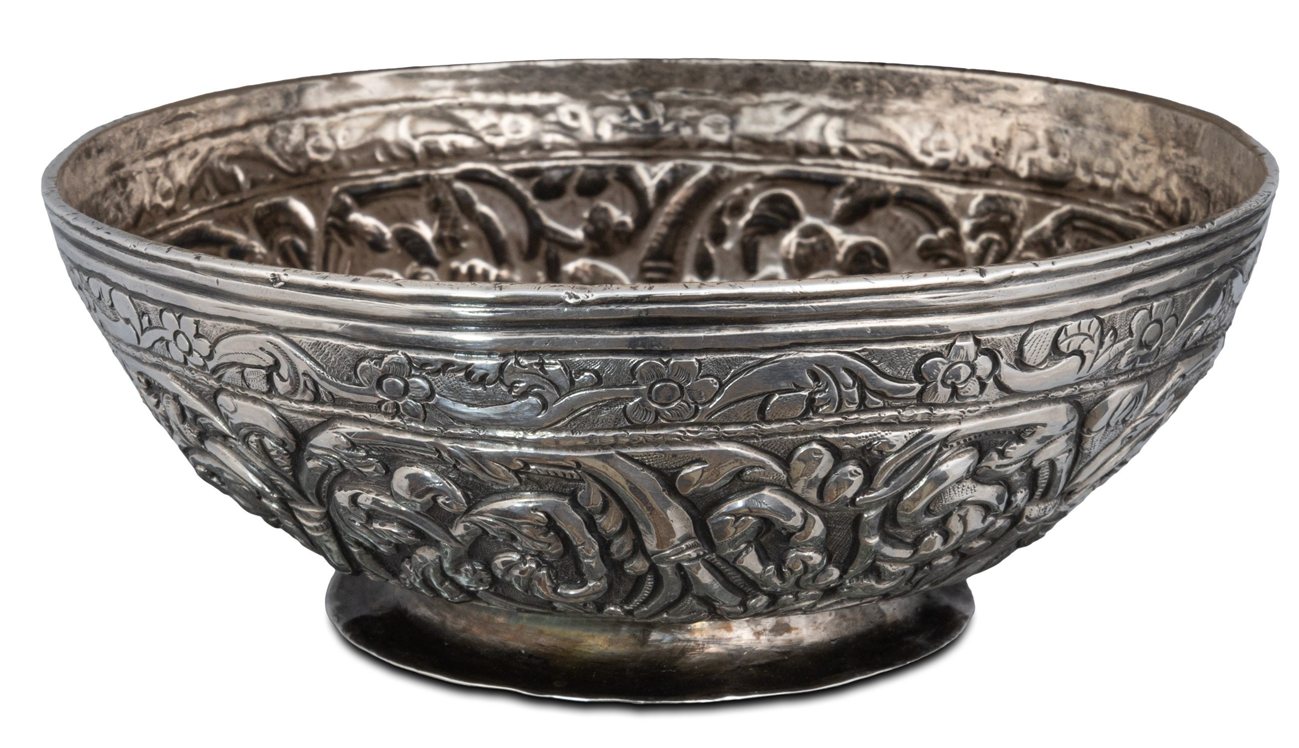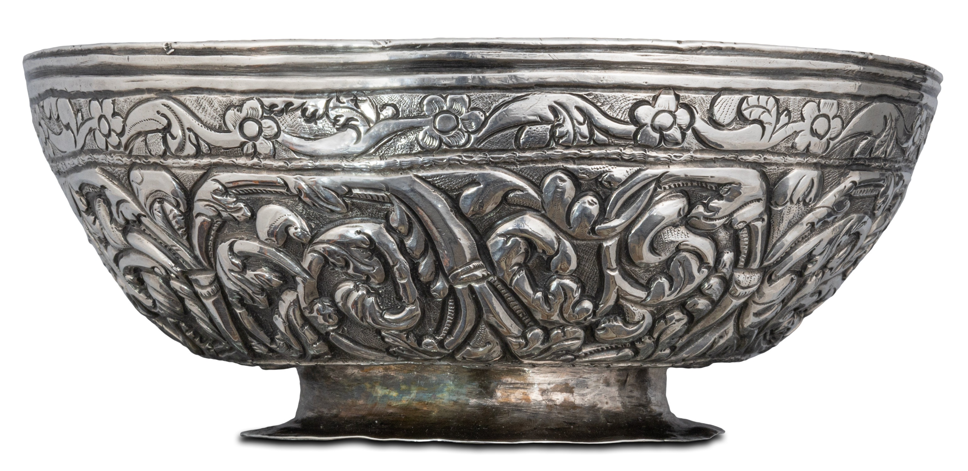 Τιμή εκτίμησης: € 6.000 - 8.000Στην εξωτερική πλευρά περίτεχνος σφυρήλατος διάκοσμος με άνθινα μοτίβα και σχηματοποιημένα κέρατα της Αμάλθειας. Λίγα χρόνια αργότερα, το 1797, προστέθηκε και η ασημένια βάση (πατούρα) του αγγείου με εγχάρακτη τη χρονολογία τοποθέτησής της. Στη βάση επιγραφή «ΧΑΤΖΗΠΕΤΡΙC ΓΙ ΙΑCΗ 1782». Η συλλαβή Γ Ι είναι τα δύο πρώτα γράμματα του ονόματος ΓΙΩΡΓΟΣ, ενώ η λέξη ΙΑCΗ αναφέρεται προφανώς στο Ιάσιο (Iași), πόλη της Ρουμανίας.