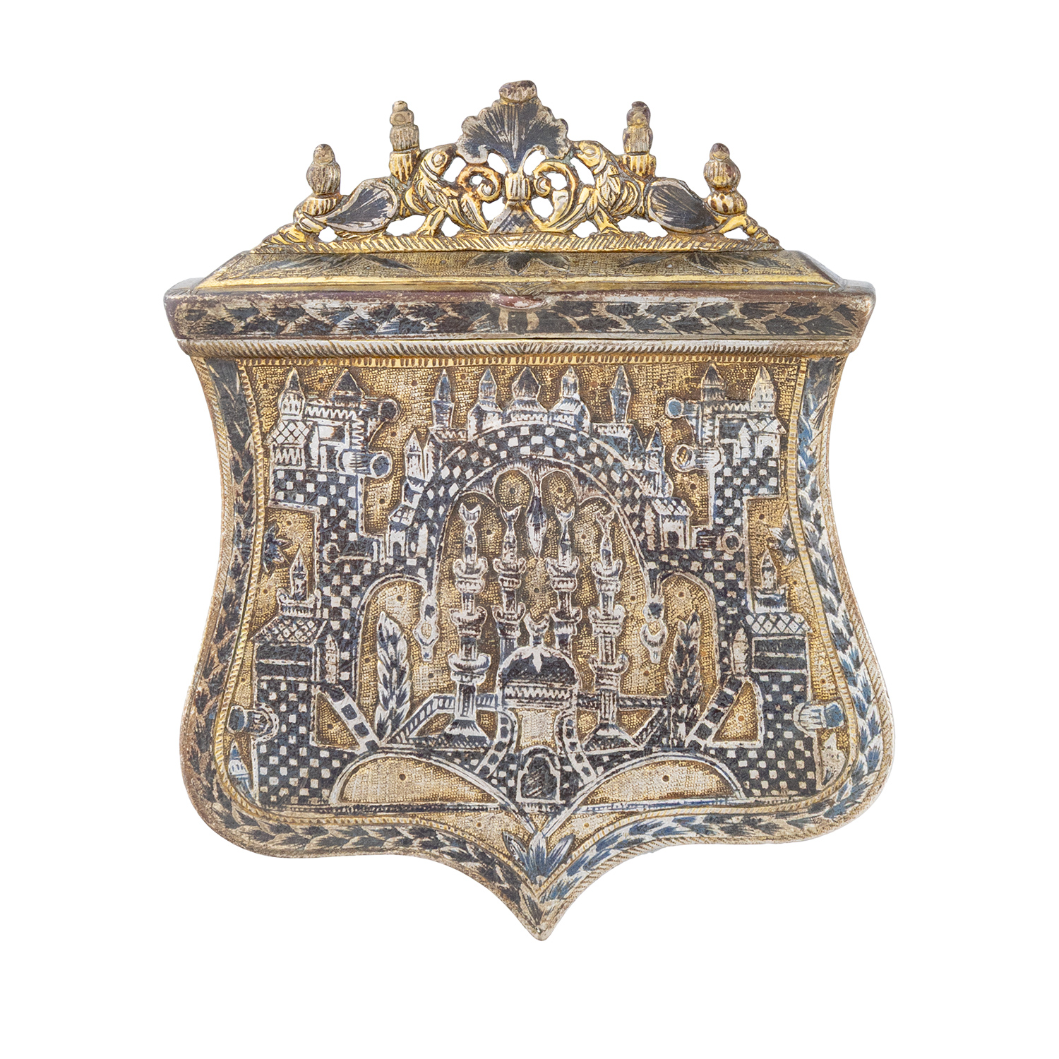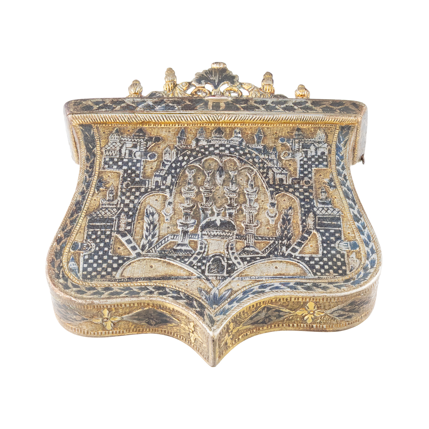 Τιμή εκτίμησης: € 2.000 - 3.000Επιπεδόγλυφος διάκοσμος με σαβάτι. Απεικονίζεται μεγάλη οθωμανική πόλη με τεμένη. Στις τέσσερις πλευρές του τείχους ορθώνονται πύργοι με πυροβολεία.