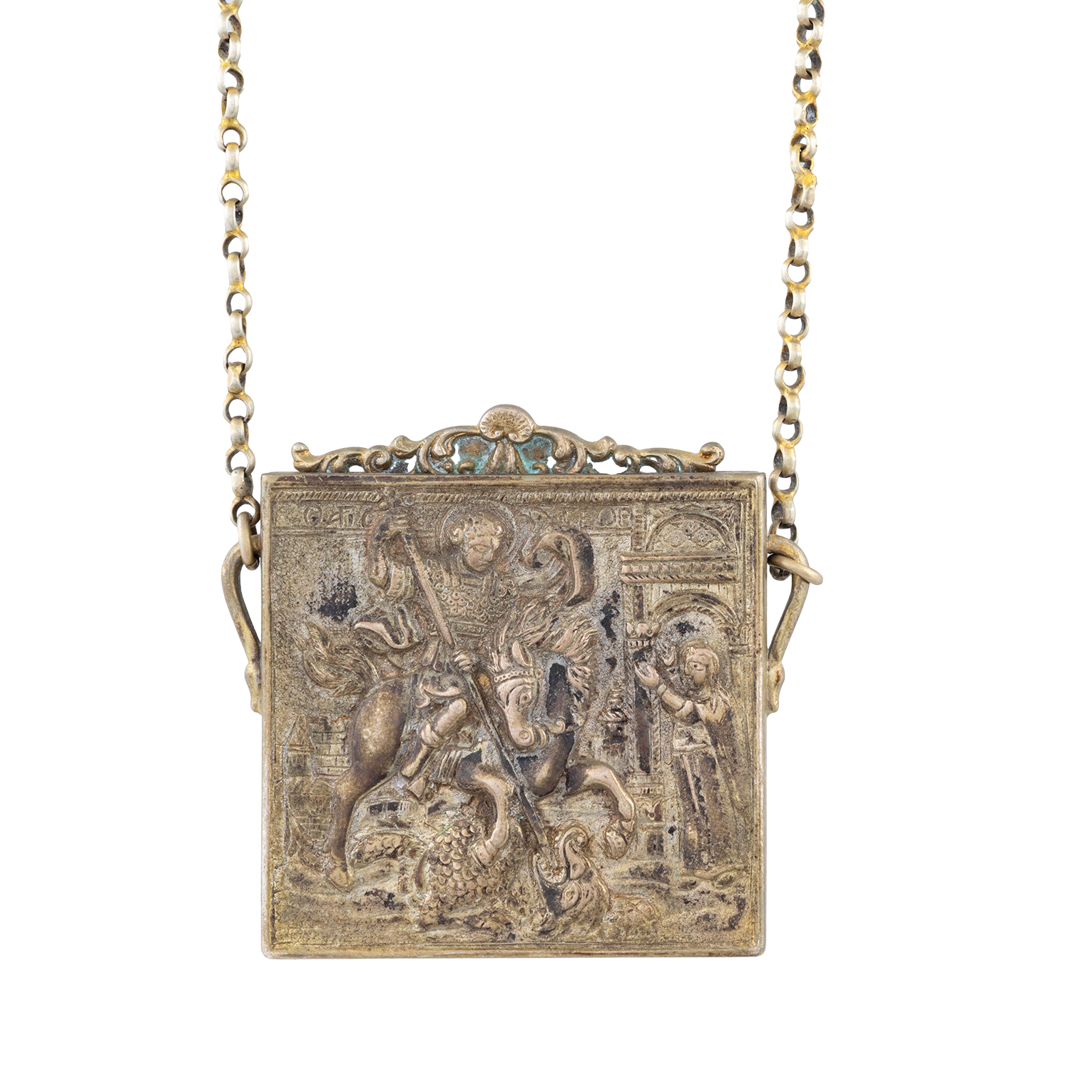 Τιμή εκτίμησης: € 1.600 - 2.000Χυτός, σκαλιστός, φουσκωτός, εγχάρακτος διάκοσμος. Στη μία όψη ο Άγιος Γεώργιος λογχίζει τον δράκο μπροστά στα μάτια της βασιλοπούλας που κατά την παράδοση απελευθέρωσε ο Άγιος. Στο βάθος παράσταση πόλης. Η άλλη όψη μερικώς επιχρυσωμένη με εγχάρακτους σταυρούς.