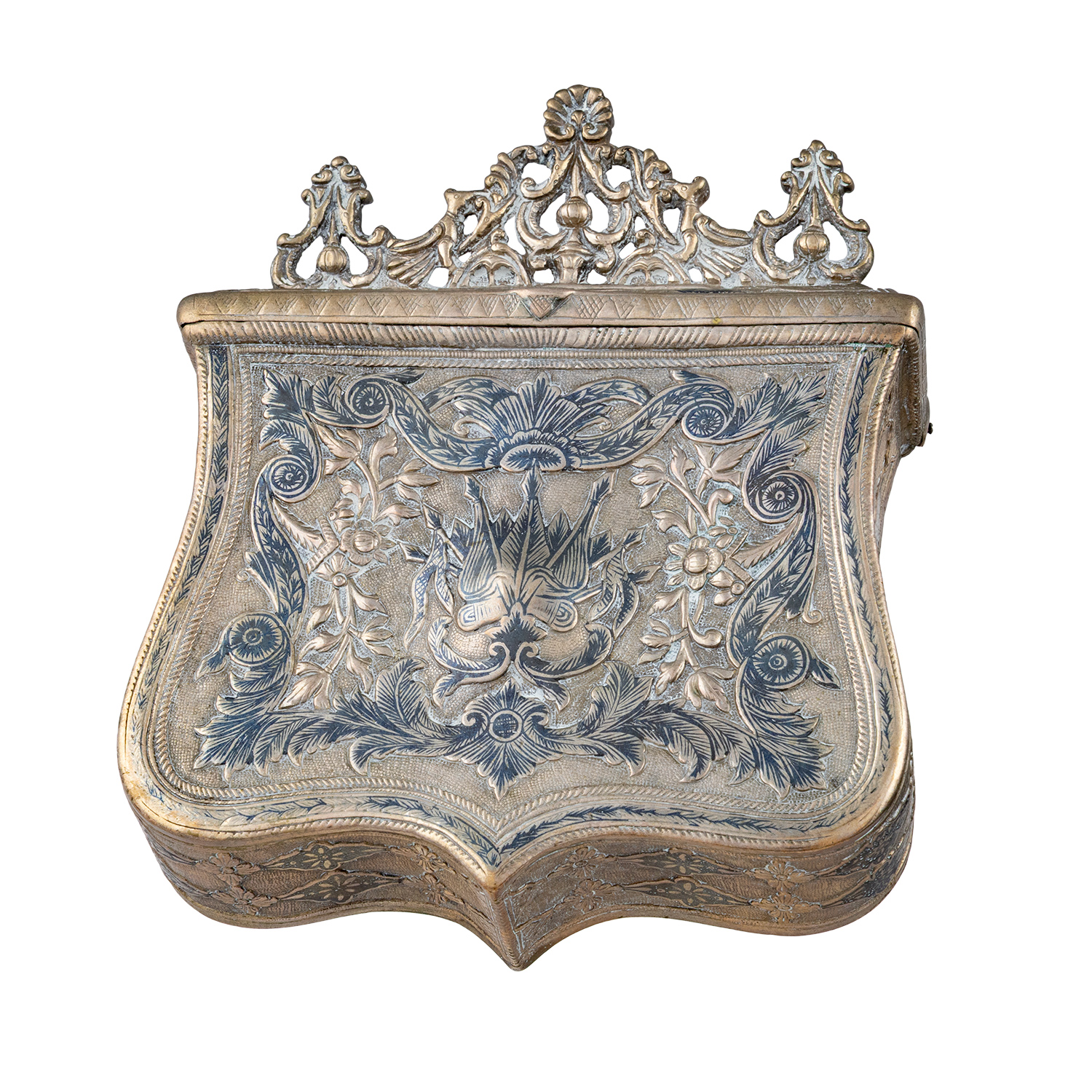 Τιμή εκτίμησης: € 2.000 - 3.000Έκτυπος καλεμιστός διάκοσμος με λάβαρα ως κεντρικό θέμα, περιβάλλεται από σαβατλίδικες γιρλάντες. Χαρακτηριστικό δείγμα της επίδρασης του μπαρόκ στα ηπειρώτικα εργαστήρια. Επίστεψη χυτή, διάτρητη με άνθινα, αχιβαδωτά μοτίβα και πουλιά.