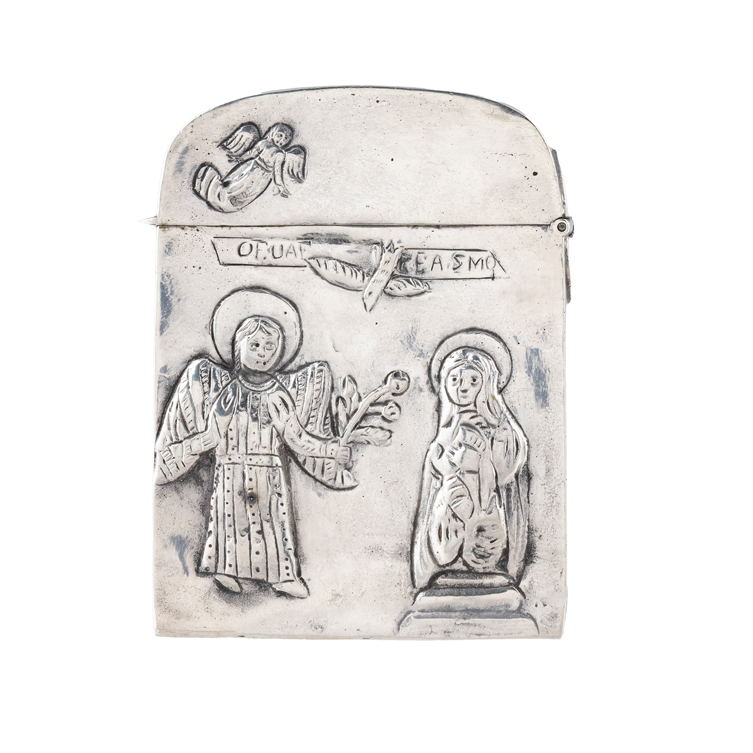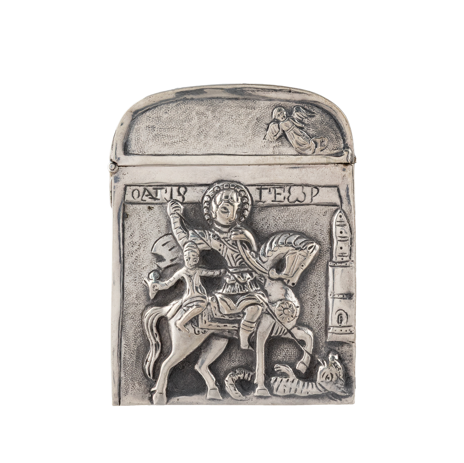 Τιμή εκτίμησης: € 2.200 - 2.600Χυτός, σκαλιστός, φουσκωτός, εγχάρακτος διάκοσμος. Στη μία όψη ο Άγιος Γεώργιος λογχίζει τον δράκο. Στα καπούλια του αλόγου κρατώντας οινοχόη είναι καθισμένος ο μικρός σκλάβος τον οποίο, σύμφωνα με την παράδοση, απελευθέρωσε ο Άγιος την ώρα που κερνούσε κρασί τον Tούρκο αφέντη του. Στην άλλη όψη ο Ευαγγελισμός της Θεοτόκου.