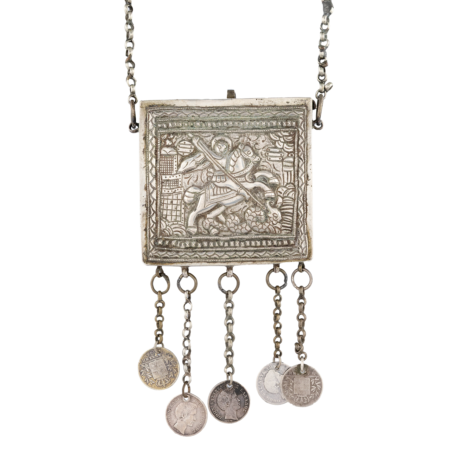 Τιμή εκτίμησης: € 2.400 - 2.600Στην εμπρόσθια όψη περίτεχνος σφυρήλατος διάκοσμος με παράσταση του έφιππου Αγίου Γεωργίου να λογχίζει τον δράκο. Στην πίσω πλευρά αποτροπαϊκή εξάλφα. Φέρει πέντε κρεμασίδια με οθωνικά νομίσματα της μισής δραχμής των ετών 1833-34.