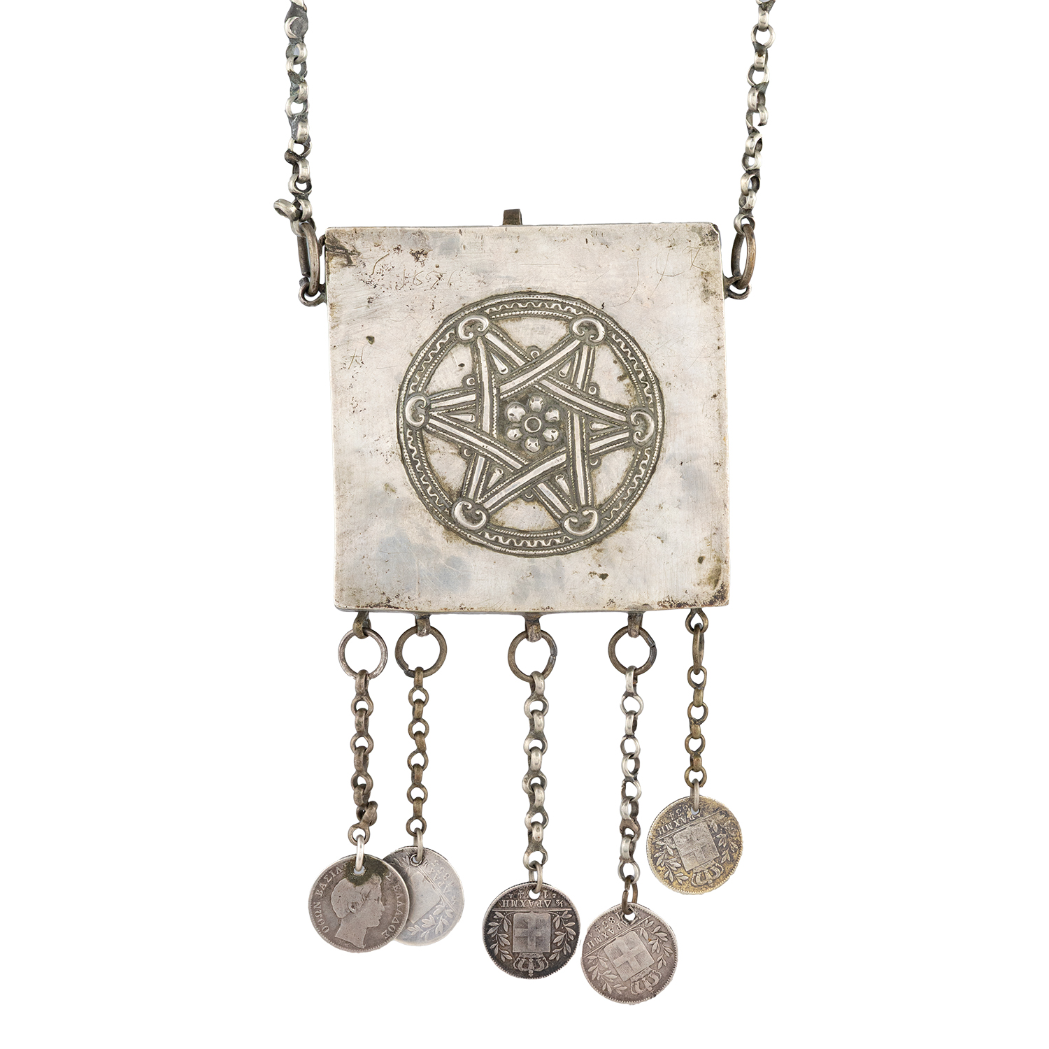 Ασημένιο φυλακτό (χαϊμαλί) με αλυσίδα ( Ήπειρος, μέσα 19ου αιώνα).