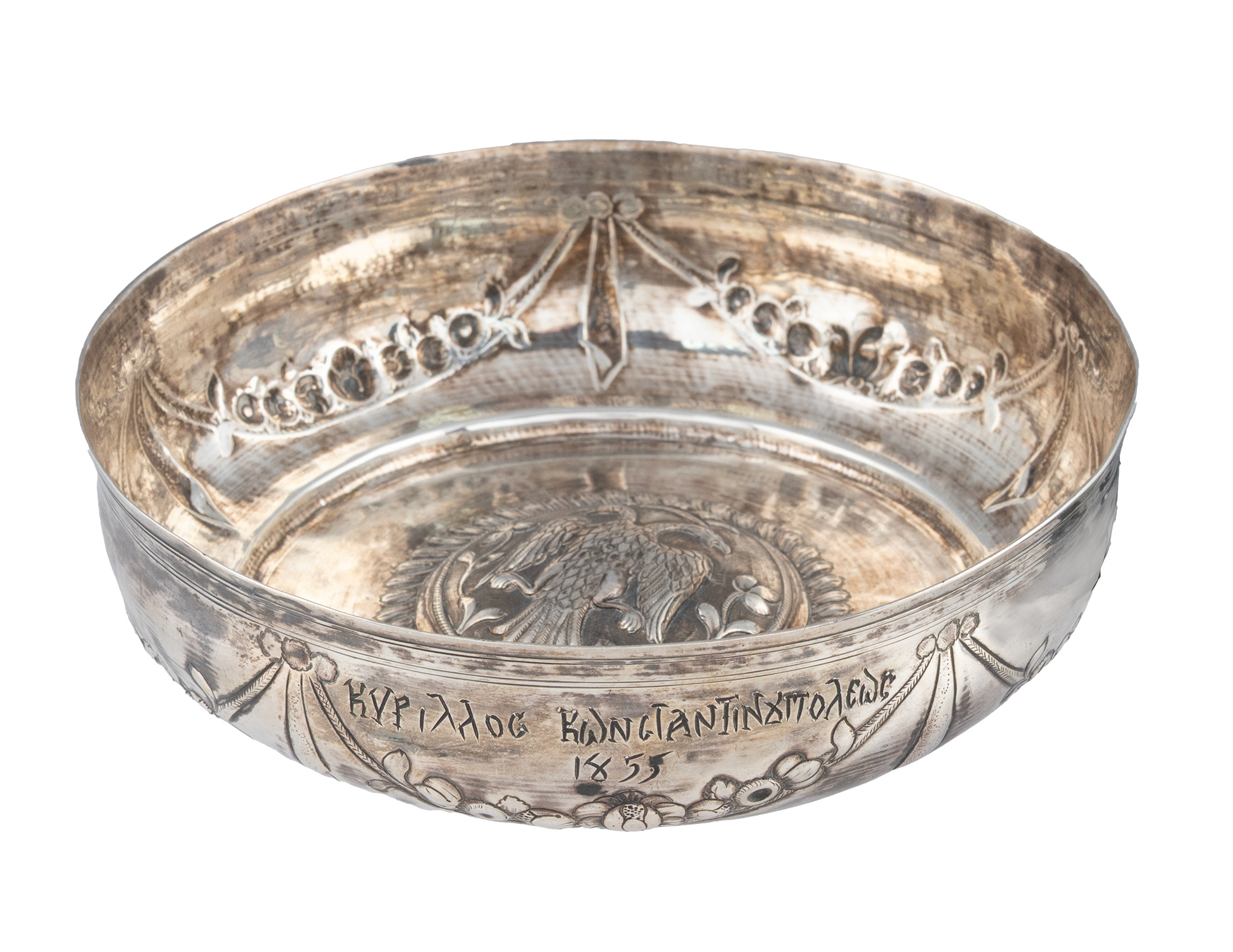Τιμή εκτίμησης: € 3.000 - 4.000Σφυρήλατος, σκαλιστός διάκοσμος. Παράσταση δικέφαλου αετού με κορώνα στον ομφαλό, σύμβολο του Οικουμενικού Πατριαρχείου και της Ορθόδοξης Εκκλησίας. Στο χείλος αναπτύσσονται άνθινα μοτίβα, ενώ στο εξωτερικό τοίχωμα φέρει περιμετρικά γιρλάντες με άνθινες συνθέσεις και την εγχάρακτη επιγραφή «ΚΥΡΙλλοCKωnCΤΑΝΤΙΝΟΥΠΟλεωC1855¨.