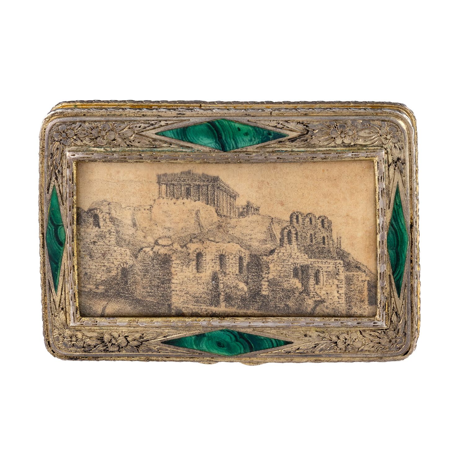 Τιμή εκτίμησης: € 6.000 - 8.000Στην εμπρόσθια όψη άποψη του Παρθενώνα προστατευμένη από ορεία κρύσταλλο. Περιμετρικά σφυρήλατα άνθη με ρόμβους μαλαχίτη. Στην πίσω πλευρά σκαλιστά και εγχάρακτα ανθέμια. Στο εσωτερικό του καπακιού επιγραφή «ΜΟΣΧΑ 1828 Δαπάνη Ζωσιμαίας αδελφότητος εις τον ΥΨΗΛΟΤΑΤΟΝ ΚΑΙ ΘΕΟΣΕΒΕΣΤΑΤΟΝ ΚΟΜΗ Ι.Α. ΚΑΠΟΔΙΣΤΡΙΑ».
