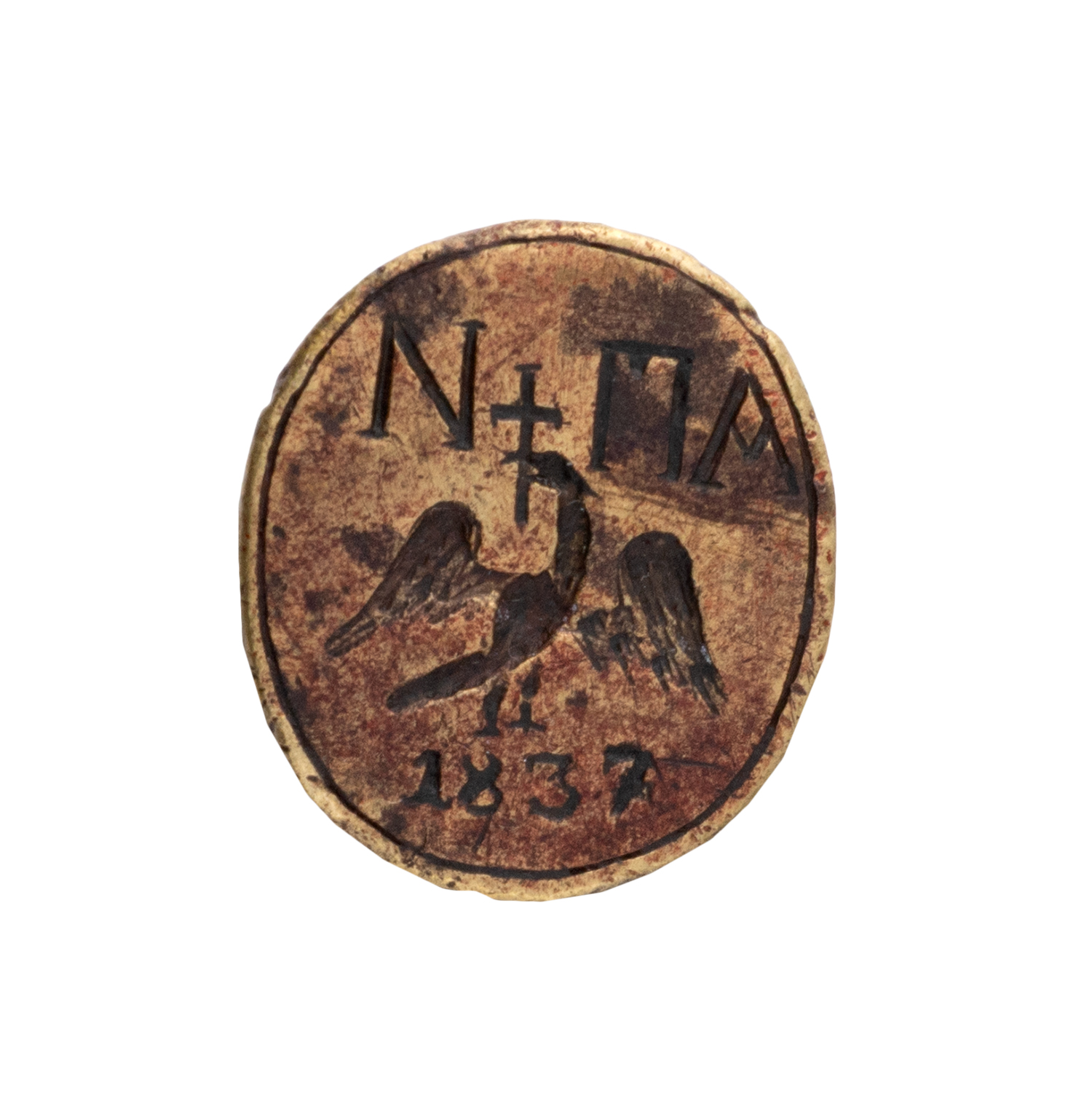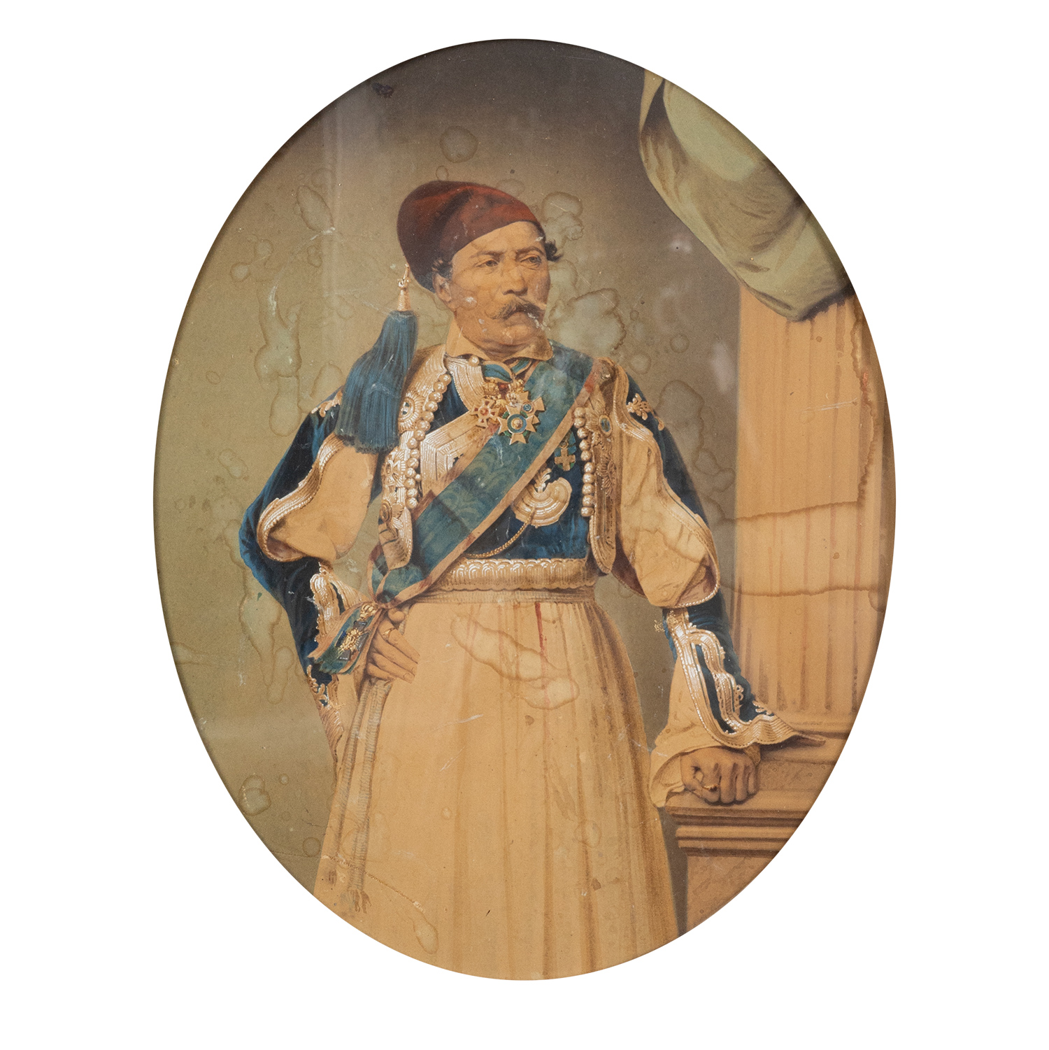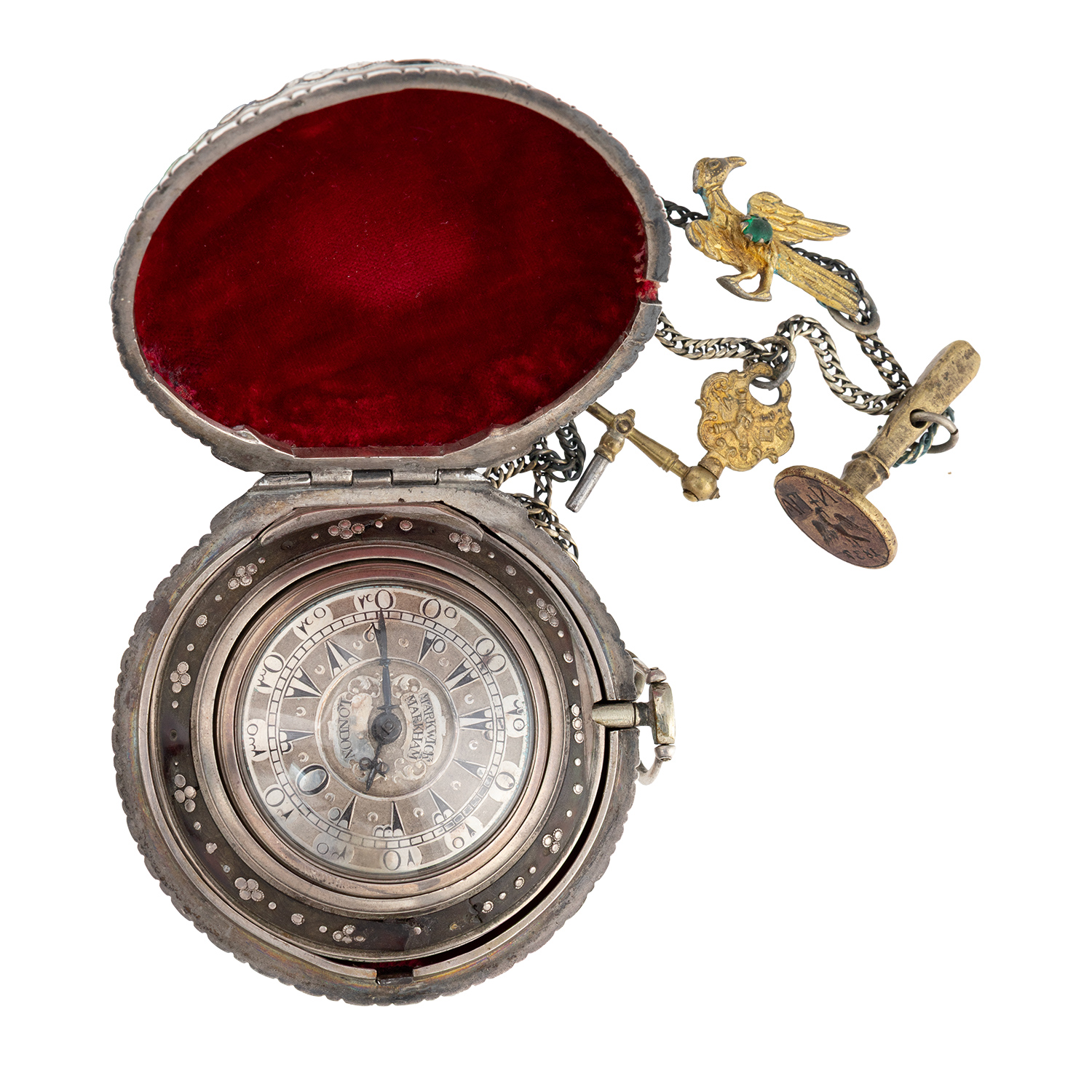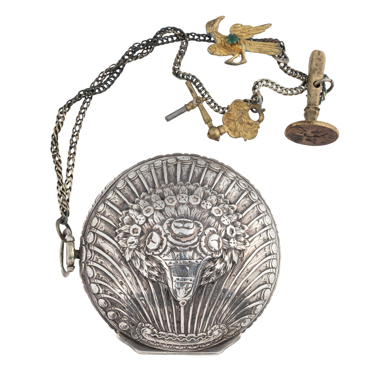 Τιμή εκτίμησης: € 4.000 - 6.000Ασημένια θήκη σε σχήμα αχιβάδας με παράσταση βάζου με άνθη στο κέντρο. Φέρει το κλειδί του και αλυσίδα που καταλήγει σε πτηνόμορφο άγκιστρο και σφραγίδα με τα αρχικά του ιδιοκτήτη ΠΑ+Ν, αετό με σταυρό στο ράμφος και ημερομηνία 1837. Το ρολόι έχει κατασκευαστεί στις αρχές του 19ου αιώνα στο Λονδίνο από τον φημισμένο οίκο κατασκευής ρολογιών Markwick Markham ειδικά για την οθωμανική αγορά.