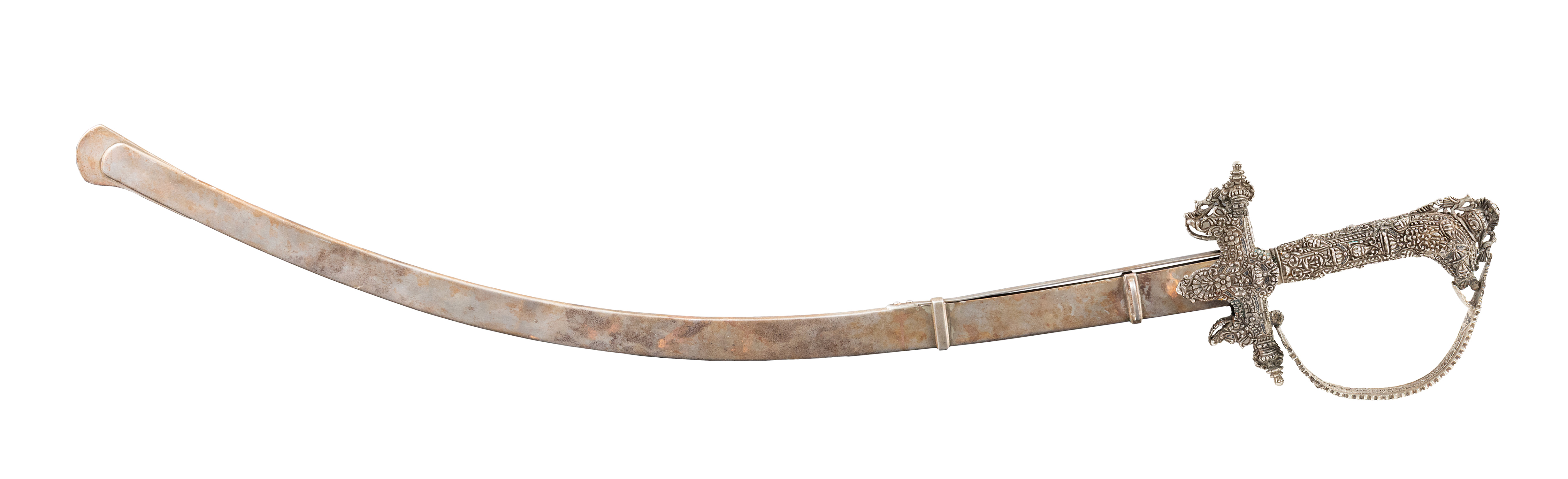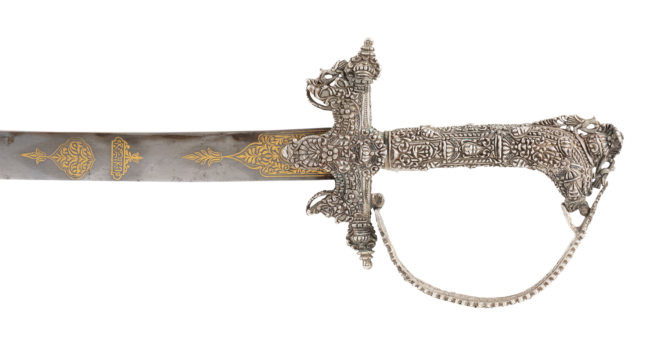 Τιμή εκτίμησης: € 4.000 - 6.000Στη λαβή περίτεχνος, πυκνός, έξεργος, σκαλιστός διάκοσμος με φυτικά και μπαρόκ μοτίβα που συμπληρώνεται με ολόσωμα πτηνά και δρακοκεφαλές. Η οθωμανική λάμα από ατσάλι με χρυσά διακοσμητικά μοτίβα και επιγραφή στα οθωμανικά τουρκικά, πιθανόν με ψαλμό από το Κοράνι.