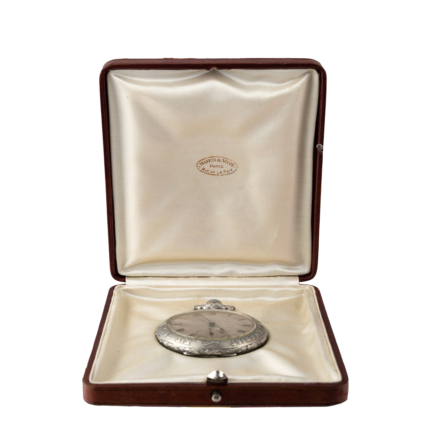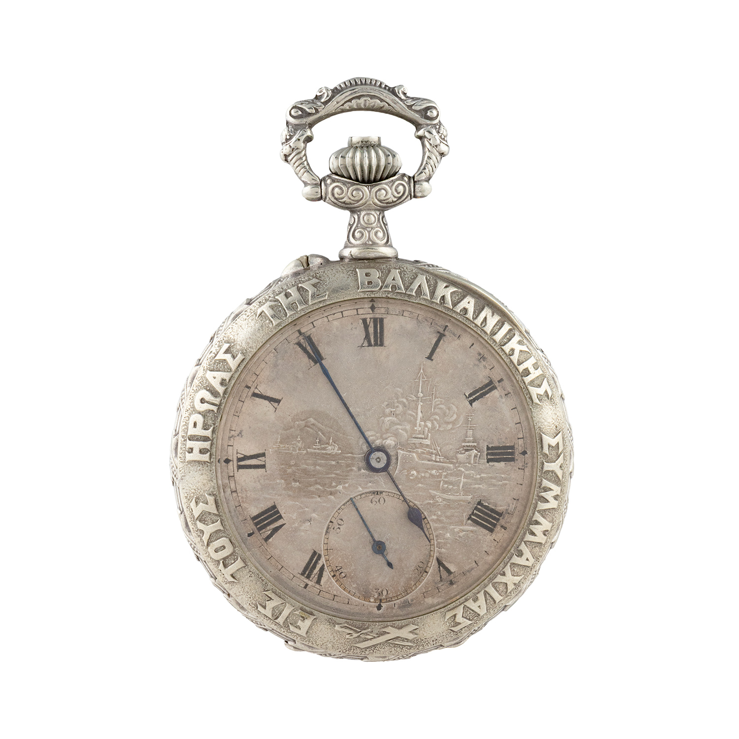Τιμή εκτίμησης: € 2.000 - 3.000Στην εμπρόσθια όψη φέρει παράσταση από τη ναυμαχία της Έλλης με το θωρηκτό Αβέρωφ και περιμετρική επιγραφή «ΕΙΣ ΤΟΥΣ ΗΡΩΑΣ ΤΗΣ ΒΑΛΚΑΝΙΚΗΣ ΣΥΜΜΑΧΙΑΣ». Στο οπίσθιο τμήμα φέρει έξεργη παράσταση εφόδου των συμμαχικών στρατευμάτων με φόντο την Αγία Σοφία και ημερομηνία 1912-1913. Εσωτερικά φέρει το βασιλικό χρυσό έμβλημα και στο καπάκι του μηχανισμού τα πορτραίτα των τεσσάρων συμμάχων βασιλέων, της Ελλάδος Γεωργίου Α´, της Σερβίας Πέτρου Α', της Βουλγαρίας Φερδινάνδου Α´ και του Μαυροβουνίου Νικόλαου Α´ με την επιγραφή «L' UNION FAIT LA FORCE» (Η Ισχύς εν τη Ενώσει). Το κουτί του είναι επενδυμένο με κόκκινο μαροκινό δέρμα. Εξωτερικά φέρει εστεμμένο βασιλικό μονόγραμμα και εσωτερικά επένδυση από λευκό μετάξι με την φίρμα «Mappin & Webb Paris- Rue De la Paix». Σε άριστη λειτουργική κατάσταση.