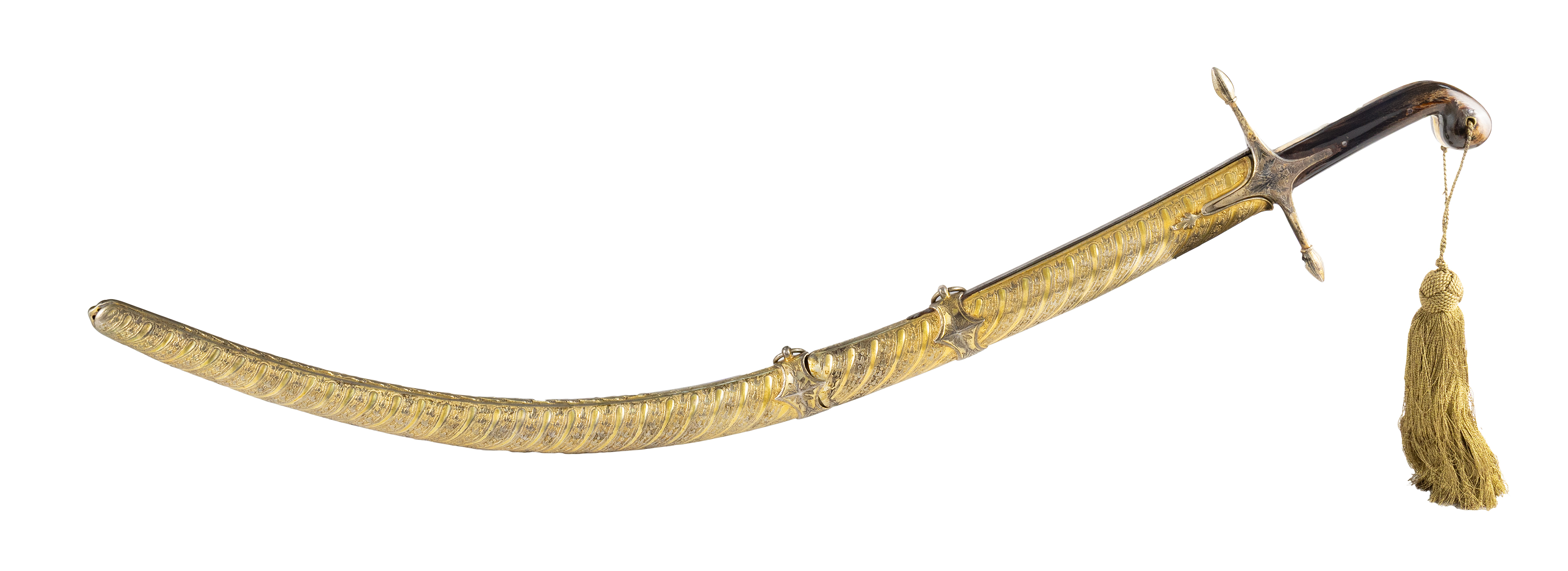 Τιμή εκτίμησης: € 8.000 - 12.000Στη θήκη περίτεχνος, πυκνός, σκαλιστός διάκοσμος με φυτικά μοτίβα. Η λαβή, από σκούρο κόκκαλο, καταλήγει σε σταυρόσχημο φυλακτήρα που φέρει παραστάσεις δικεφάλου αετού με στέμμα φιλοτεχνημένες με σαβάτι. Σε μικρή υποδοχή του φυλακτήρα ασφαλίζει η γλώσσα της θήκης.
