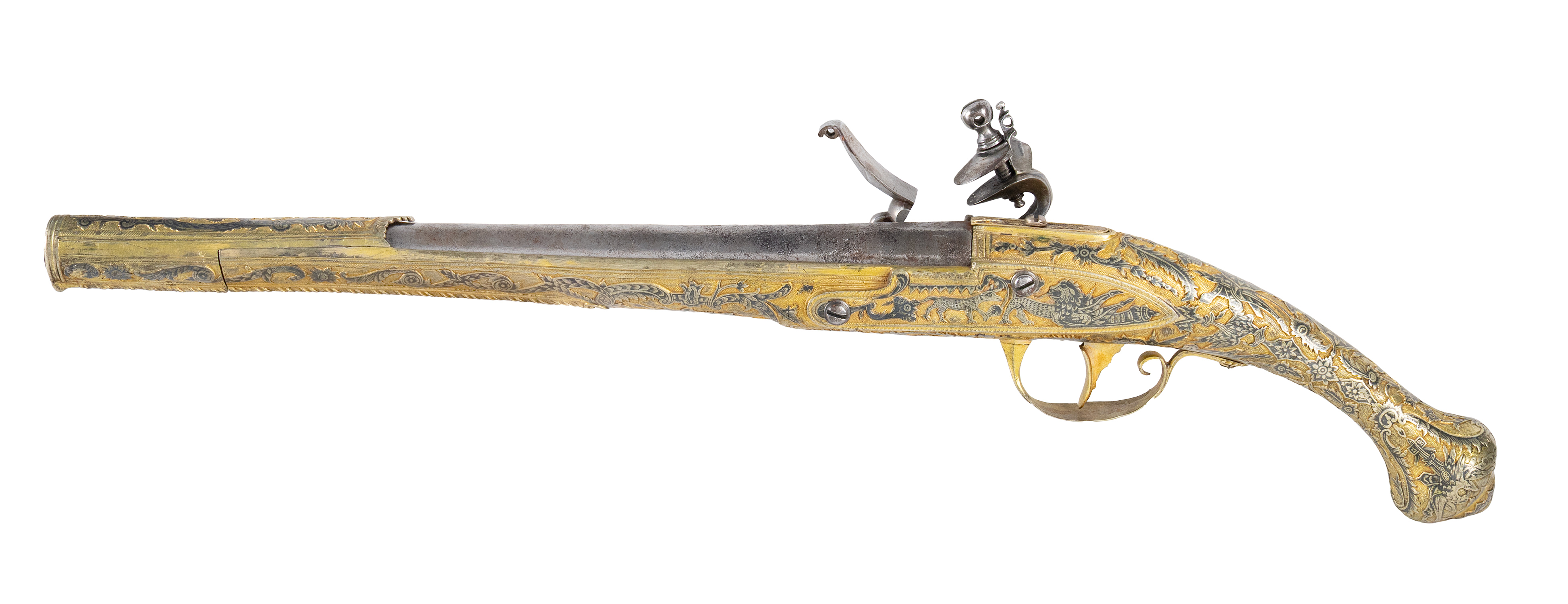 Τιμή εκτίμησης: € 3.000 - 4.000Την επιφάνεια διατρέχουν ταινίες από σαβάτι σε επίχρυσο στικτό βάθος που συνδυάζονται με τρόπαια, ανθοφόρα μοτίβα και λάβαρα. Στο πάνω μέρος της λαβής, αετοί πλαισιώνουν πολεμικά λάβαρα. Στη μία πλευρά του κορμού λιοντάρι και λέαινα από σαβάτι βαδίζουν πλάι σε πεσμένα εχθρικά λάβαρα. Πυροδοτικός μηχανισμός πυρόλιθου.