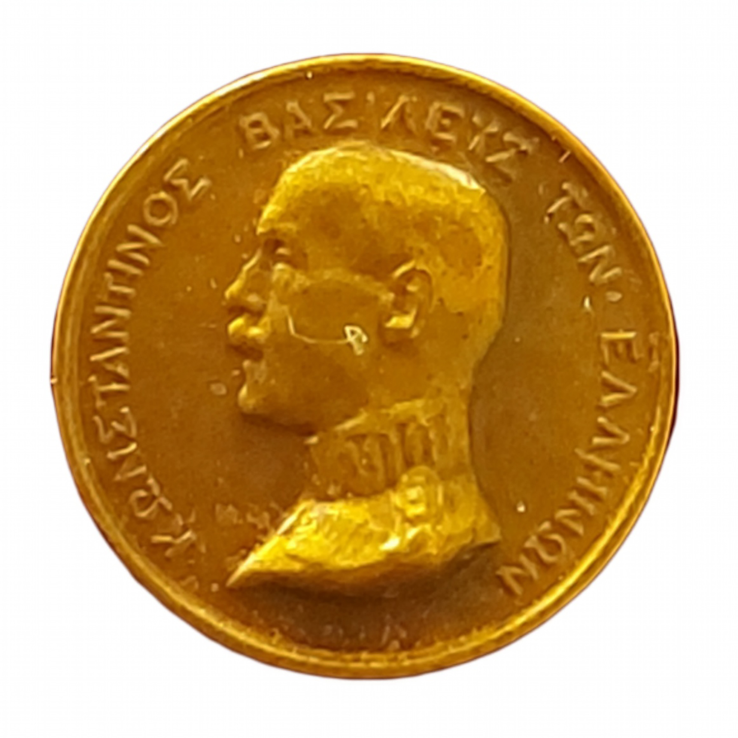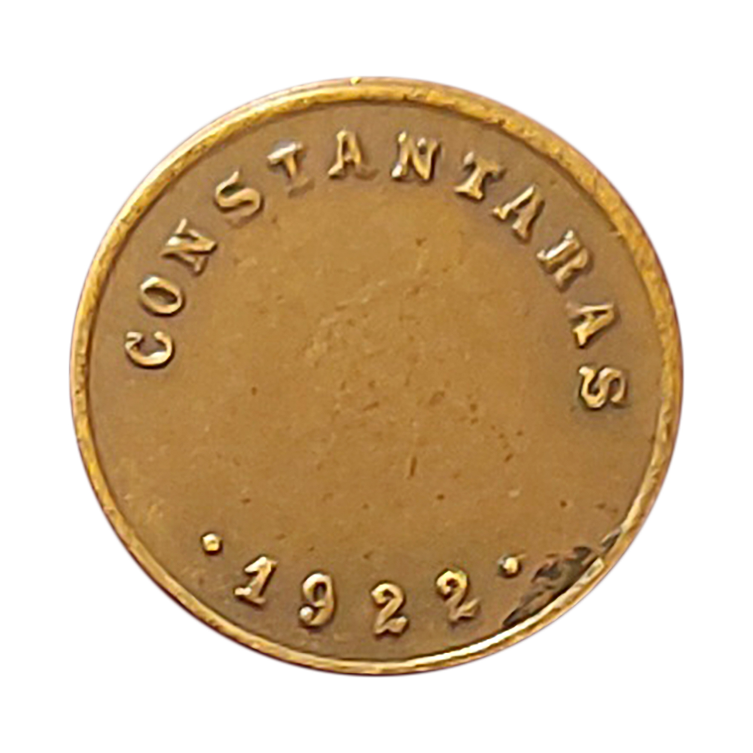 Τιμή εκτίμησης: € 1.000 - 1.500Κατασκευάστηκε το 1922 από το κοσμηματοπωλείο «Κωνσταντάρα», επίσημο προμηθευτή της βασιλικής αυλής, σε περιορισμένου αριθμού αναμνηστική κοπή. Στην εμπρόσθια όψη ο βασιλιάς Κωνσταντίνος Α´, όπως απεικονίζεται και στο μετάλλιο του Ελληνοβουλγαρικού Πολέμου του 1913. Στην άλλη όψη φέρει το όνομα Constantaras και χρονολογία 1922.