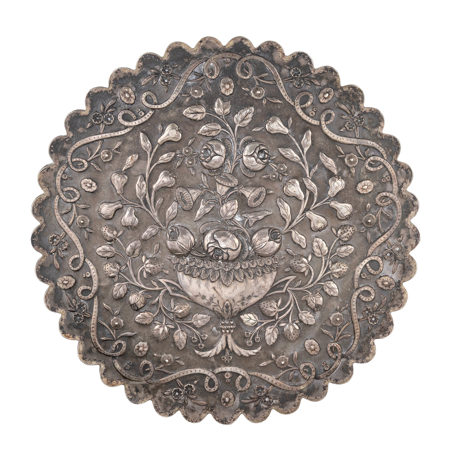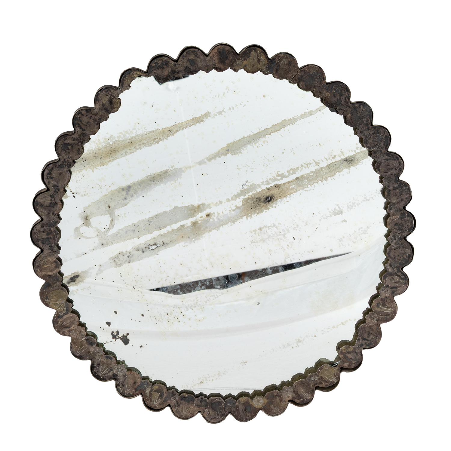 Στον ένα καθρέπτη πυκνός σφυρήλατος διάκοσμος με ανθοφόρο βάζο και στον άλλο πολύφυλλη άνθινη ροζέτα.
