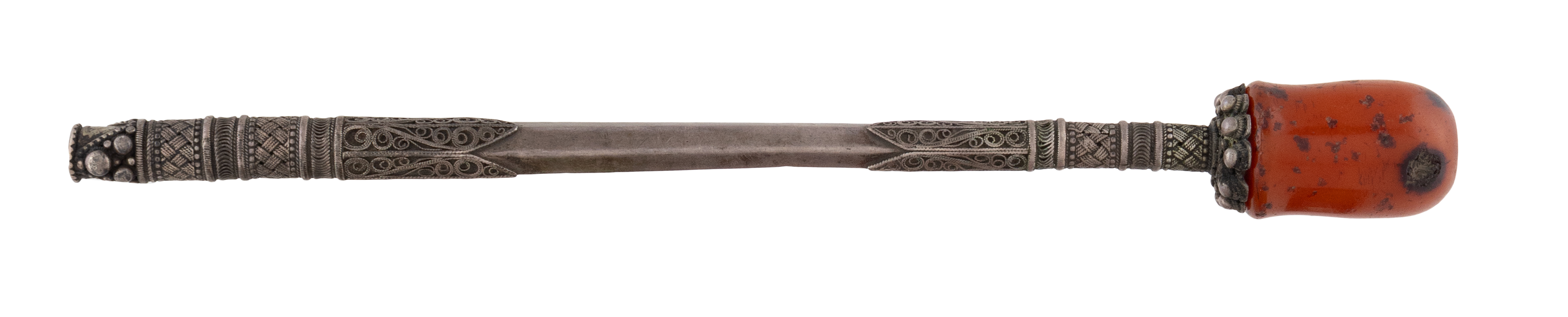 Στο στέλεχος συρματερή και κοκκιδωτή διακόσμηση αντίστοιχα. Τα επιστόμια από κεχριμπάρι.