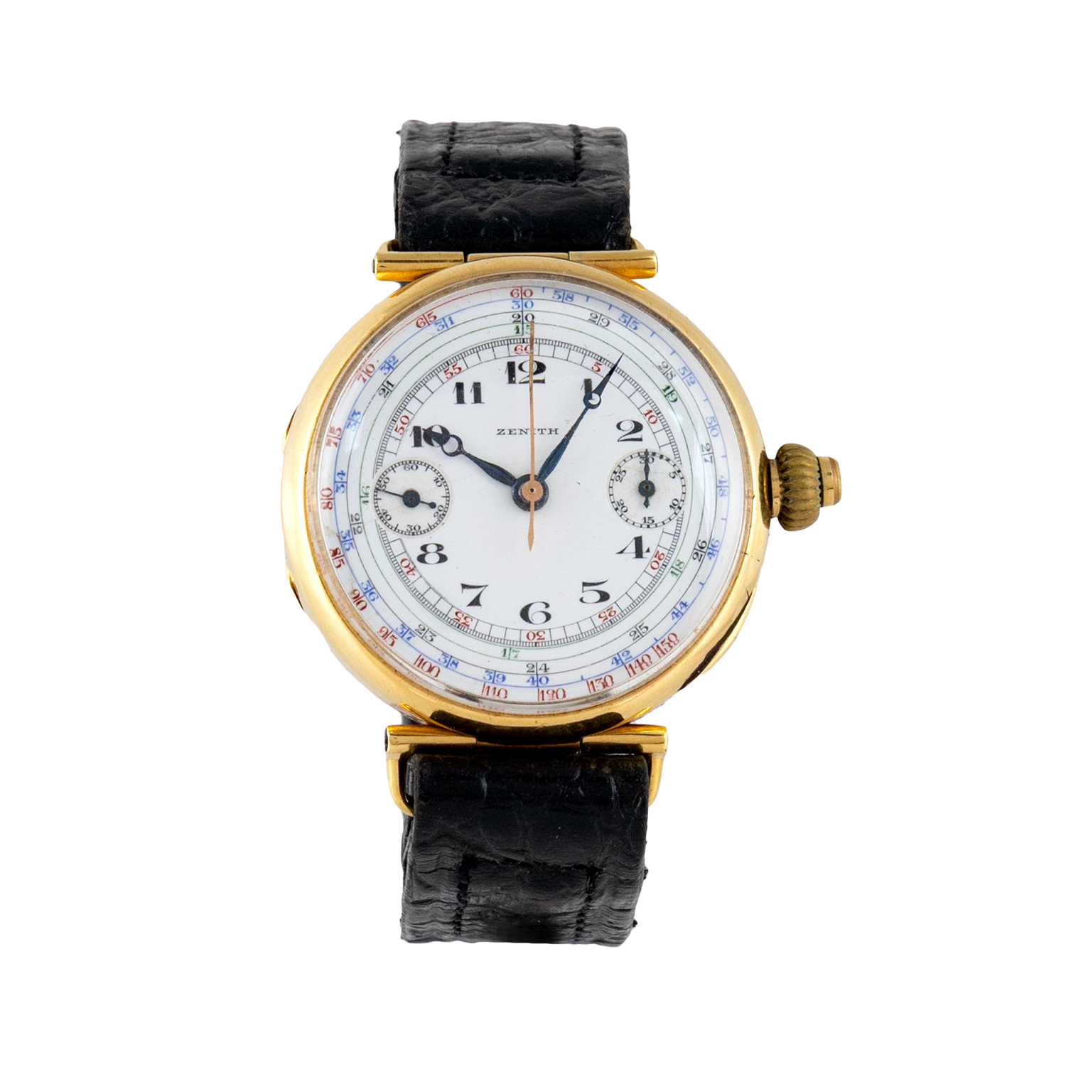 Τιμή εκτίμησης: € 10.000 - 15.000Ρολόι χρονογράφος της φημισμένης ελβετικής εταιρείας zenith κατασκευής 1920. Το υλικό της κάσας είναι χρυσός 18Κ. Καντράν από λευκό σμάλτο με αραβικούς αριθμούς, μαύρες ενδείξεις λεπτών και διάφορες κλίμακες. Διαθέτει δύο υποκαντράν στη θέση 3 (30λεπτο χρονογράφος) και στη θέση 9 (δευτερόλεπτα). Το ρολόι χρησιμοποιεί έναν ενιαίο οβάλ πιεστήρα στην κορώνα για την εκκίνηση, διακοπή και επαναφορά του χρονογράφου (λειτουργία monopusher). Στην πίσω πλευρά της κάσας εγχάρακτο στέμμα, το όνομα Αλέξανδρος και ημερομηνία 14.9.1920. Σε άριστη λειτουργική κατάσταση και στην αρχική του δερμάτινη θήκη από το κατάστημα A.Steger στη Ζυρίχη. Στην πίσω πλευρά της κάσας του ρολογιού της Ασπασίας Μάνου υπάρχει εγχάρακτο στέμμα, το όνομα Αλέξανδρος και χρονολογία 1915, πιθανόν δώρο του Αλέξανδρου τη χρονιά της γνωριμίας τους.
