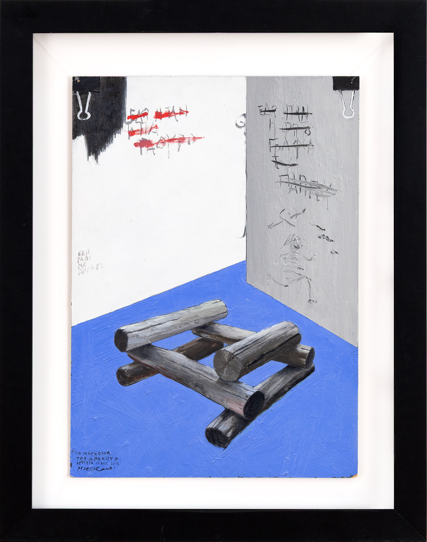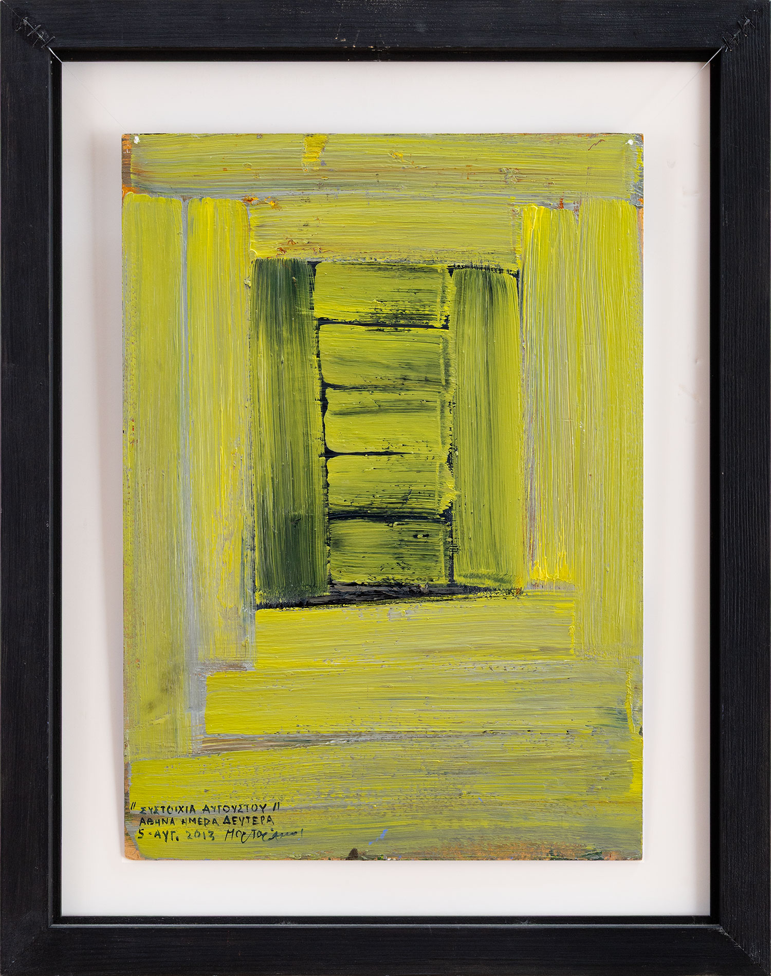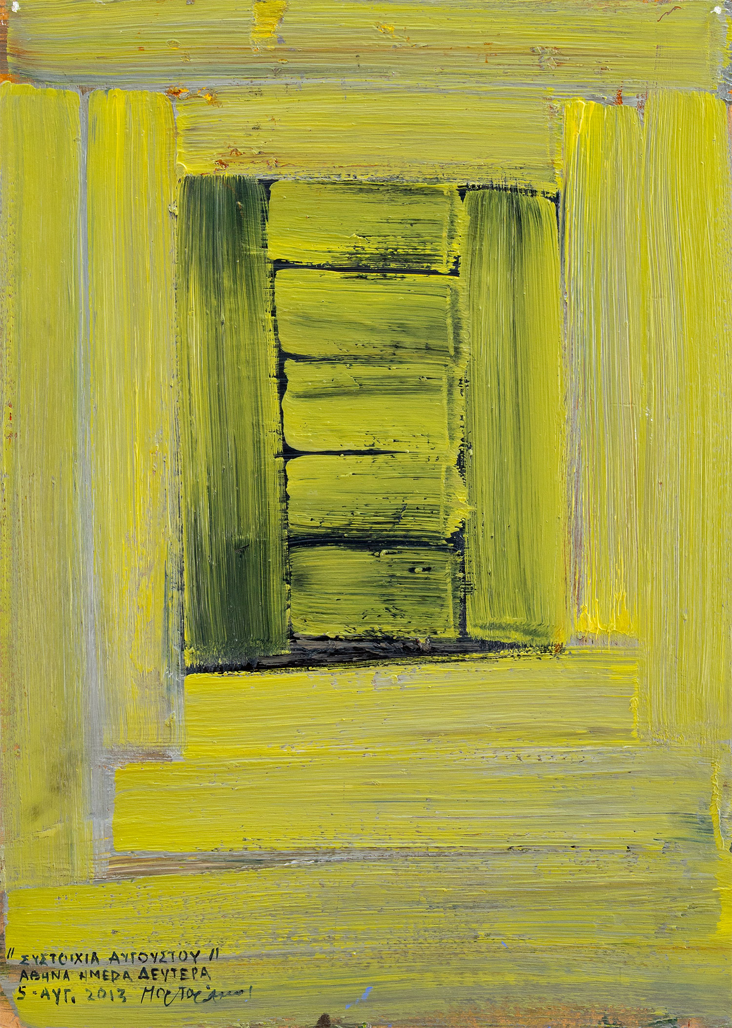 Στην πίσω όψη δεύτερο έργο με τίτλο: Συστυχία Αυγούστου, υπογεγραμμένο και χρονολογημένο κάτω αριστερά: 5 ΑΥΓ. 2013 Μορταράκος