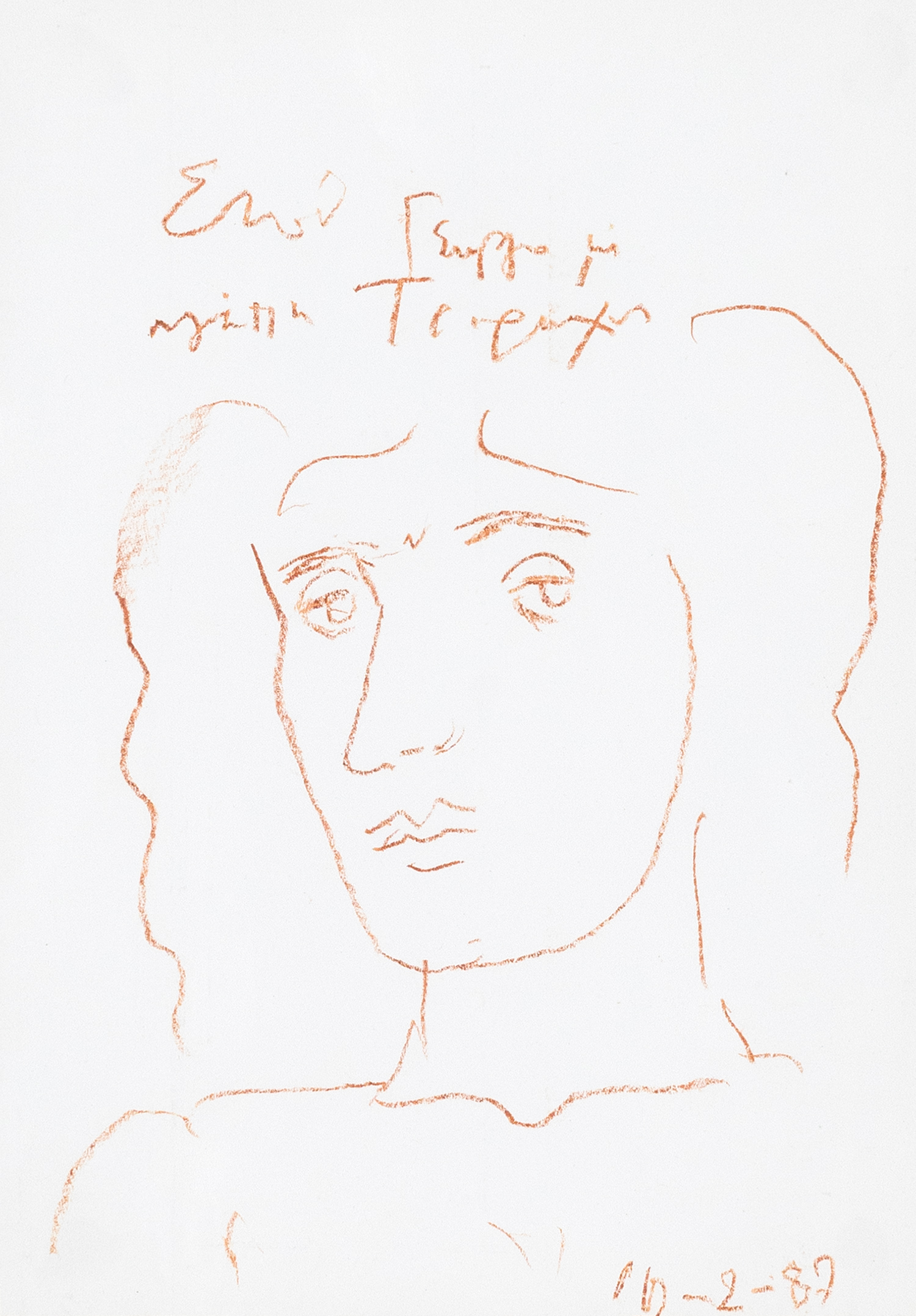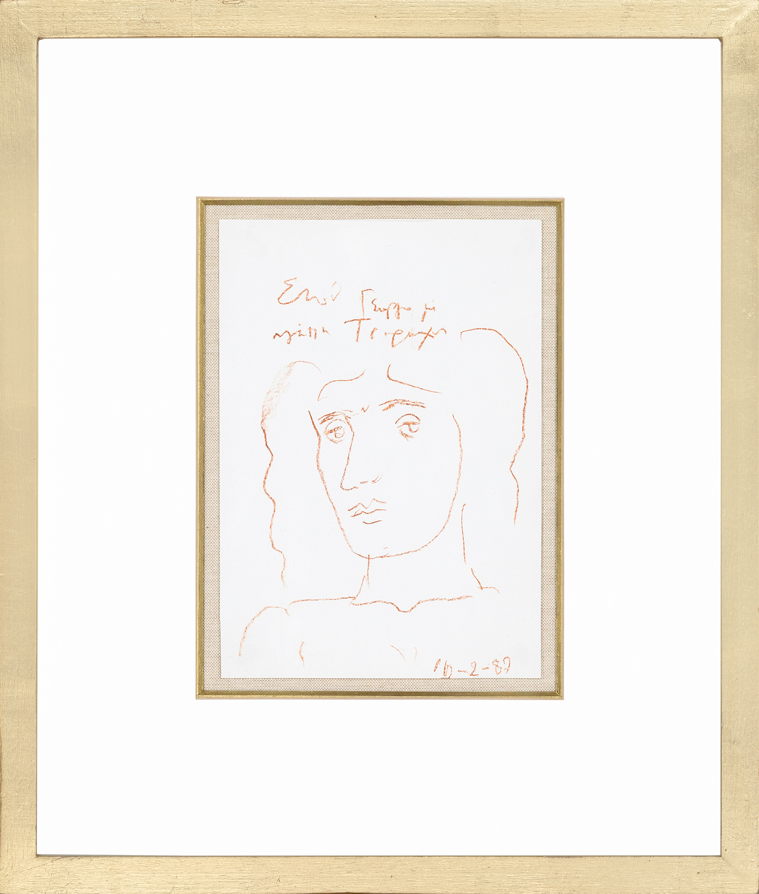 υπογεγραμμένο στο πάνω μέρος: Τσαρούχης και χρονολογημένο κάτω δεξιά: 10-2-1987 με αφιέρωση στο πάνω μέρος