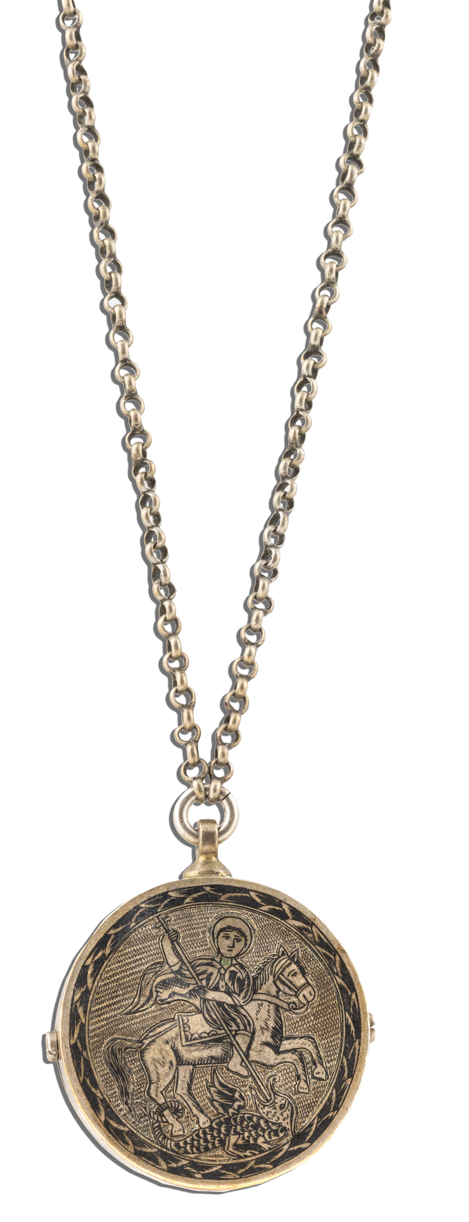 Στη μία όψη παράσταση του Αγίου Βασιλείου και στην άλλη του Αγίου Γεωργίου του Δρακοκτόνου εξαιρετικά φιλοτεχνημένες με σαβάτι. μήκος με αλυσίδα: 33 εκ.
