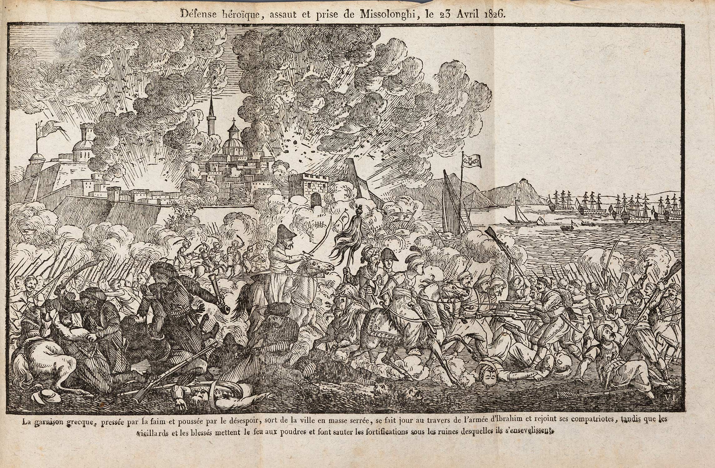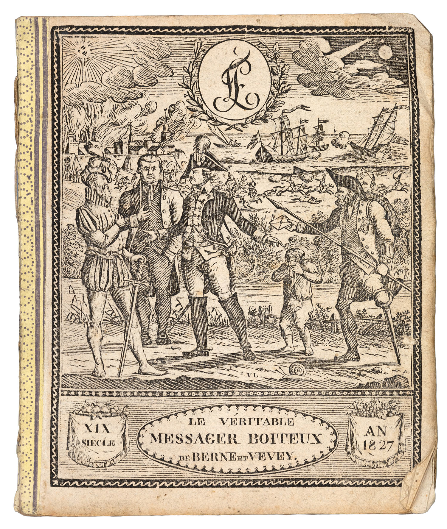 Τιμή εκτίμησης: € 200 - 300μικρό 4ο, [64] σ. Δίχρωμος και με ξυλόγραφη βινιέτα ο τίτλος στη σ. [9]. Με μία αναδιπλούμενη ξυλογραφία με θέμα την Έξοδο του Μεσολογγίου («Défence héroïque, assaut et prise de Missolonghi, le 23 Avril 1826») και ξυλογραφίες εντός κειμένου (3 ολοσέλιδες). Χωρίς ιδιαίτερα εξώφυλλα (με μορφή εξωφύλλων η πρώτη και η τελευταία σελίδα, με ολοσέλιδες ξυλογραφίες, η ένδειξη «Le véritable Messager Boiteux de Berne et Vevey» στο πάνω, ταινία χαρτιού στη ράχη). • Γίνεται εκτενής αναφορά στην πολιορκία του Μεσολογγίου (σ. 56-9), ενώ παρατίθενται επιγραμματικά γεγονότα των ετών 1821 και 1822.