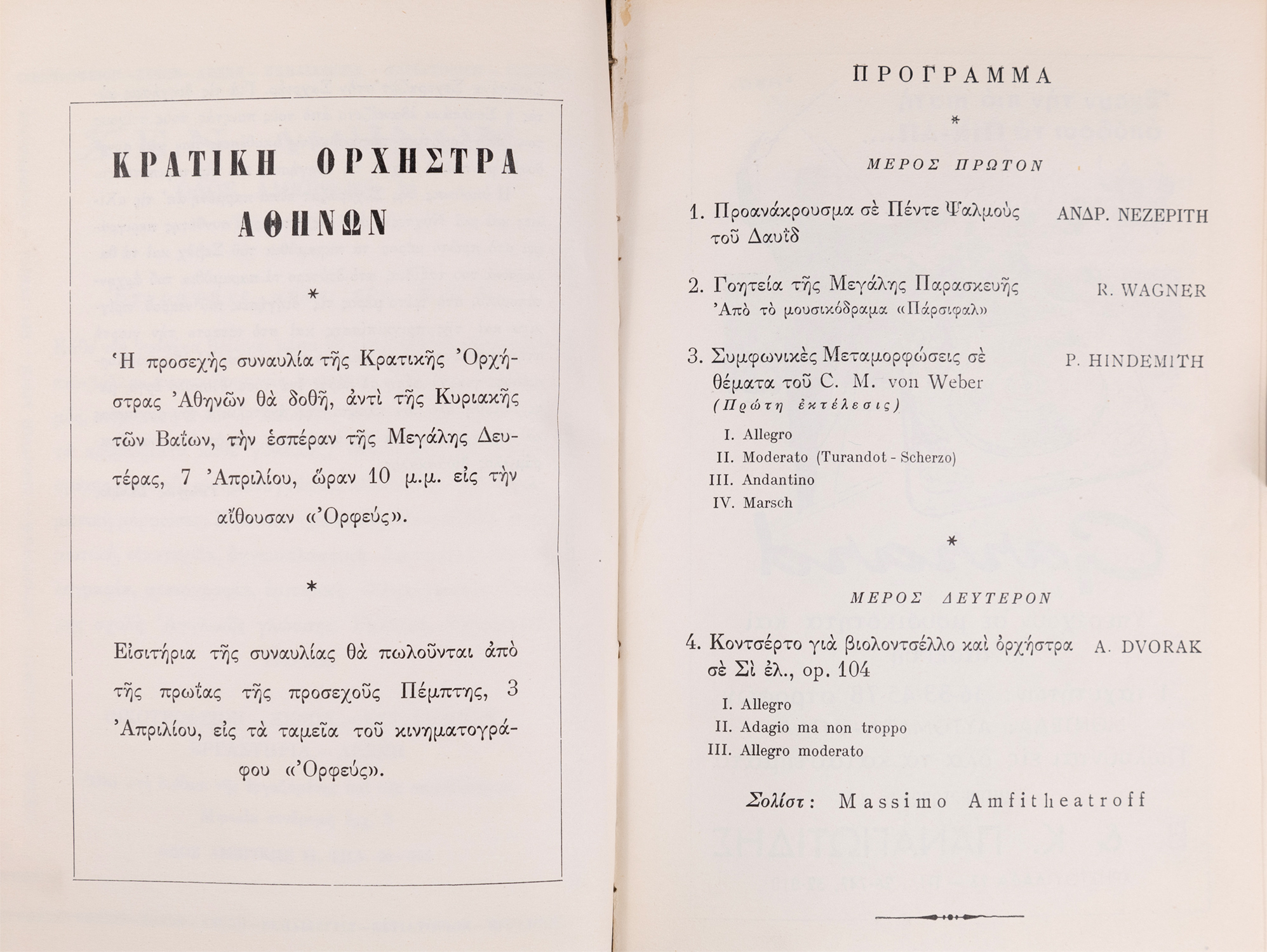 Τιμή εκτίμησης: € 150 - 20069 προγράμματα δεμένα σε 2 τόμους (30 του 1954 (στον πρώτο τόμο), 6 του 1955, 11 του 1957, 18 του 1958 και 8 του 1959), από [4]-[8] φ. έκαστο (λείπει το πρώτο φύλλο από ένα πρόγραμμα του 1958). Πανί (διαφορετικού χρώματος στον κάθε τόμο, δερμάτινη ετικέτα με τίτλο «ΚΡΑΤΙΚΑΙ ΣΥΝΑΥΛΙΑΙ» στη ράχη του δεύτερου τόμου). (2)