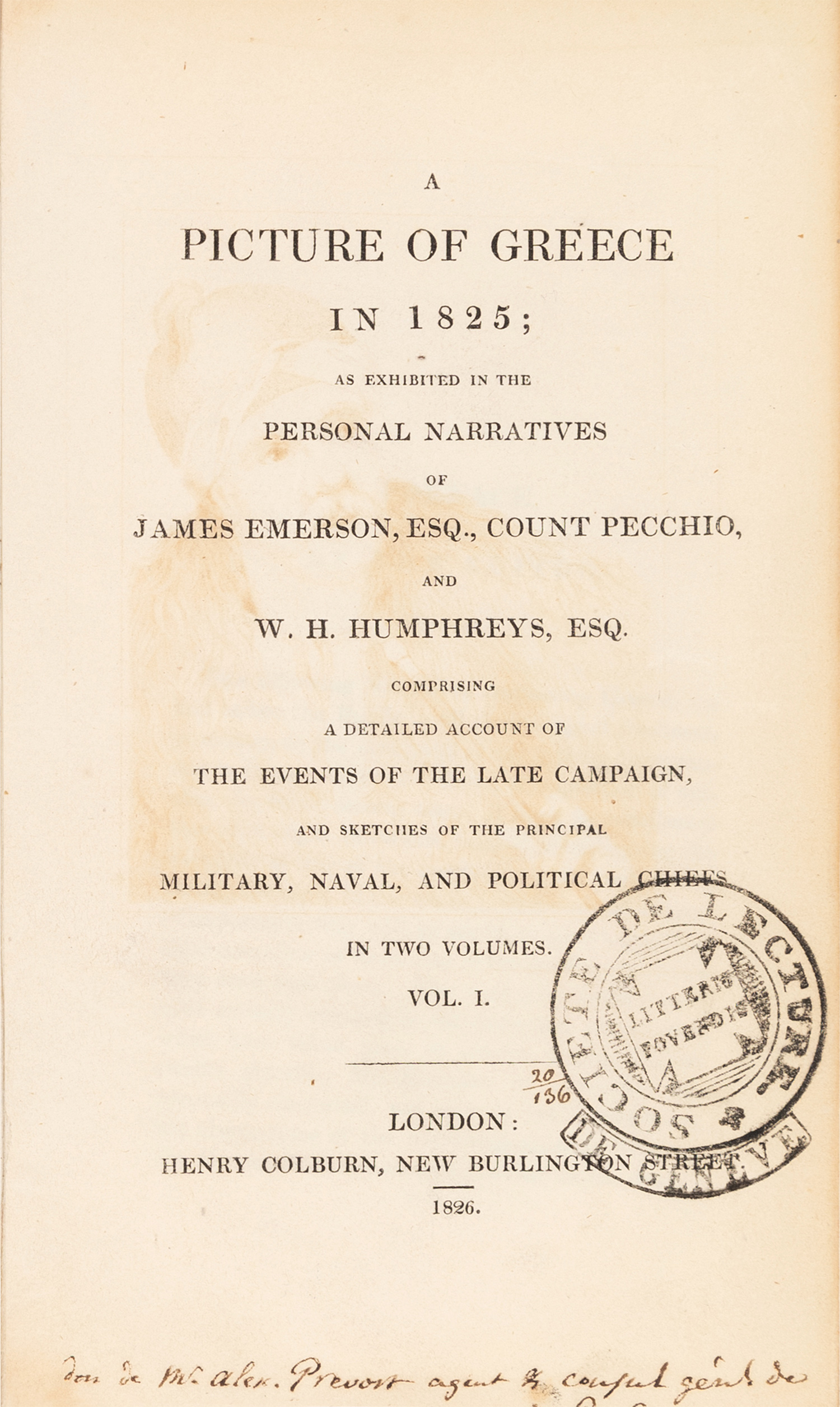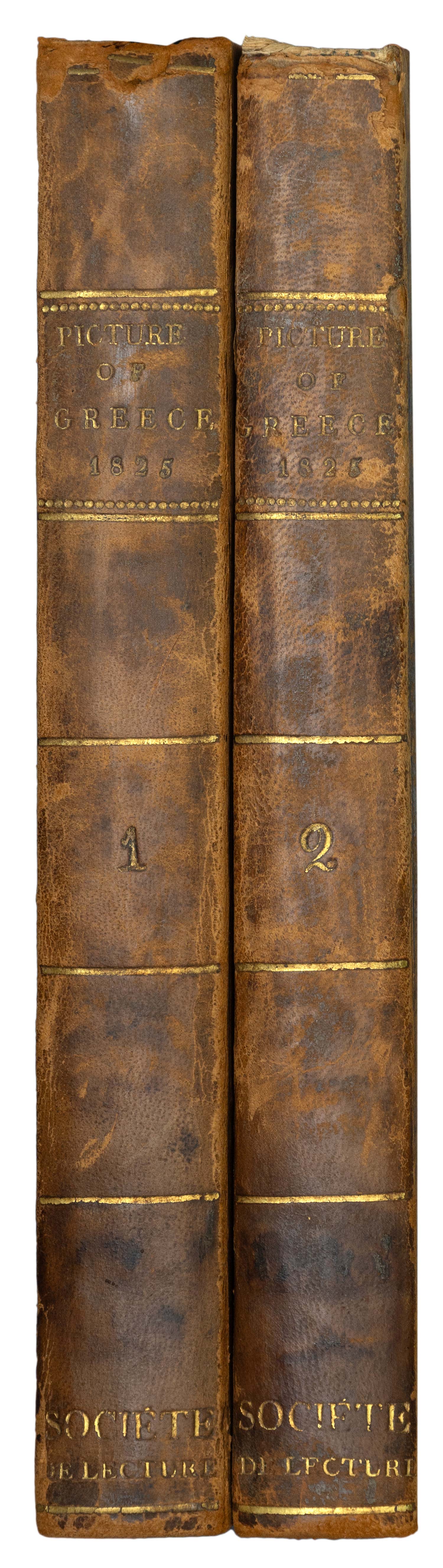 Τιμή εκτίμησης: € 200 - 300ΠΡΩΤΗ ΕΚΔΟΣΗ. 2 τόμοι, 12o, xii + 359 και viii + 344 (σφραγίδα στον τίτλο, ταξιθετικοί αριθμοί στα πάνω ακρόφυλλα και τον ψευδότιτλο του Α´ τόμου, χειρόγραφη σημείωση δωρεάς στο κάτω περιθώριο των τίτλων). Χαλκόγραφη προμετωπίδα στον πρώτο τόμο (πορτραίτο του Μιαούλη), τετρασέλιδος κατάλογος του εκδότη στο τέλος του δεύτερου τόμου («Mr. Colburn has recently published the following works»). Δερμάτινη ράχη της εποχής της έκδοσης (μικρές φθορές, μαρμαρογραφημένα τα καλύμματα, κόκκινες οι ακμές). Βlackmer 548, Droulia 1641-2, Contominas 236, Λαγανάς 783. (2)