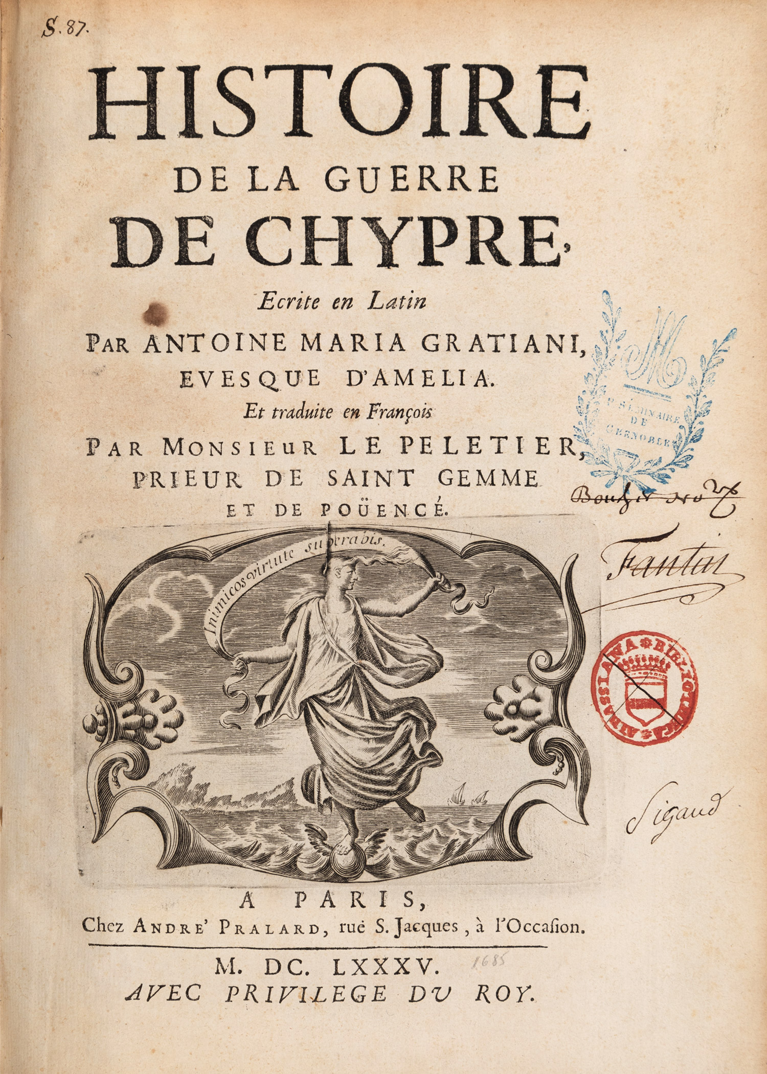 Histoire de la guerre de Chypre, ecrite en latin par Antoine Maria Gratiani, Evesque d’Amelia, et traduite en françois par Monsieur Le Peletier, Prieur de Saint Gemme et de Poüencé.