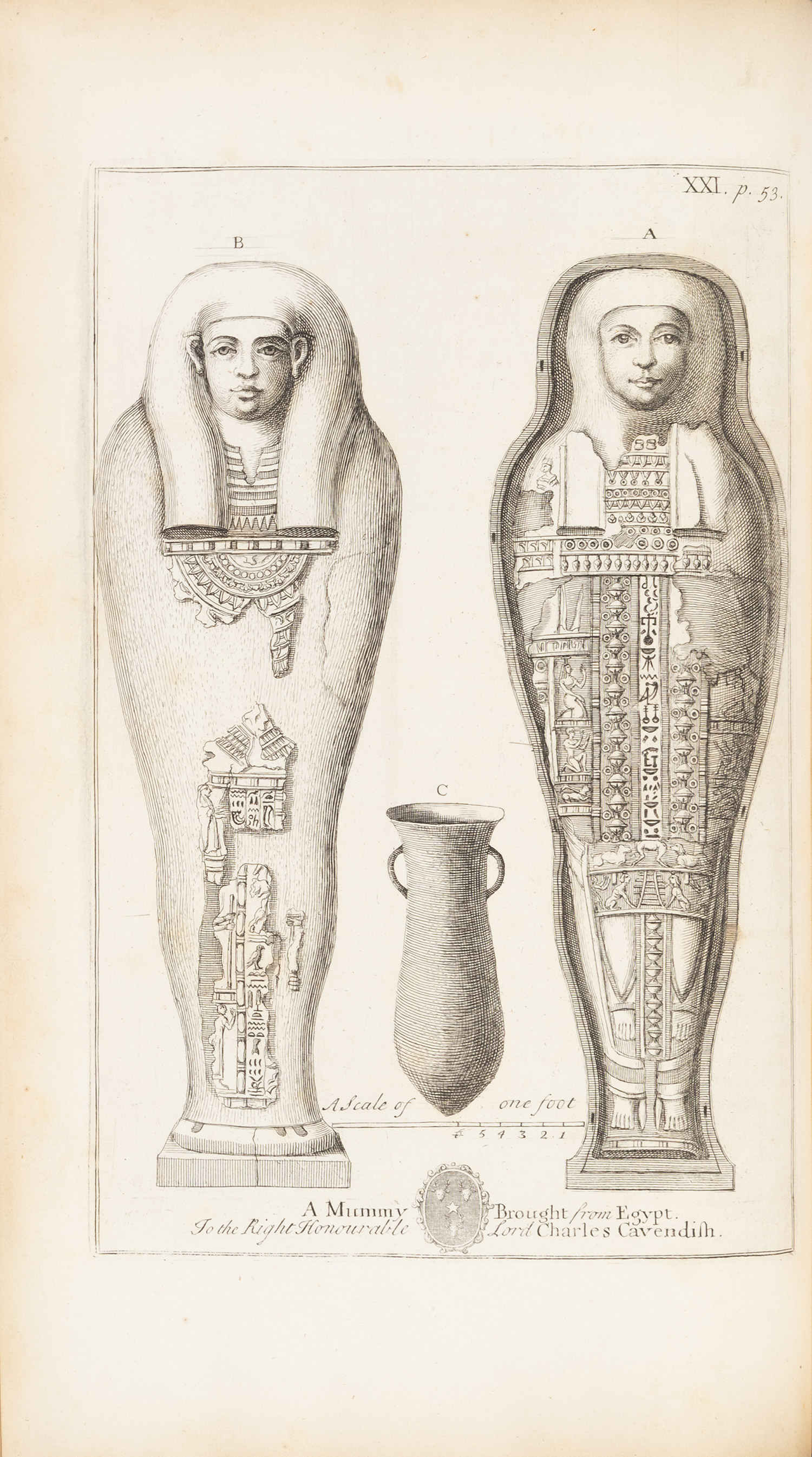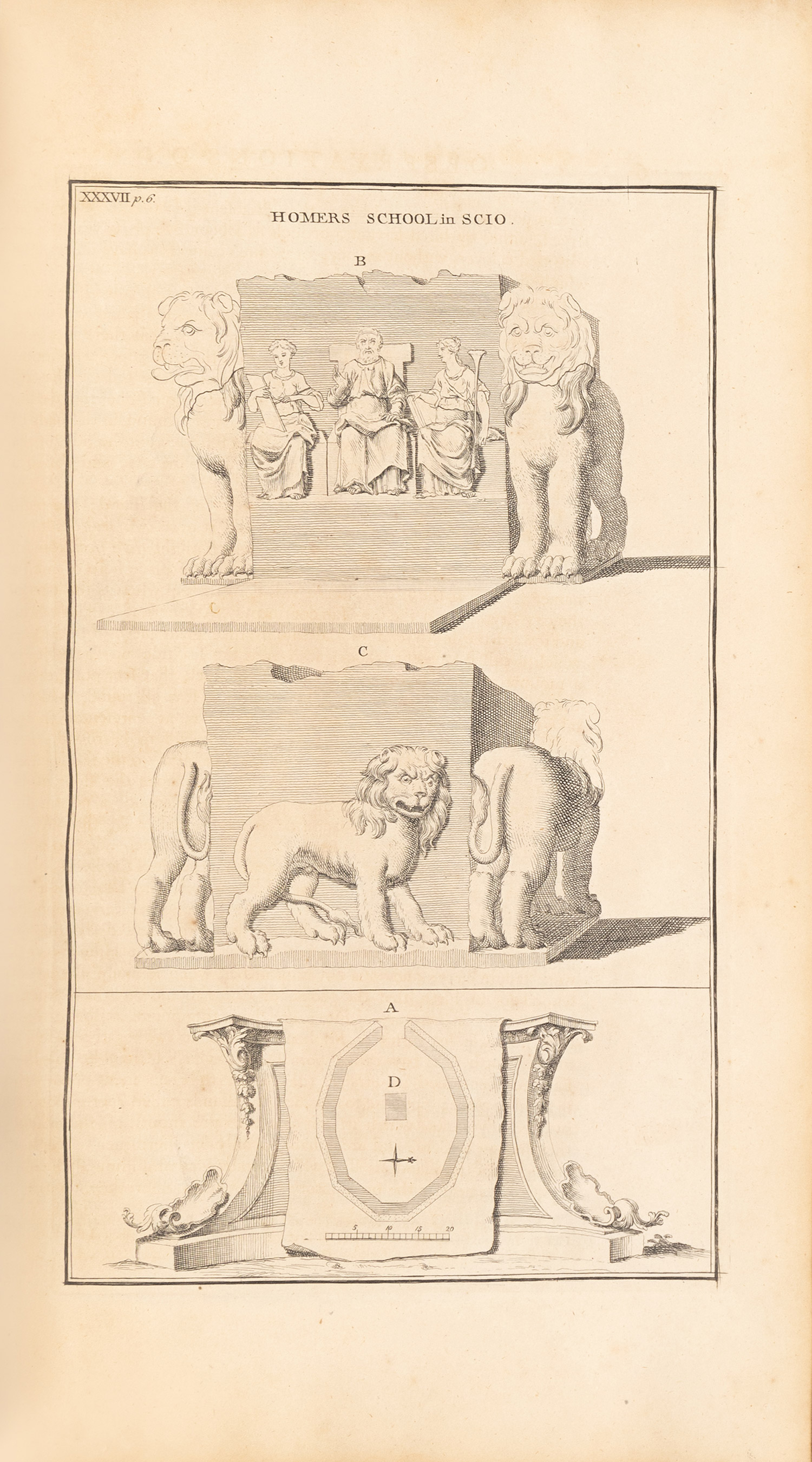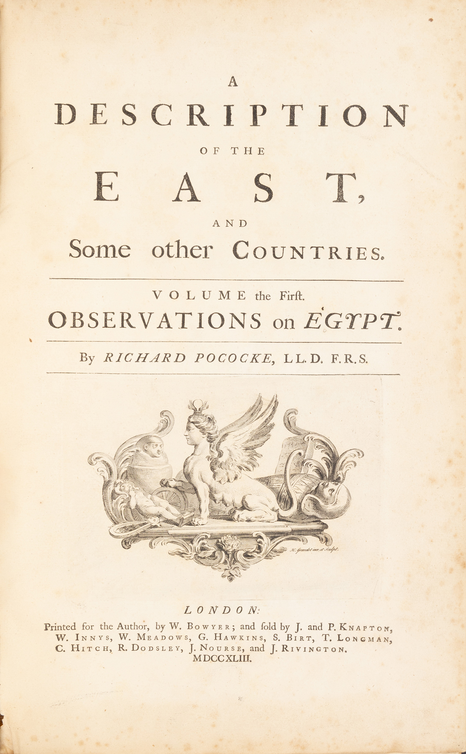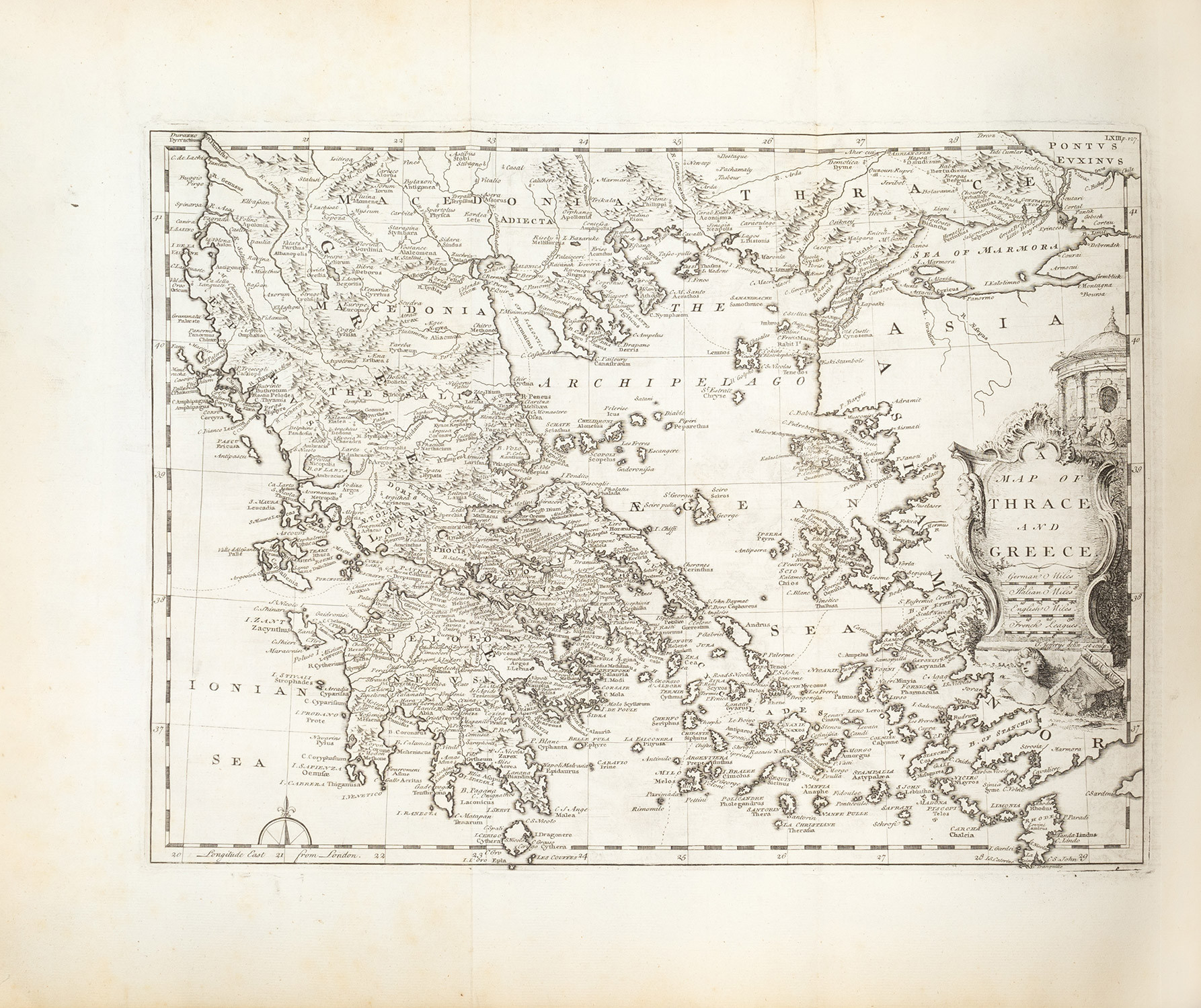 Τιμή εκτίμησης: € 2.400 - 3.500ΠΡΩΤΗ ΕΚΔΟΣΗ. 3 μέρη δεμένα σε 2 τόμους, folio (415 x 256 mm.), vi + 310, xi + 268 και vii + 308 σ. (ελαφρά οξειδωμένα μερικά φύλλα, αχνό αποτύπωμα των χαλκογραφιών στις αντικρινές σελίδες). 178 χαλκόγραφοι πίνακες (75 στον Α´ τόμο, αριθμημένοι I-XXXII & XXXIV-LXXVI, και 103 στον Β´ , αριθμημένοι I-CIII, συνολικά 11 αναδιπλούμενοι), χαλκόγραφο φύλλο με αφιέρωση στον Β´ τόμο, επί μέρους τίτλοι με χαλκόγραφες παραστάσεις. Μεταγενέστερο δέρμα στη ράχη και τις γωνίες. Blackmer 1323, Atabey 965, Ioannou, σ. 418- 9, Chatzipanagioti 829, Weber, II, 513, Contominas 561, Cobham & Jeffery, σ. 51, Zacharakis 1743-5 & 1747-9. (2)