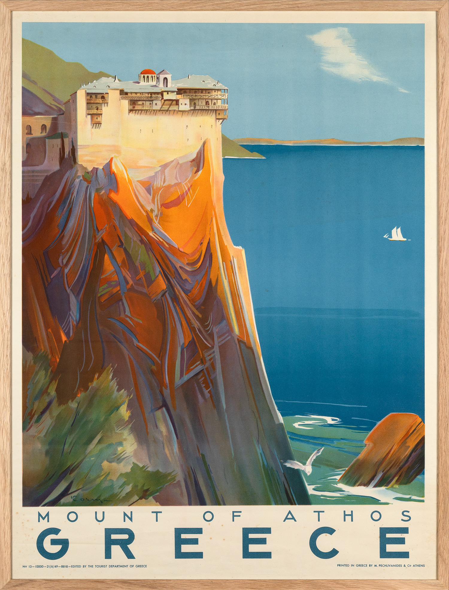 Χρωμολιθόγραφη αφίσα, 790 x 590 mm. Έκδοση της Γεν. Γραμματείας Τουρισμού. Σε κορνίζα. Καραχρήστος 301.