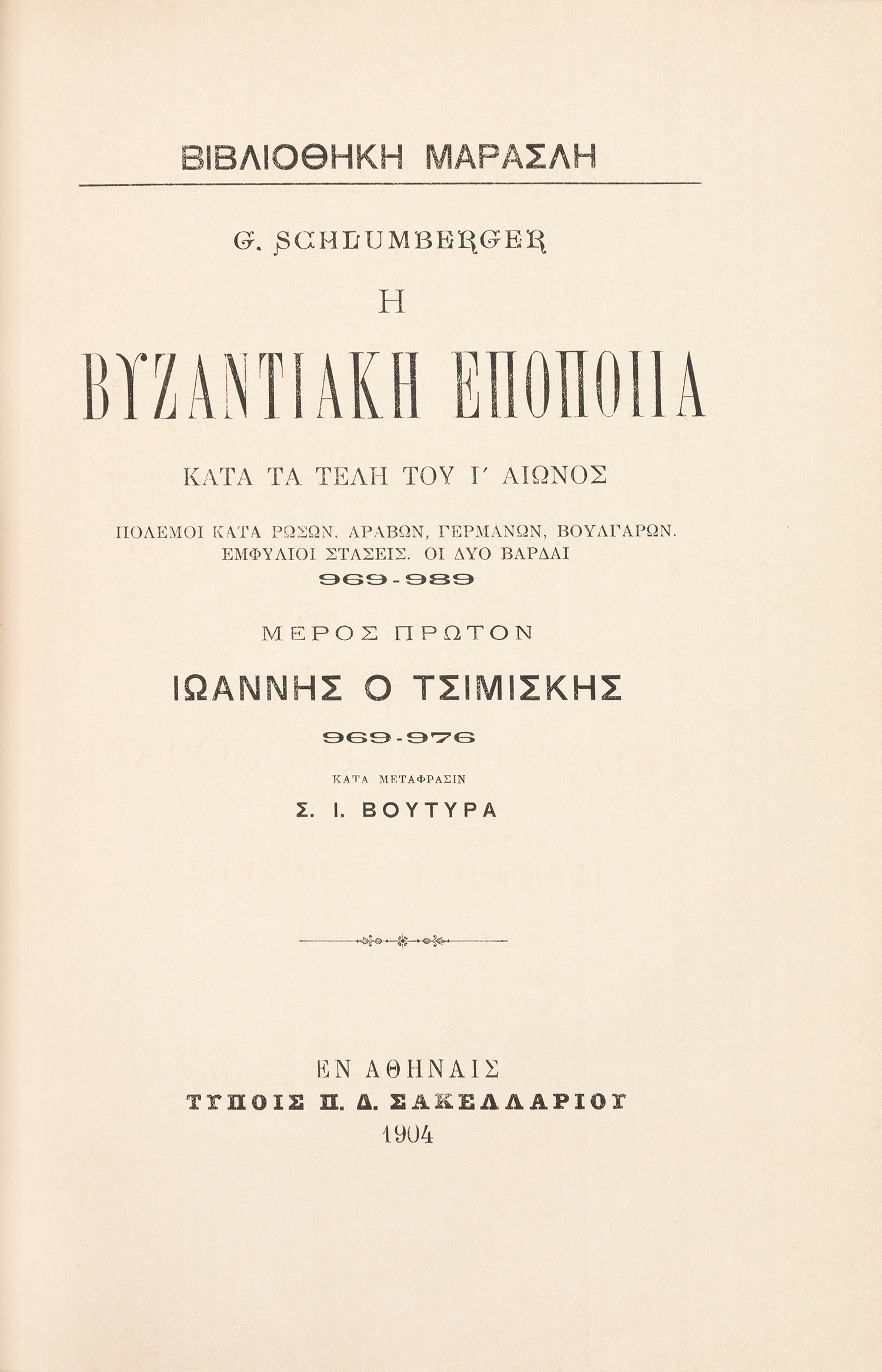 Τιμή εκτίμησης: € 150 - 200896 σ. Δερμάτινη ράχη (ξεθωριασμένη, μικρές φθορές, ex-libris στο εσωτερικό του πάνω καλύμματος). Λαγανάς 1650. [μαζί, του ιδίου, δεμένο ομοιόμορφα:] Ἡ βυζαντιακή ἐποποιία κατά τά τέλη τοῦ Ι´ αἰῶνος (ἔκδοση τῆς Βιβλιοθήκης Μαρασλῆ). Αθήνα, Π. Δ. Σακελλάριος, 1904-1906. • 3 τόμοι, 368 + 487, 763 και 954 σ. (λείπει ο τίτλος σειράς του Β´ μέρους του Α´ τόμου, κτητορική σημείωση με μελάνι στη σ. 177 του Α´ μέρους του ίδιου τόμου). Αντίτυπο με ιδιόχειρη αφιέρωση του μεταφραστή στον Γ´ τόμο. Ξεθωριασμένες οι ράχες των τόμων Β´ και Γ´ , διαφορετικό χρώμα δέρματος στον Α´ τόμο. Λαγανάς 1641. (4)