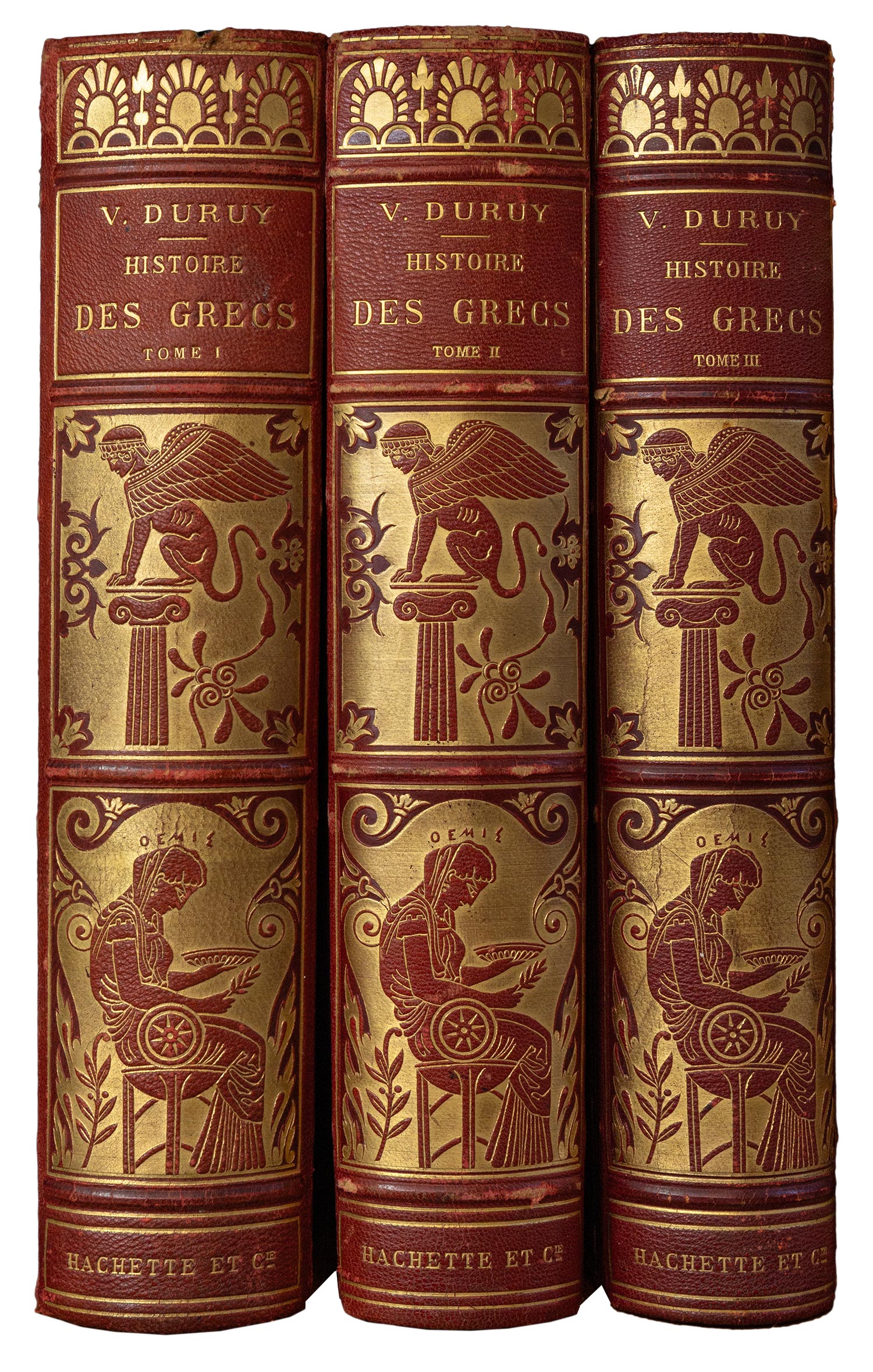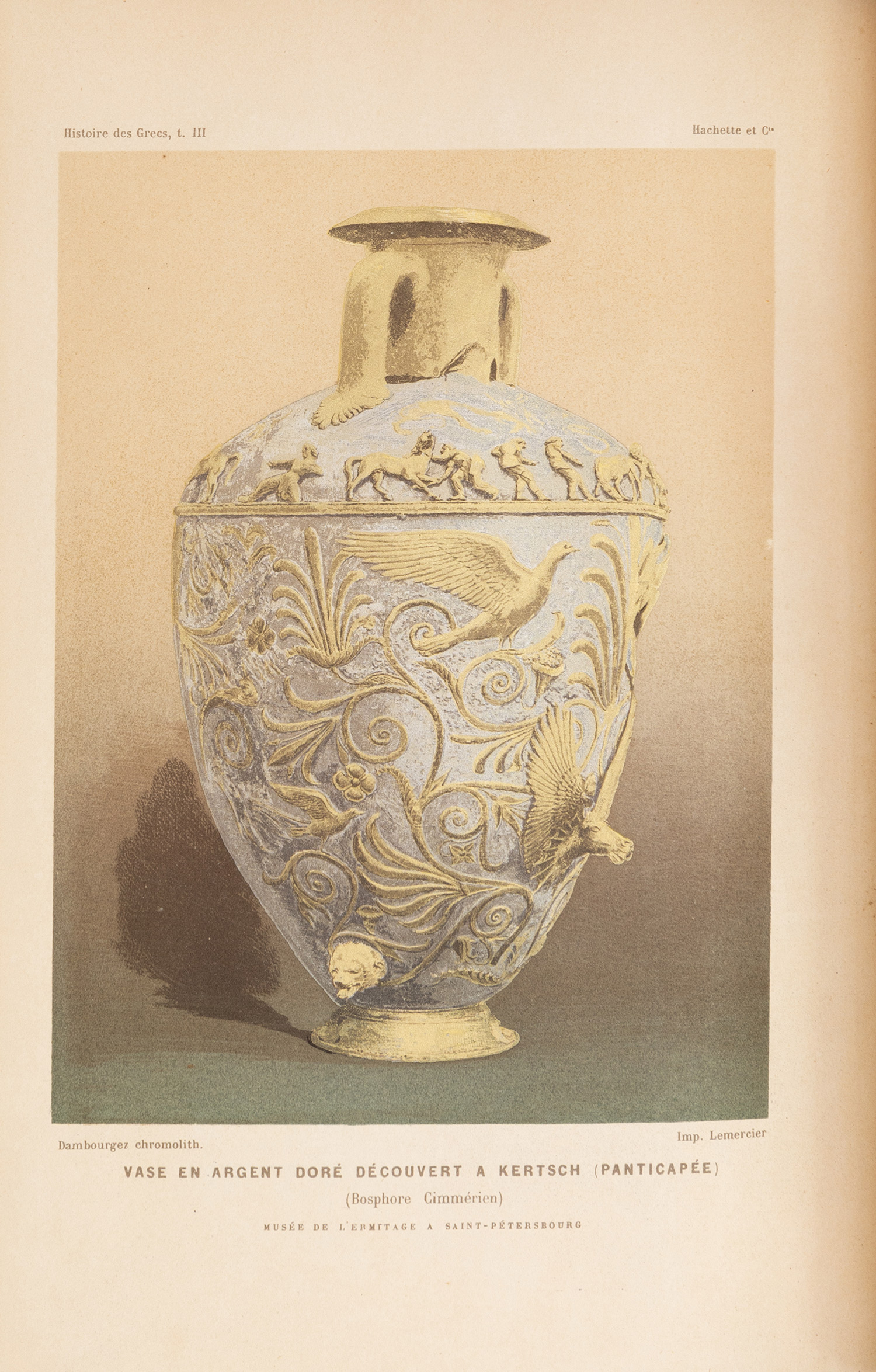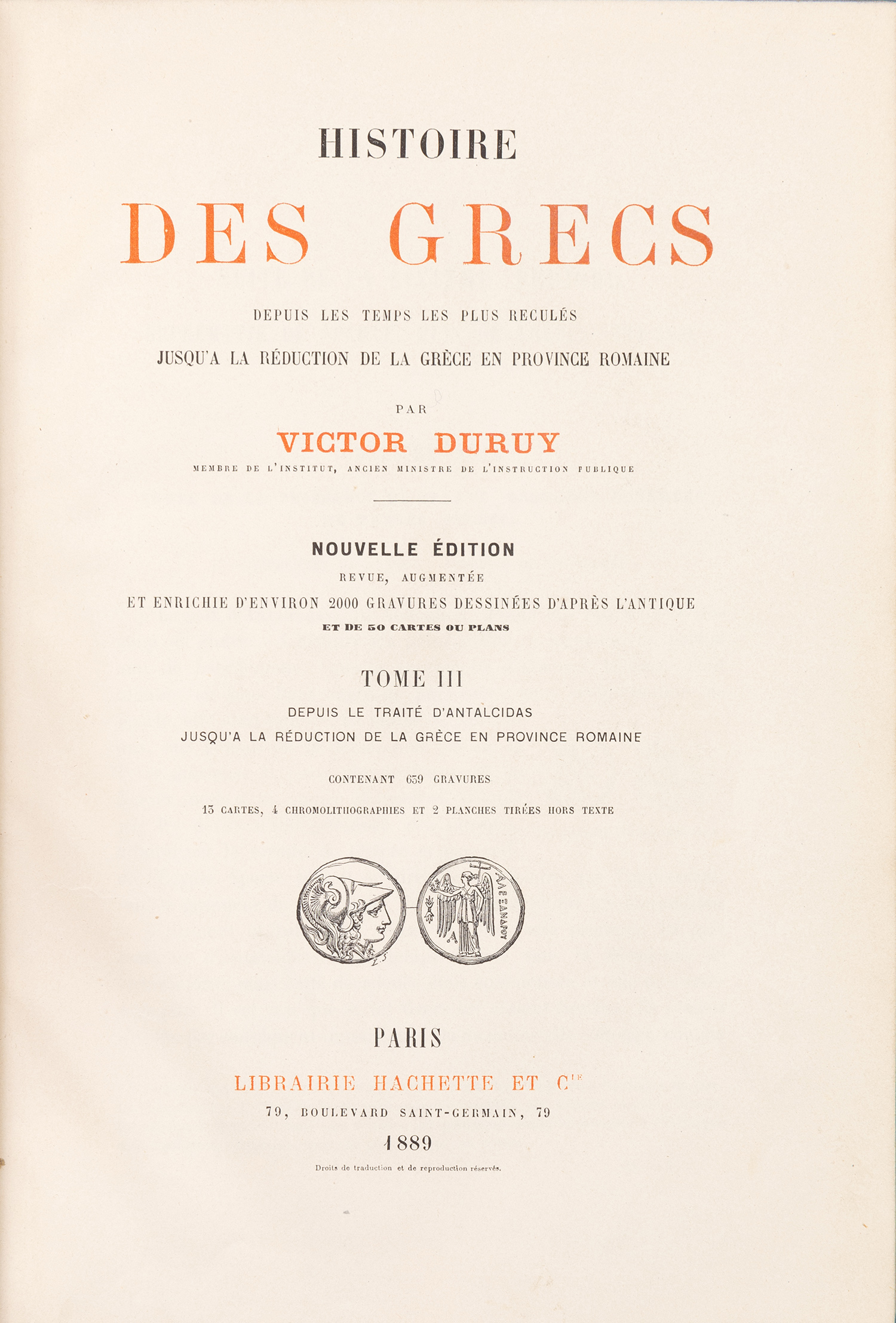 Τιμή εκτίμησης: € 150 - 2003 τόμοι, 4ο, 822, 749 και 740 σ. (μικρό σχίσιμο στο εσωτερικό περιθώριο ενός φύλλου στον Α´ τόμο: σ. 9-10). Με 15 χρωμολιθόγραφους χάρτες και τοπογραφικά (ένας αναδιπλούμενος και 5 δισέλιδοι), 14 χρωμολιθογραφίες (μία δισέλιδη), 2 φωτοτυπικές αναπαραγωγές (μία δισέλιδη και μία αναδιπλούμενη), μία δισέλιδη λιθογραφία με τίντα, έναν δισέλιδο πίνακα και πολυάριθμες εικόνες εντός κειμένου (πολλές ολοσέλιδες). Βιβλιοδεσία του εκδότη (πανί με χρυσή και μαύρη διακόσμηση, παράσταση της θεάς Αθηνάς στα καλύμματα, ex-libris στο εσωτερικό του πάνω καλύμματος). (3)