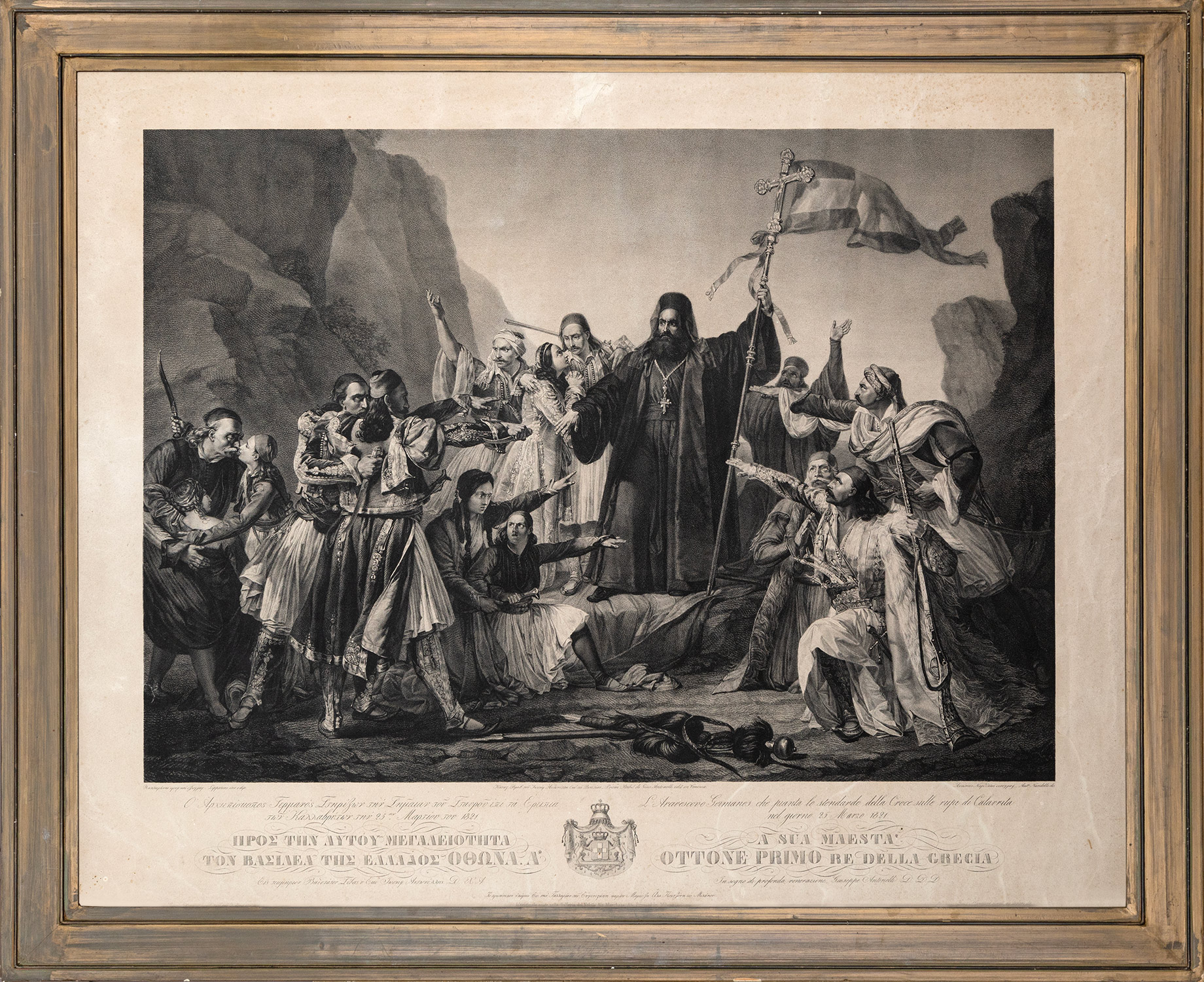 Ὁ Ἀρχιεπίσκοπος Γερμανός στηρίζων τήν σημαίαν τοῦ σταυροῦ ἐπί τά ἐρείπια τῶν Καλλαβρύτων τήν 25ην Μαρτίου τοῦ 1821. Πρός τήν Αὐτού Μεγαλειότητα τόν Βασιλέα τῆς Ἑλλάδος Ὄθωνα Α΄, εἰς τεκμήριον αθυτάτου σέβας ὁ Ἐκδ. Ἰωσήφ Ἀντωνέλλης Δ. Χ. Α.