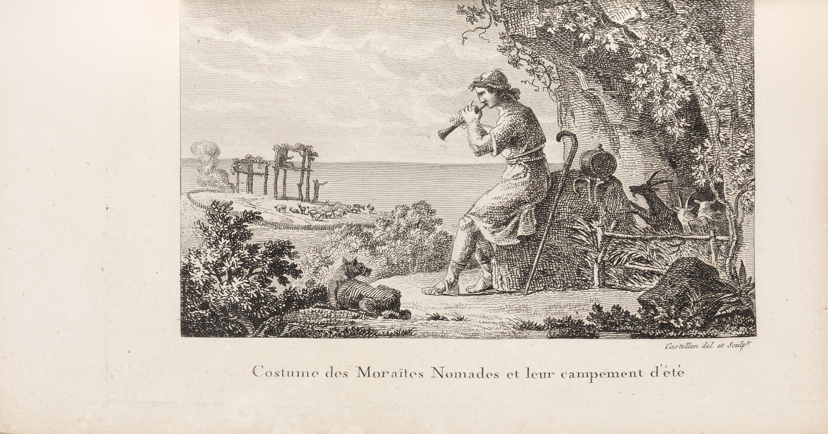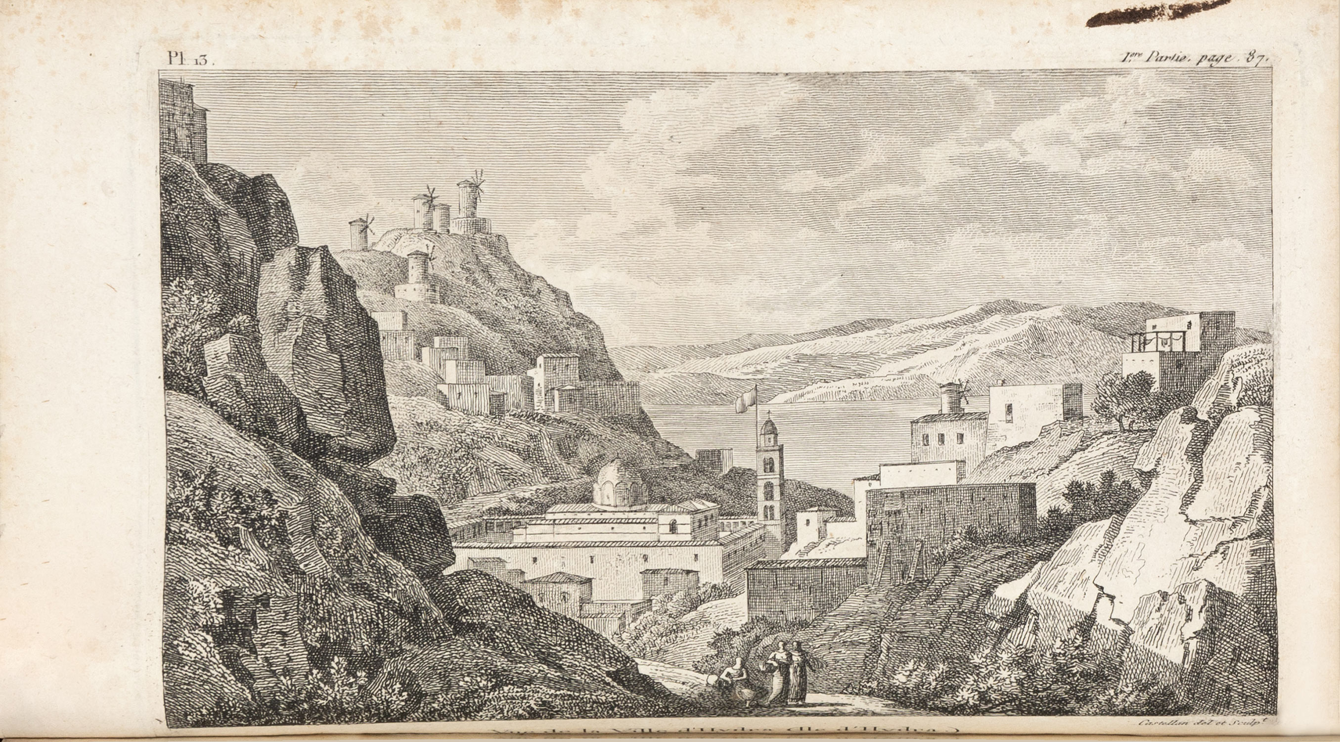 Τιμή εκτίμησης: € 300 - 4002 μέρη σε έναν τόμο, 8ο (210 x 124 mm.),112 και 156 σ. (λόγω βιβλιοδεσίας δε φαίνονται οι τίτλοι δώδεκα χαλκογραφιών, σημειωμένοι με μελάνι στο εξωτερικό περιθώριο οκτώ εξ αυτών). Με 24 χαλκογραφίες σχεδιασμένες και χαραγμένες από το συγγραφέα και 2 αναδιπλούμενους χάρτες. Δέρμα της εποχής της έκδοσης (μικρές φθορές, χρυσή διακόσμηση στη ράχη και τα καλύμματα, μαρμαρογραφημένα τα ακρόφυλλα). Blackmer 298, Legrand & Pernot, 790, Weber, II, 637, Contominas 127.