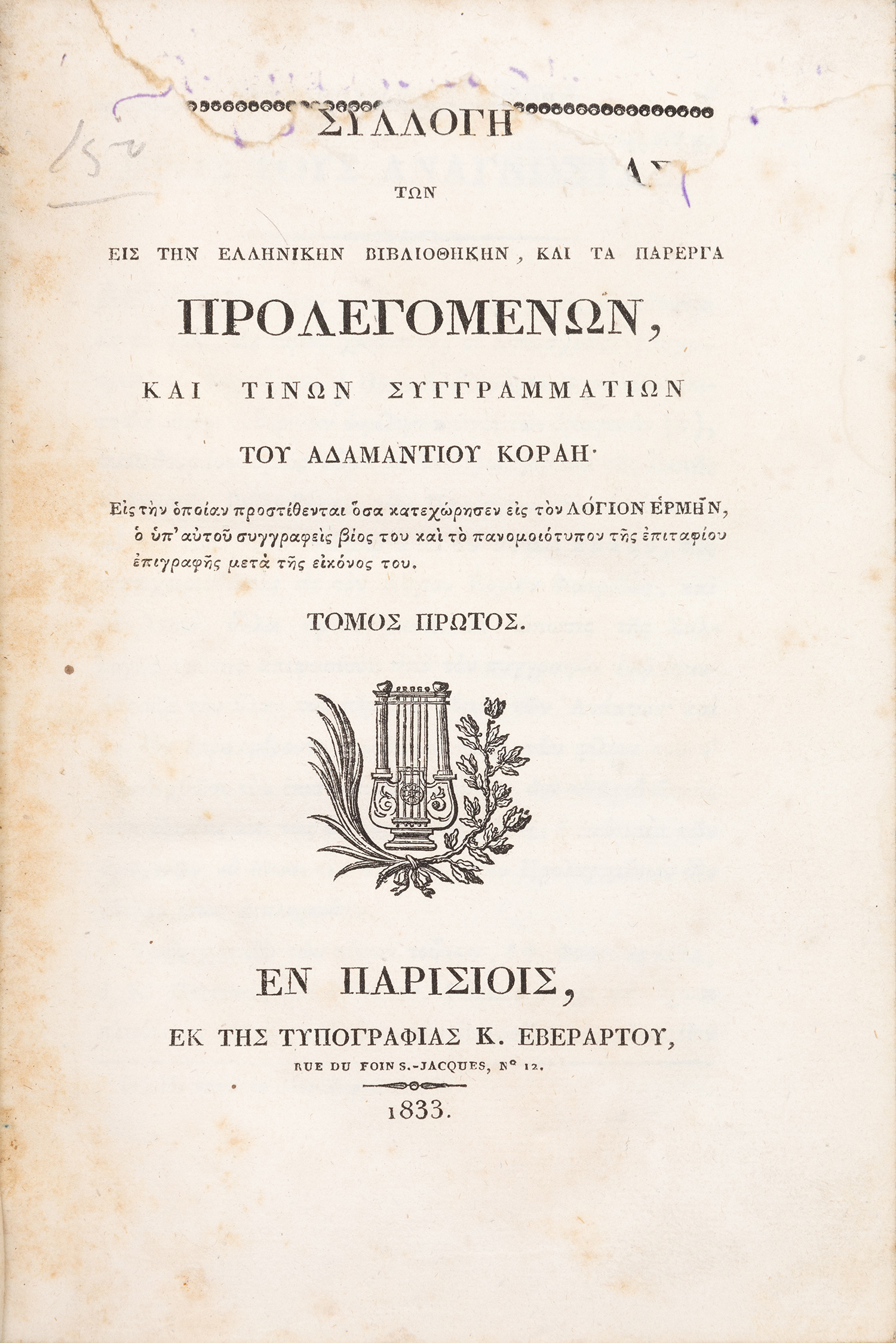 Τιμή εκτίμησης: € 200 - 3008ο, η´ + 508 σ. (οξειδωμένο αντίτυπο). Κατάλογος συνδρομητών. Δερμάτινη ράχη της εποχής της έκδοσης (φθορές). Hλιού 1815.82, Λαγανάς 622. [μαζί, του ιδίου:] Συλλογή τῶν εἰς τήν Ἑλληνικήν Βιβλιοθήκην καί τά Πάρεργα προλεγομένων, καί τινων συγγραμματίων, τόμος πρῶτος (δεν εκδόθηκε άλλος). Παρίσι, C. Eberhart, 1833. • 8ο, λβ´ + 577 σ. (λείπει τμήμα από το πάνω περιθώριο του τίτλου, οξείδωση στα περισσότερα φύλλα). Με μία λιθογραφία (προτομή του συγγραφέα) και ένα πανομοιότυπο εκτός κειμένου (η επιτύμβια επιγραφή του γραμμένη από τον ίδιο). Δερμάτινη ράχη της εποχής της έκδοσης (σπασμένη η πάνω σύνδεση, μικρές φθορές στα καλύμματα, διάστικτες οι ακμές). Ηλιού 1833. 83, Λαγανάς 948. (2)