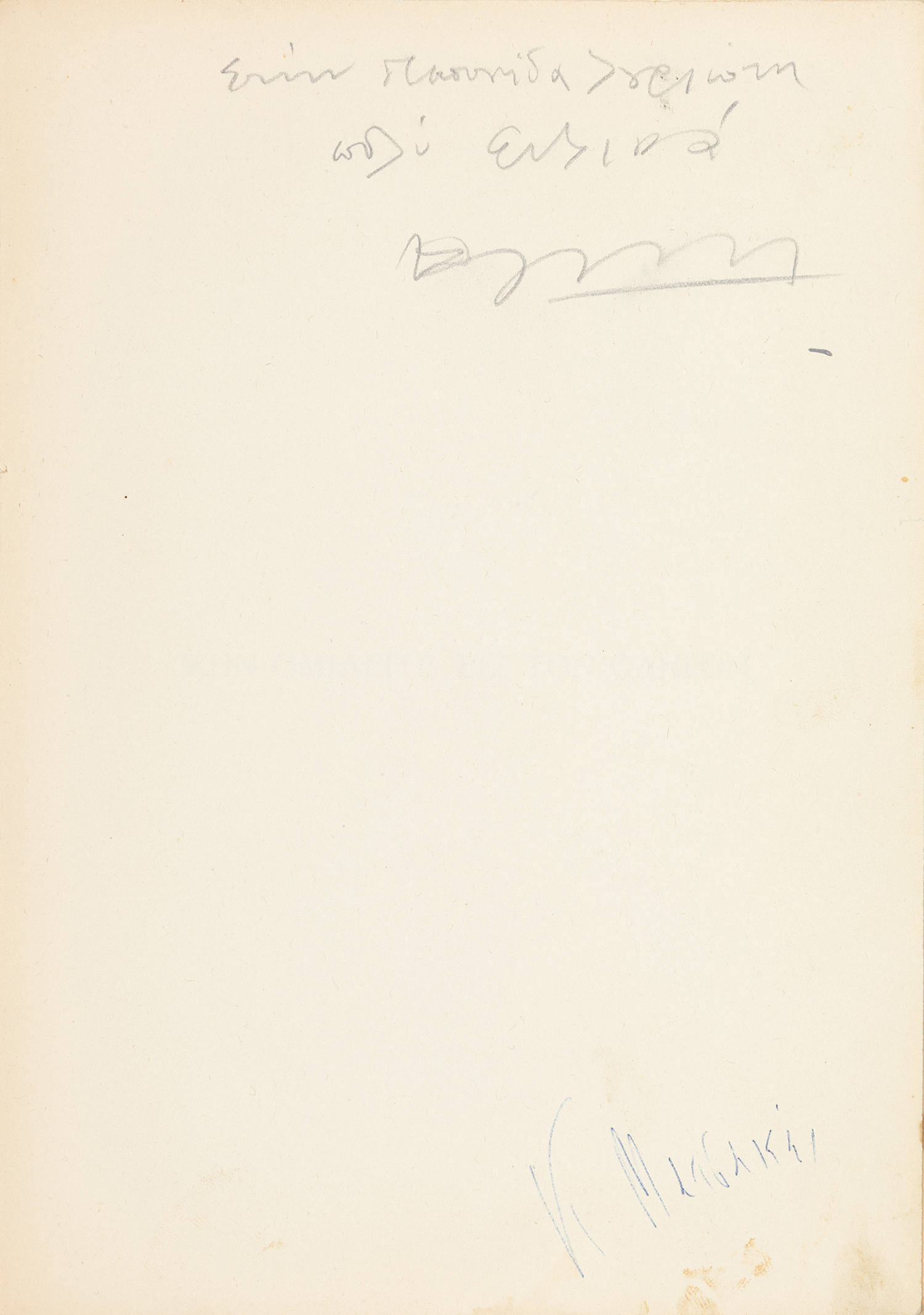Τιμή εκτίμησης: € 300 - 400ΠΡΩΤΗ ΕΚΔΟΣΗ, περιορισμένη σε 200 αριθμημένα αντίτυπα. 54 σ. (ελαφρά λερωμένα λίγα φύλλα). Αντίτυπο με ιδιόχειρη αφιέρωση («Στην δεσποινίδα Λουριώτη / πολύ φιλικά / Ἐγγ—»). Αρχικά εξώφυλλα (λίγο λερωμένα, λυμένη η ράχη). • Η ΠΡΩΤΗ ΠΟΙΗΤΙΚΗ ΣΥΛΛΟΓΗ ΤΟΥ ΕΓΓΟΝΟΠΟΥΛΟΥ.