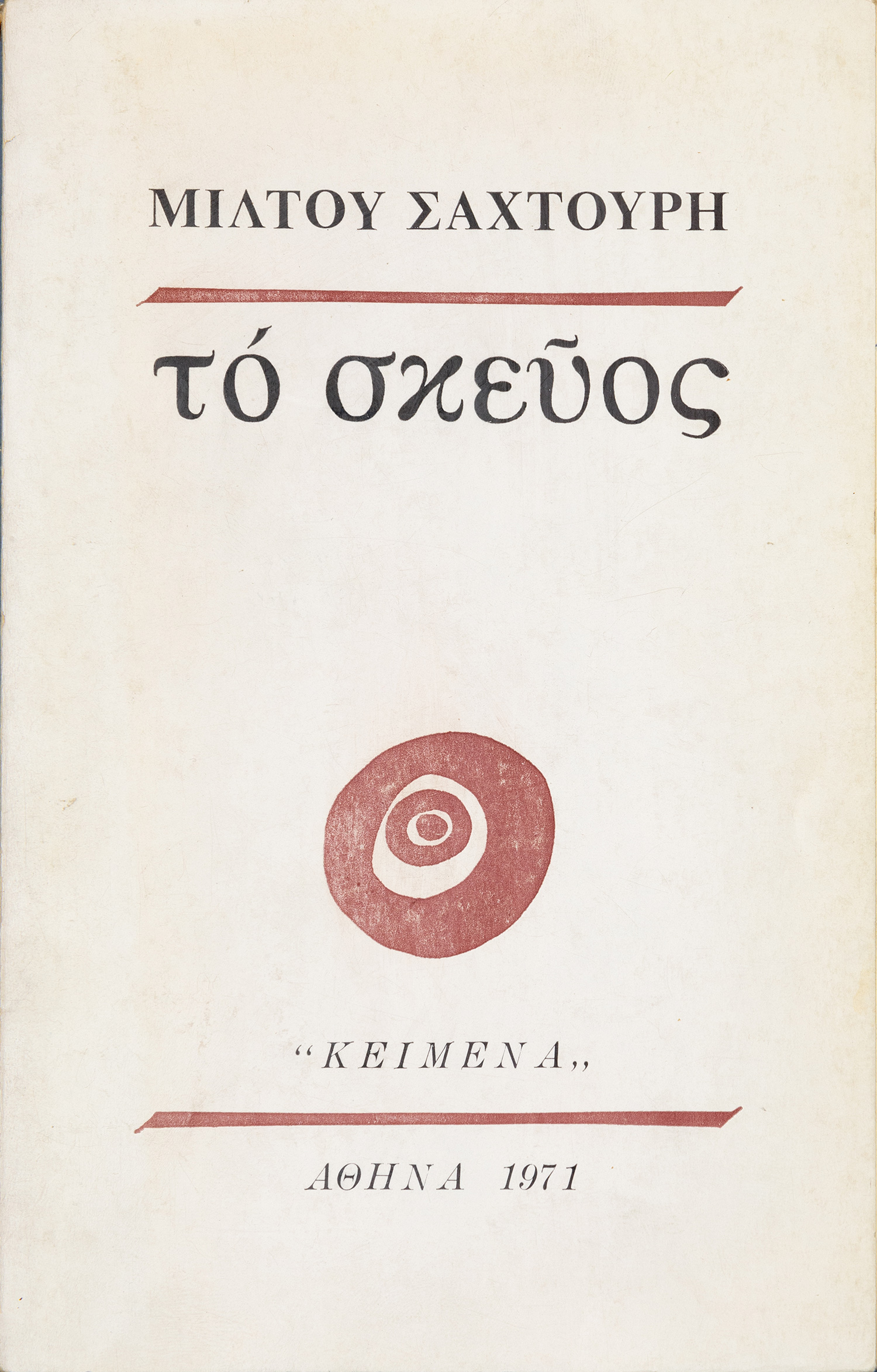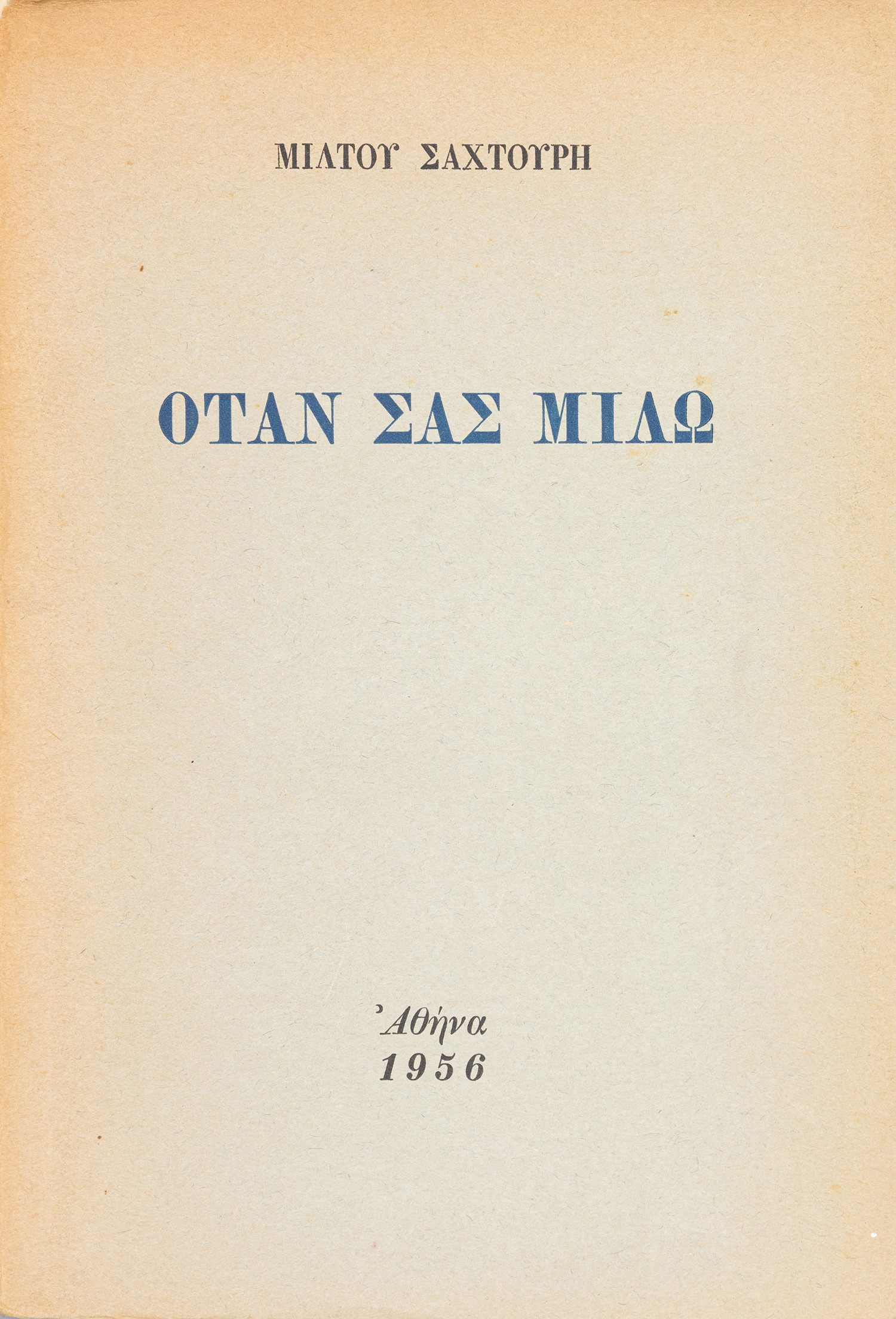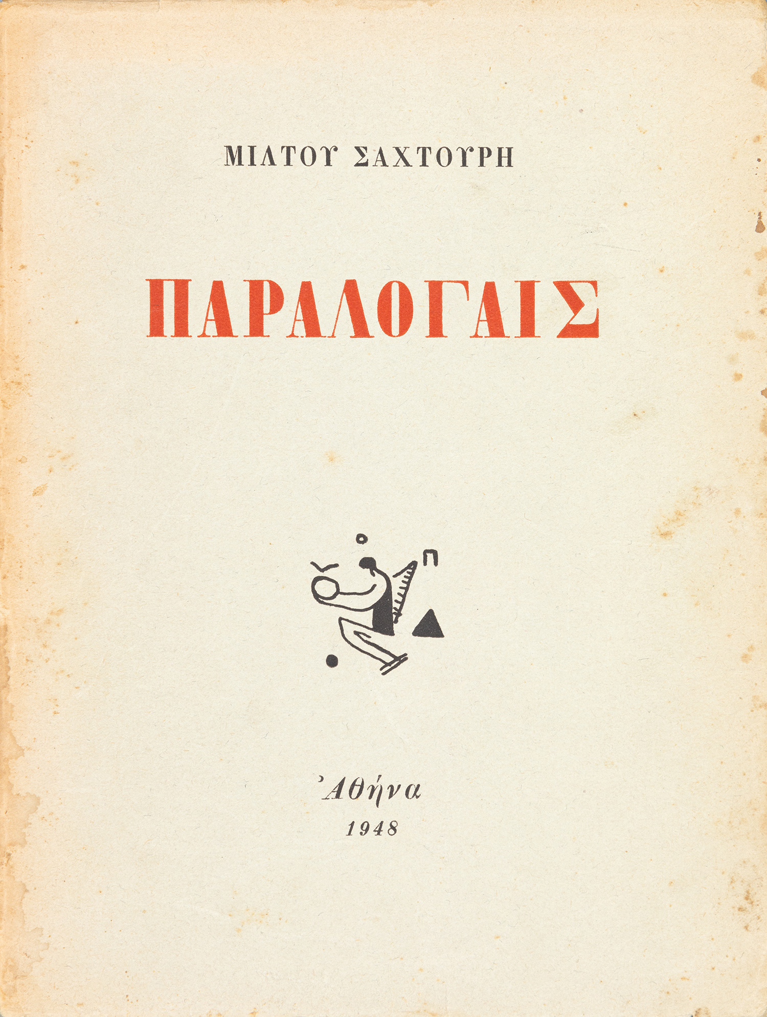Τιμή εκτίμησης: € 150 - 200ΠΡΩΤΗ ΕΚΔΟΣΗ, περιορισμένη σε 220 αριθμημένα αντίτυπα. 37 σ. (λείπει το πρώτο φύλλο, πιθανότατα λευκό). Αρχικά εξώφυλλα (με βινιέτα του Ν. Εγγονόπουλου). [μαζί, του ιδίου:] Παραλογαῖς. Αθήνα 1948. • ΠΡΩΤΗ ΕΚΔΟΣΗ, περιορισμένη σε 250 αριθμημένα αντίτυπα. 76 σ. Αντίτυπο με ιδιόχειρη αφιέρωση («Στο Μίμη Μουστάκα / μέ θερμή φιλία / Μ. Σαχτούρης / 51»). Αρχικά εξώφυλλα (λίγο οξειδωμένα, φθορές στη ράχη, λυμένη). [μαζί, του ιδίου:] Ὅταν σᾶς μιλῶ. Αθήνα 1956. • ΠΡΩΤΗ ΕΚΔΟΣΗ, περιορισμένη σε 300 αριθμημένα αντίτυπα. 18 σ. (λείπει ένα φύλλο στην αρχή, πιθανότατα λευκό). Αρχικά εξώφυλλα (λίγο ξεθωριασμένα). [μαζί, του ιδίου:] Τό σκεῦος. Αθήνα, Κείμενα, 1971. • ΠΡΩΤΗ ΕΚΔΟΣΗ. 45 σ. (αφιέρωση, σφραγίδες και σημείωση με μελάνι στο πρώτο (λευκό) φύλλο). Αρχικά εξώφυλλα. (4)