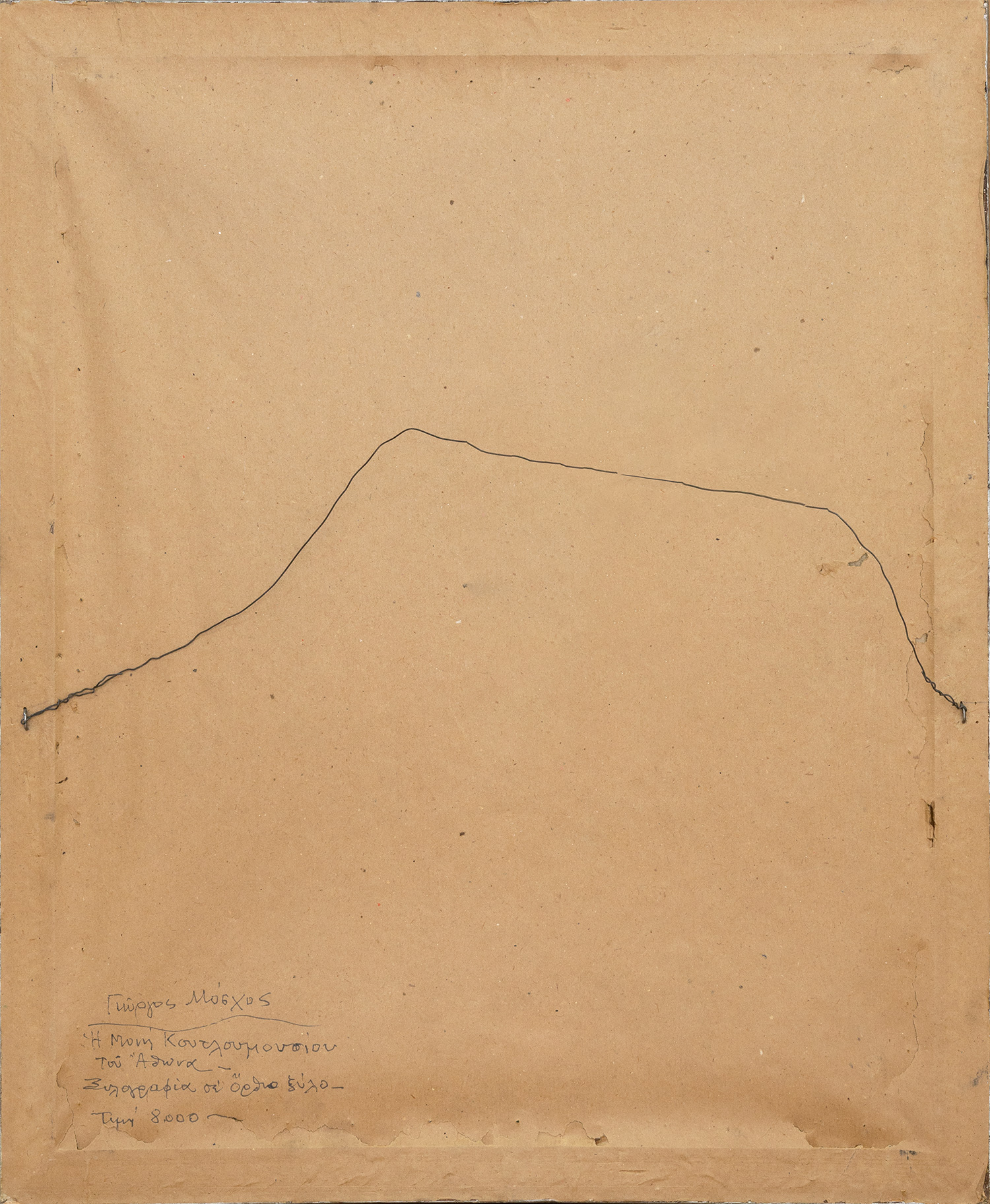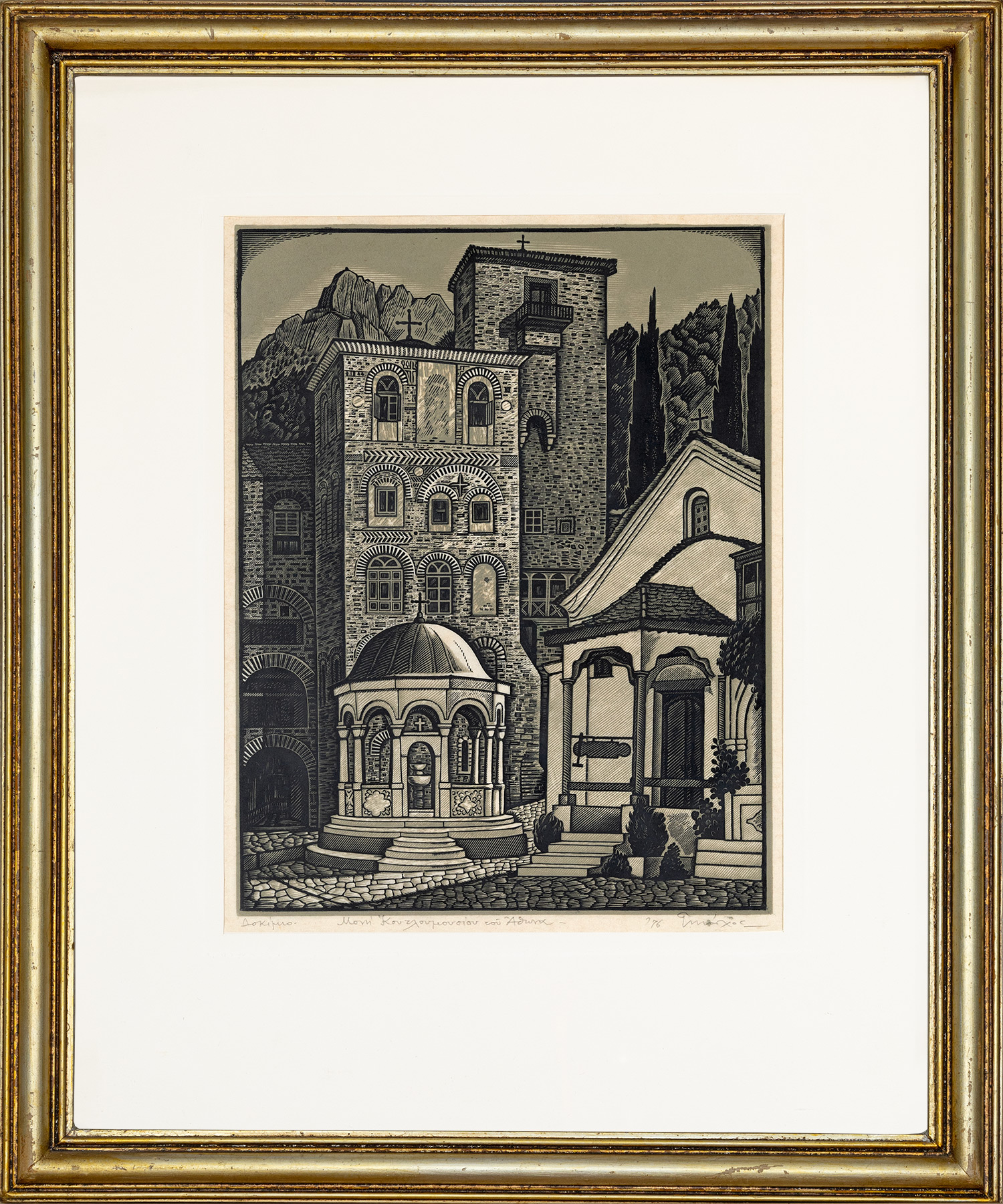 Τιμή εκτίμησης: € 500 - 700Δίχρωμη ξυλογραφία σε όρθιο ξύλο, 350 x 266 mm. Η ένδειξη «Δοκίμιο», τίτλος, χρονολογία και υπογραφή στο κάτω περιθώριο με μολύβι, αυτόγραφη σημείωση στην πίσω όψη της κορνίζας: «Γιῶργος Μόσχος / Ἡ Μονή Κουτλουμουσίου / τοῦ Ἄθωνα / Ξυλογραφία σέ ὄρθιο ξύλο / Τιμή 8.000». Σε κορνίζα.
