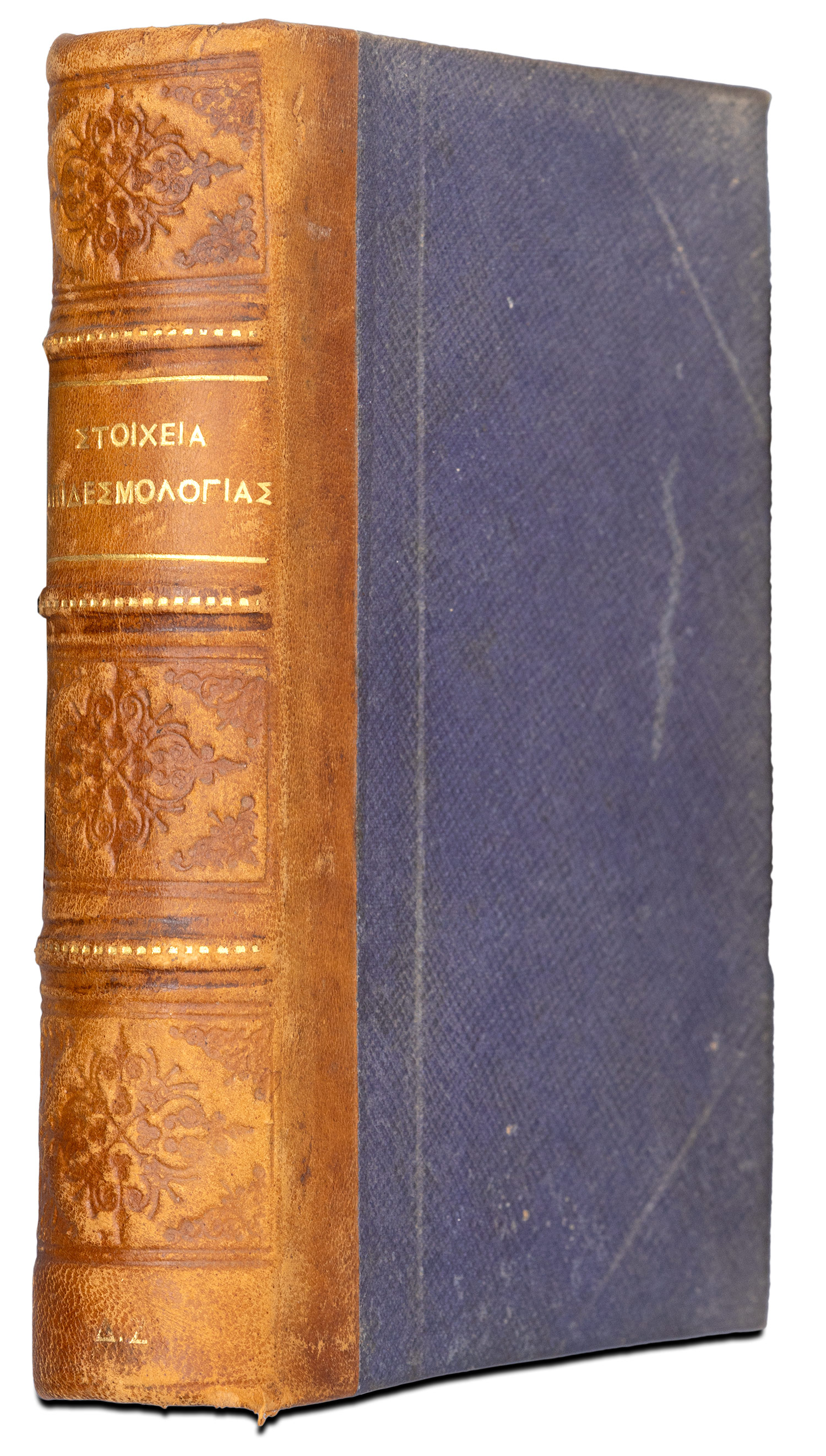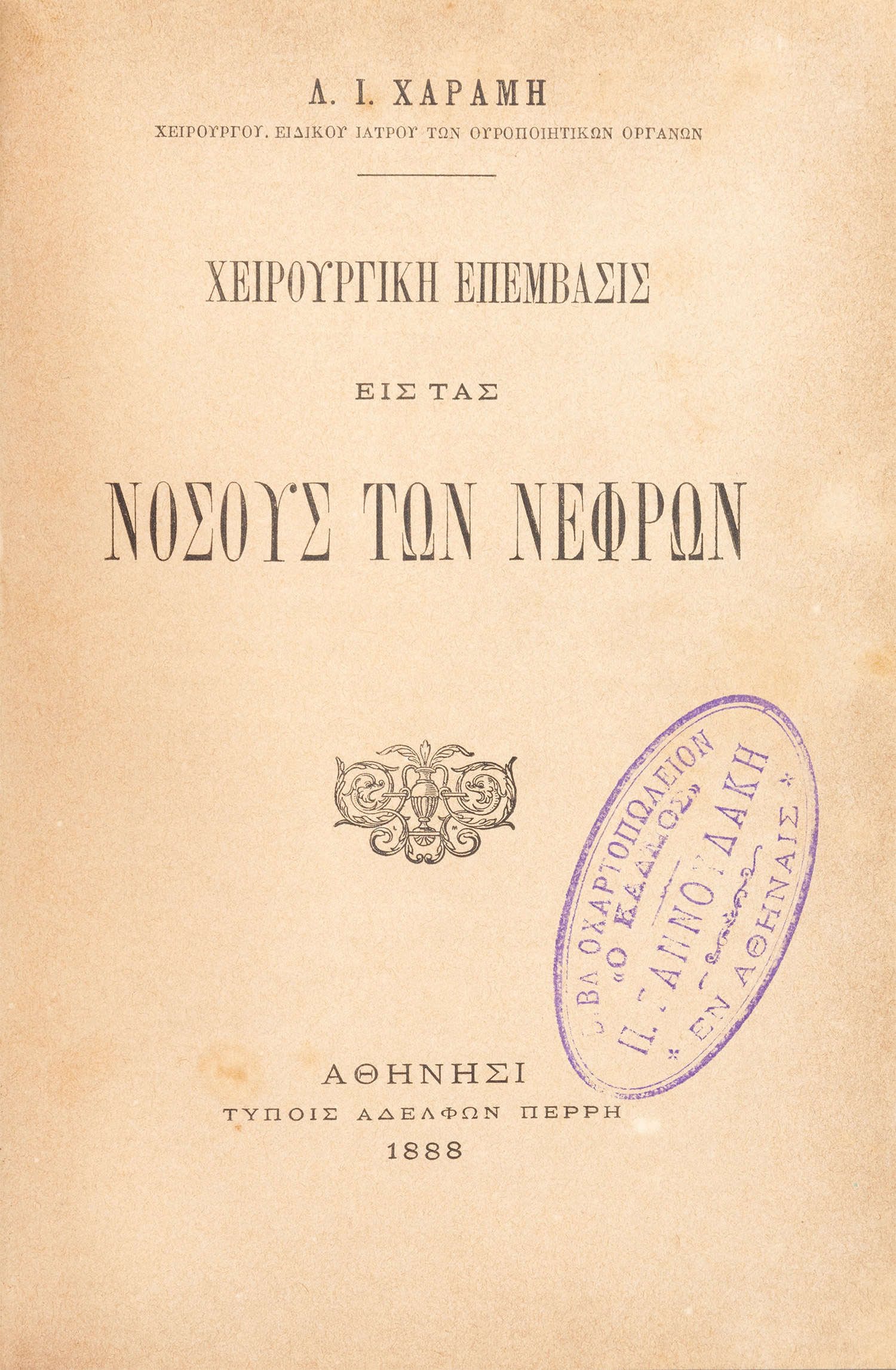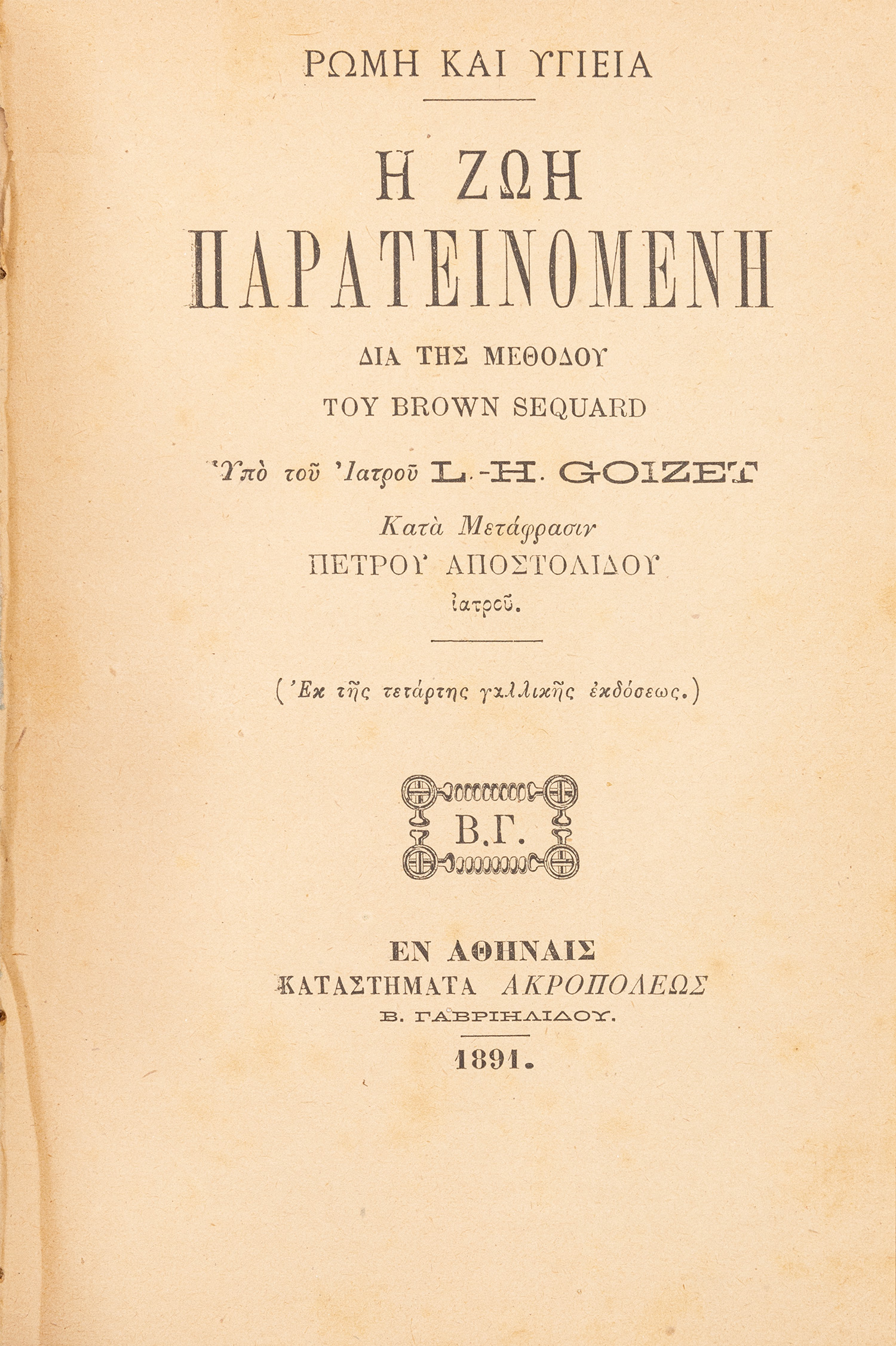 Τιμή εκτίμησης: € 150 - 2008ο, ιε´ + 272 σ. Με πολυάριθμες εικόνες εντός κειμένου. Δερμάτινη ράχη της εποχής της έκδοσης με εμπίεστη διακόσμηση. Ηλιού & Πολέμη, 1892.744. [δεμένο μαζί:] ΧΑΡΑΜΗΣ, Λ. Ι. Χειρουργική ἐπέμβασις εἰς τάς νόσους τῶν νεφρῶν. Αθήνα, Αδελφοί Περρή, 1888. • 8ο, 108 σ. (ελαφρά οξειδωμένο). Ηλιού & Πολέμη, 1888.592. [δεμένο μαζί:] GOIZET, L.-H. Ἡ ζωή παρατεινομένη διά τῆς μεθόδου τοῦ Brown Sequard, κατά μετάφρασιν Πέτρου Ἀποστολίδου (ἐκ τῆς τετάρτης γαλλικῆς ἐκδόσεως), [πάνω:] Ρώμη καί ὑγίεια. Αθήνα, Καταστήματα Ακροπόλεως, 1891. • 8ο, δ´ + (9)-278 σ. (λείπουν δύο φύλλα: σ. 71-4). Ηλιού & Πολέμη, 1891.754 (2 μόνο αντίτυπα).