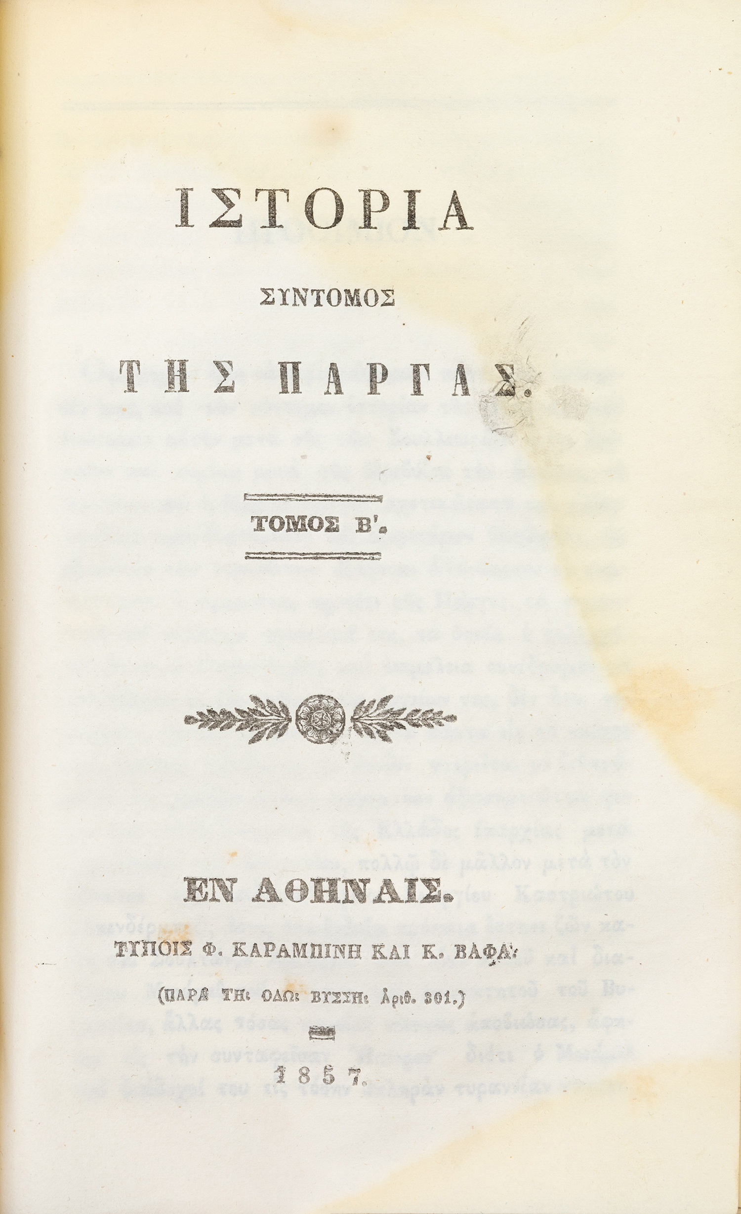Ἱστορία τοῦ Σουλλίου καί Πάργας, περιέχουσα τήν χρονολογίαν αὐτῶν, τάς πρός τούς Ὀθωμανούς μάχας, κυρίως δέ τάς πρός τόν Ἀλῆ Πασᾶ Σατράπην τῆς Ἠπείρου [– Ἱστορία σύντομος τῆς Πάργας], τόμος Α´[-Β´].
