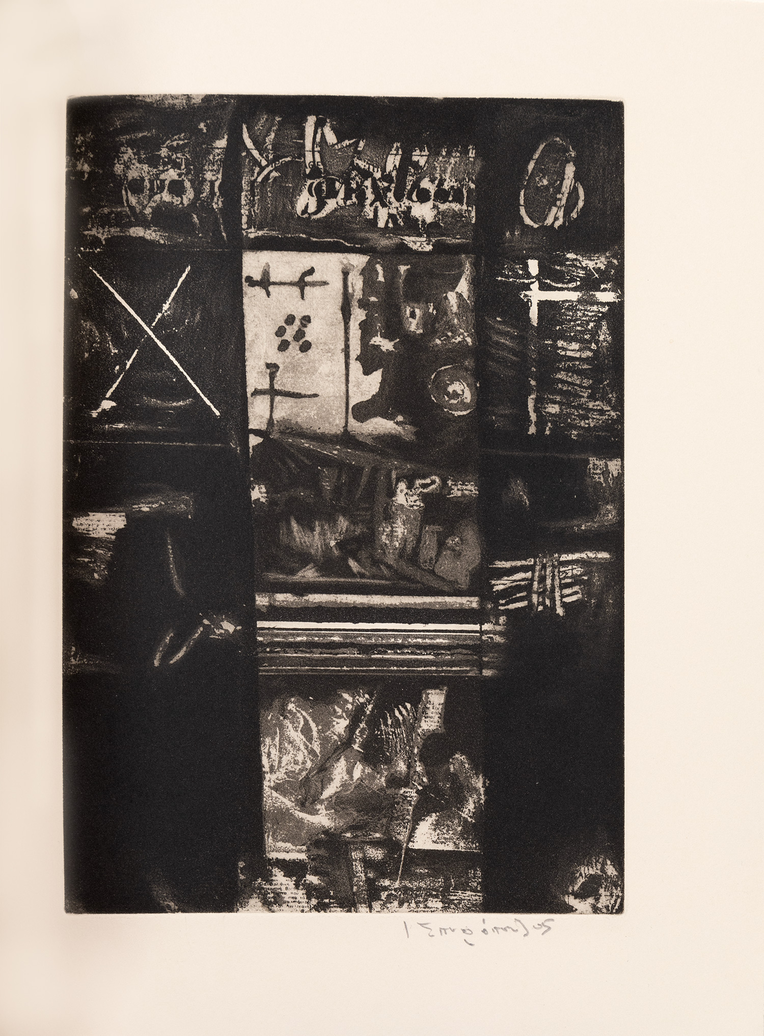 Τιμή εκτίμησης: € 300 - 4004ο (333 x 255 mm.), 67 σ. Έκδοση περιορισμένη σε 134 αριθμημένα αντίτυπα, όλα υπογεγραμμένα από τη Μαρώ Γ. Σεφέρη, με 3 φωτοχαλκογραφίες εκτός κειμένου του Γιάννη ΣΠΥΡΟΠΟΥΛΟΥ, υπογεγραμμένες στο κάτω περιθώριο με μολύβι. Αρχικά εξώφυλλα (εν μέρει άκοπο), πάνινο κουτί. Δασκαλόπουλος Α200.