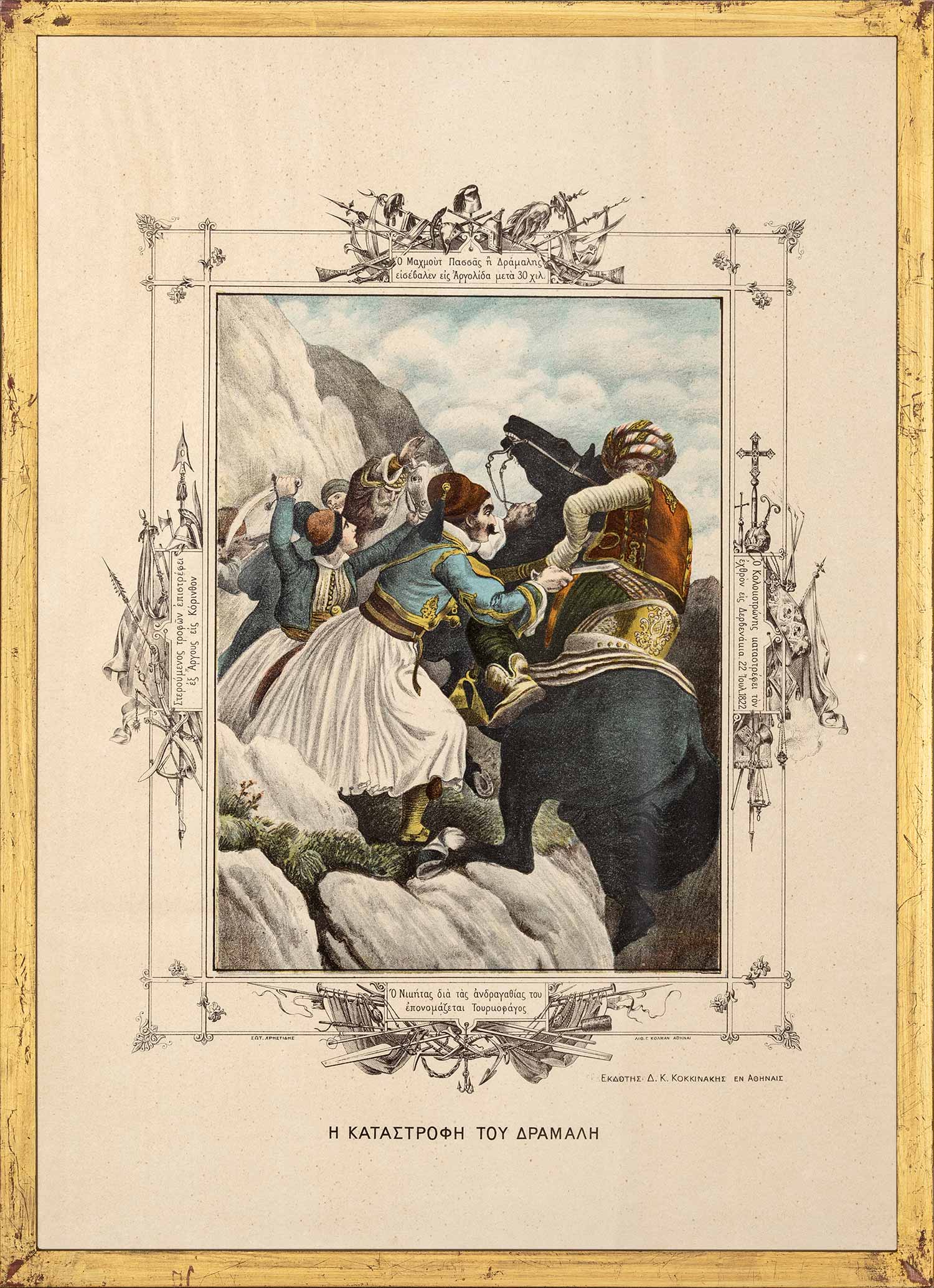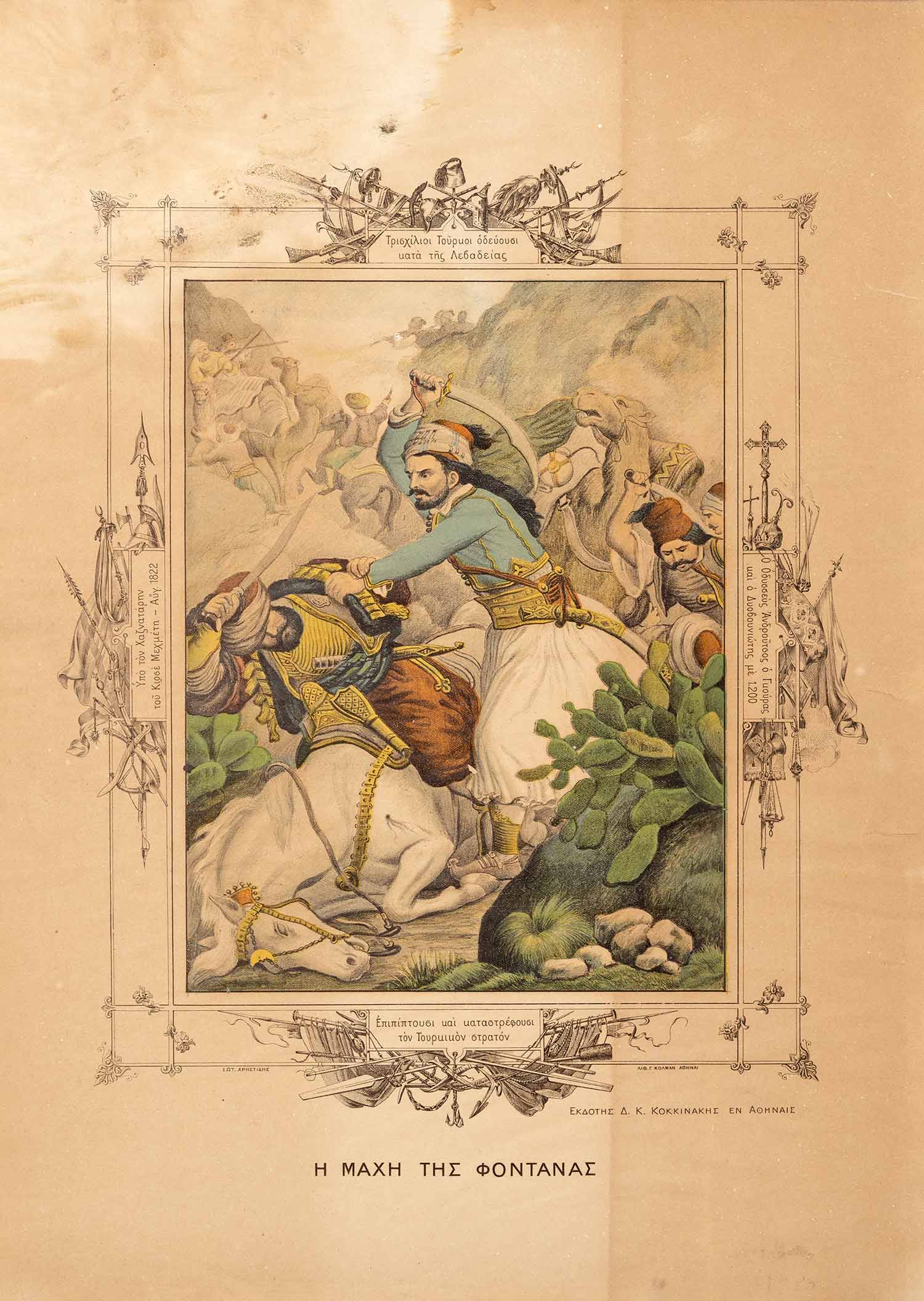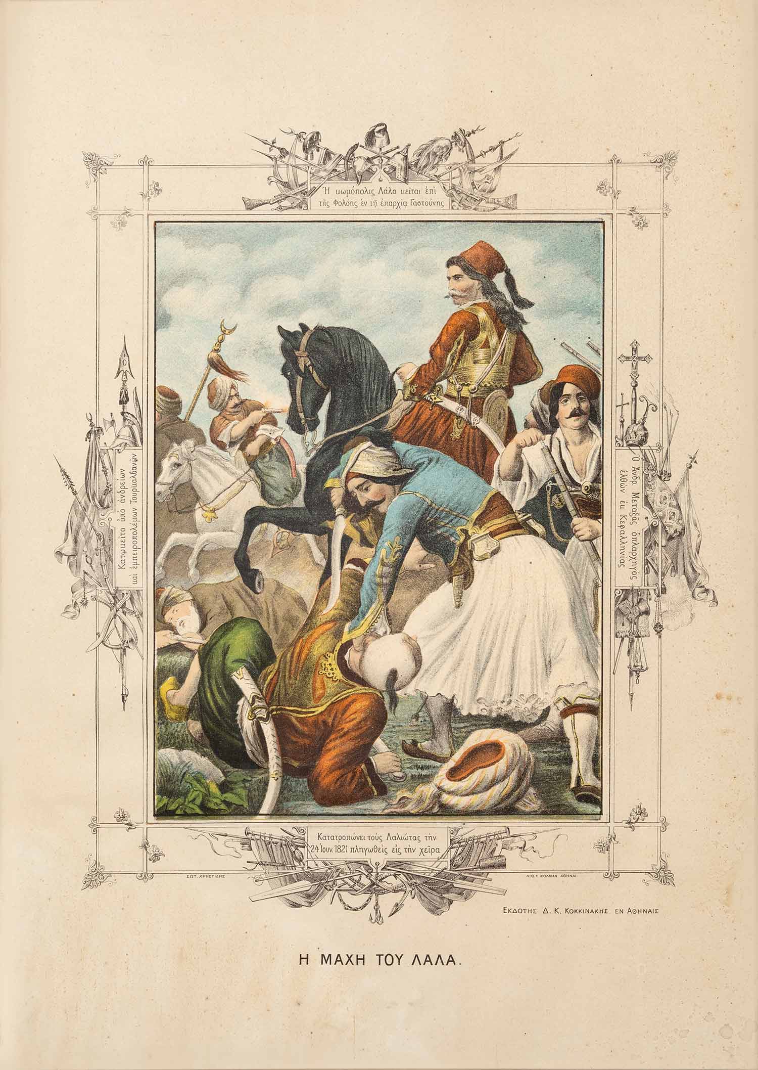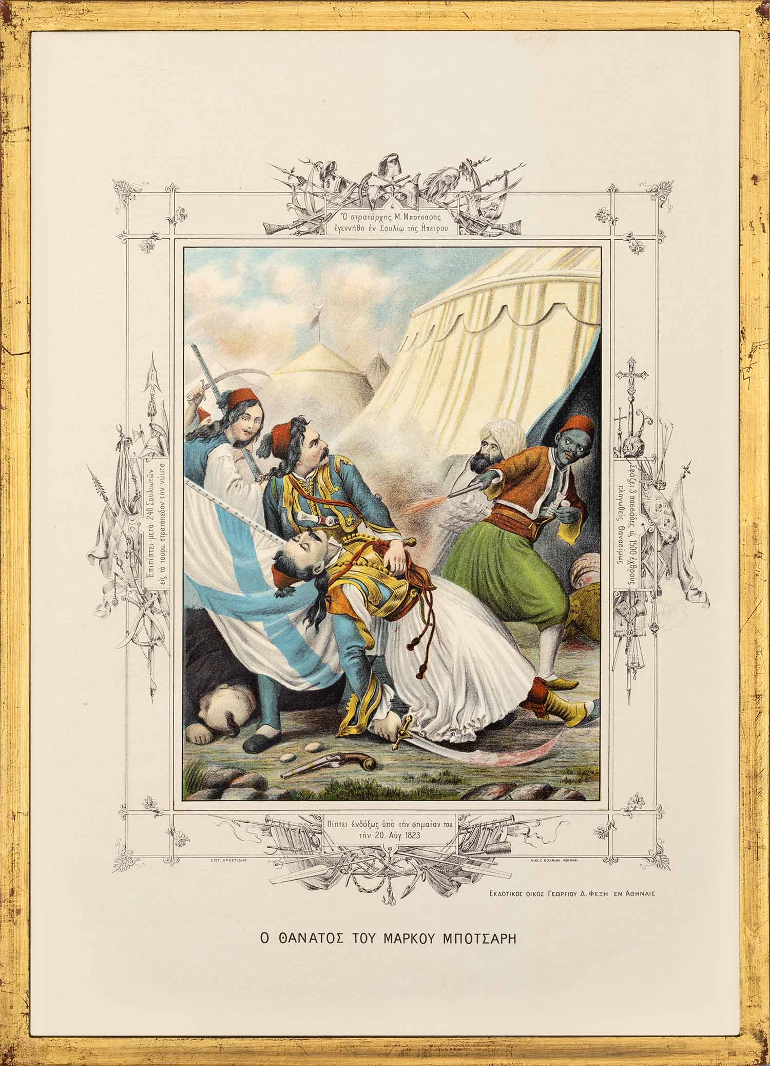 Τιμή εκτίμησης: € 500 - 7006 χρωμολιθογραφίες, 525 x 370 mm. (ομοιόμορφα οξειδωμένες οι δύο τελευταίες, λίγο ζαρωμένη από υγρασία η πάνω πλευρά της τελευταίας, στίγματα από οξείδωση στα περιθώρια τριών άλλων). Σε ομοιόμορφες κορνίζες. (6) • Οι τίτλοι είναι οι εξής (σημειώνεται σε παρένθεση ο εκδότης: ΔΚΚ= Δ. Κ. Κοκκινάκης, ΓΔΦ = Γ. Δ. Φέξης): «Ἡ μάχη τοῦΛάλα» (ΔΚΚ), «Ἡ ἅλωσις τῆς Τριπόλεως» (ΓΔΦ), «Ἡ καταστροφή τοῦ Δράμαλη» (ΔΚΚ), «Ὁ θάνατος τοῦ Μάρκου Μπότσαρη» (ΓΔΦ), «Ὁ Ρήγας Φεραῖος» (ΔΚΚ) και «Ἡ μάχη τῆς Φοντάνας» (ΔΚΚ).
