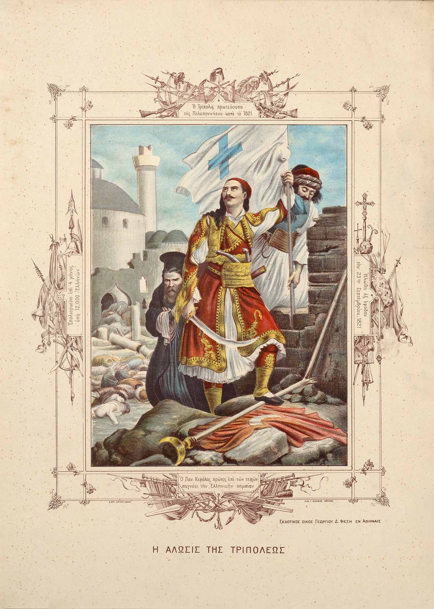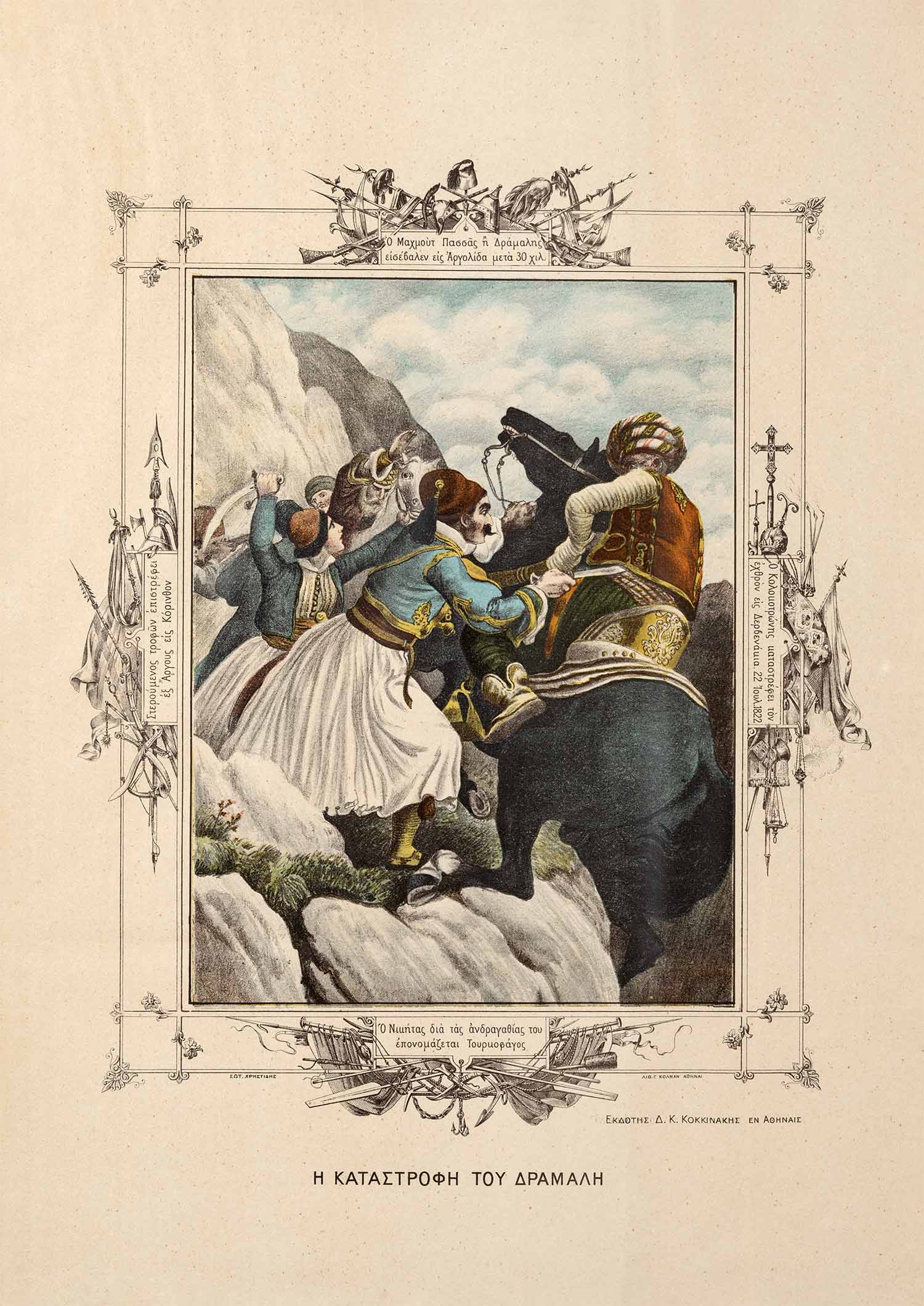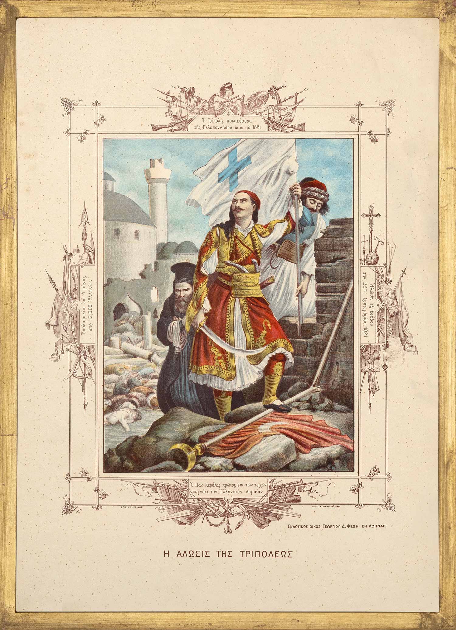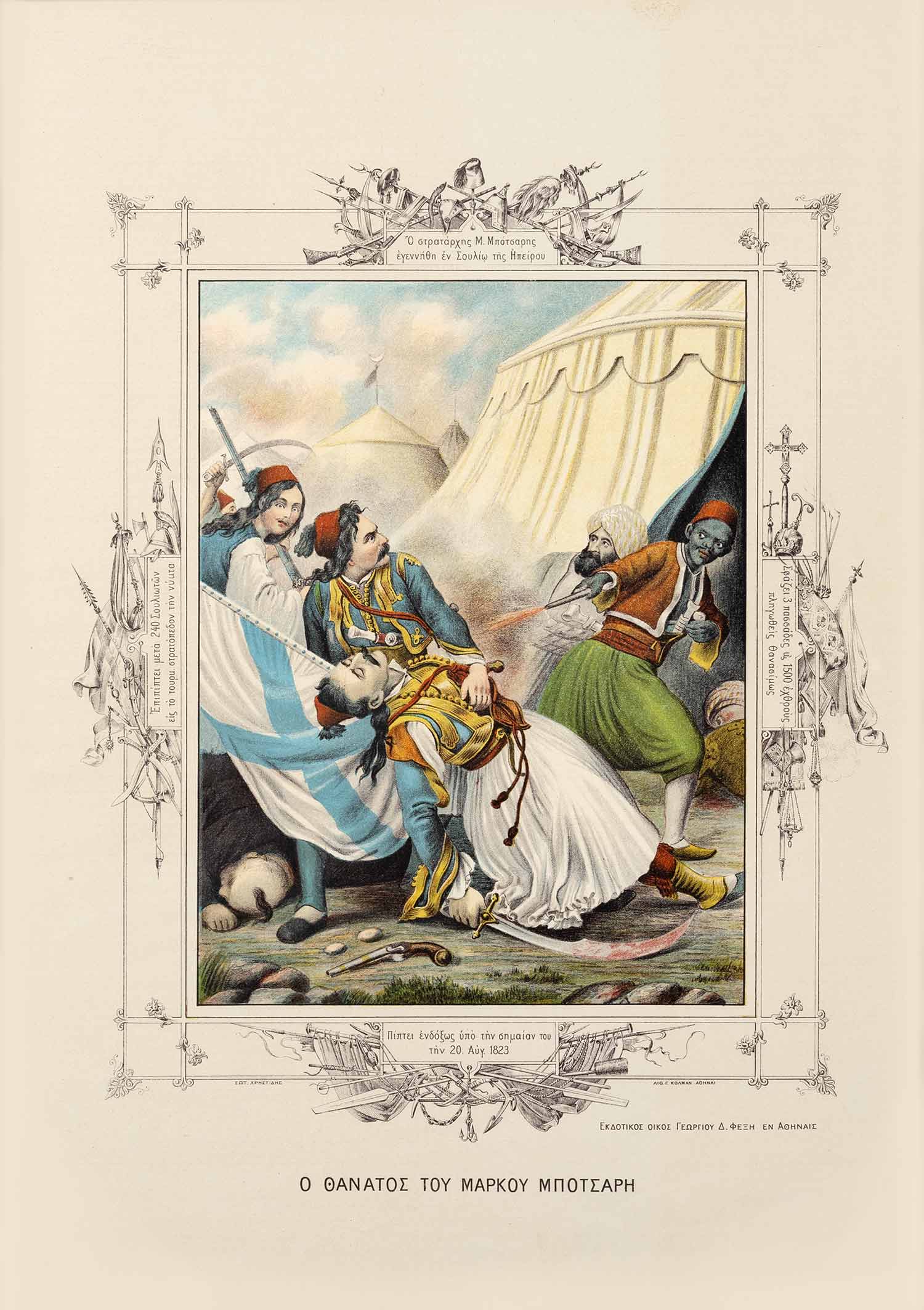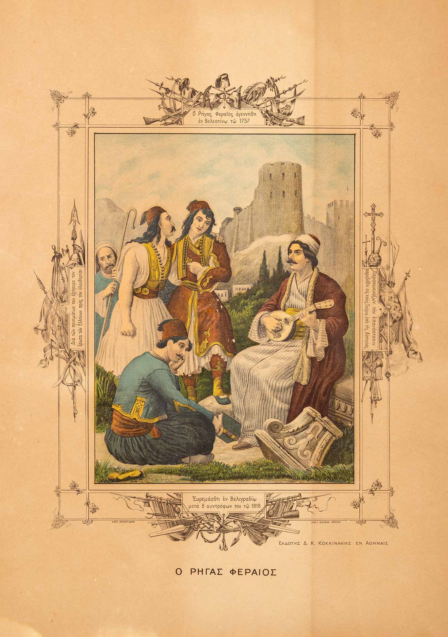 Τιμή εκτίμησης: € 500 - 7006 χρωμολιθογραφίες, 525 x 370 mm. (ομοιόμορφα οξειδωμένες οι δύο τελευταίες, λίγο ζαρωμένη από υγρασία η πάνω πλευρά της τελευταίας, στίγματα από οξείδωση στα περιθώρια τριών άλλων). Σε ομοιόμορφες κορνίζες. (6) • Οι τίτλοι είναι οι εξής (σημειώνεται σε παρένθεση ο εκδότης: ΔΚΚ= Δ. Κ. Κοκκινάκης, ΓΔΦ = Γ. Δ. Φέξης): «Ἡ μάχη τοῦΛάλα» (ΔΚΚ), «Ἡ ἅλωσις τῆς Τριπόλεως» (ΓΔΦ), «Ἡ καταστροφή τοῦ Δράμαλη» (ΔΚΚ), «Ὁ θάνατος τοῦ Μάρκου Μπότσαρη» (ΓΔΦ), «Ὁ Ρήγας Φεραῖος» (ΔΚΚ) και «Ἡ μάχη τῆς Φοντάνας» (ΔΚΚ).