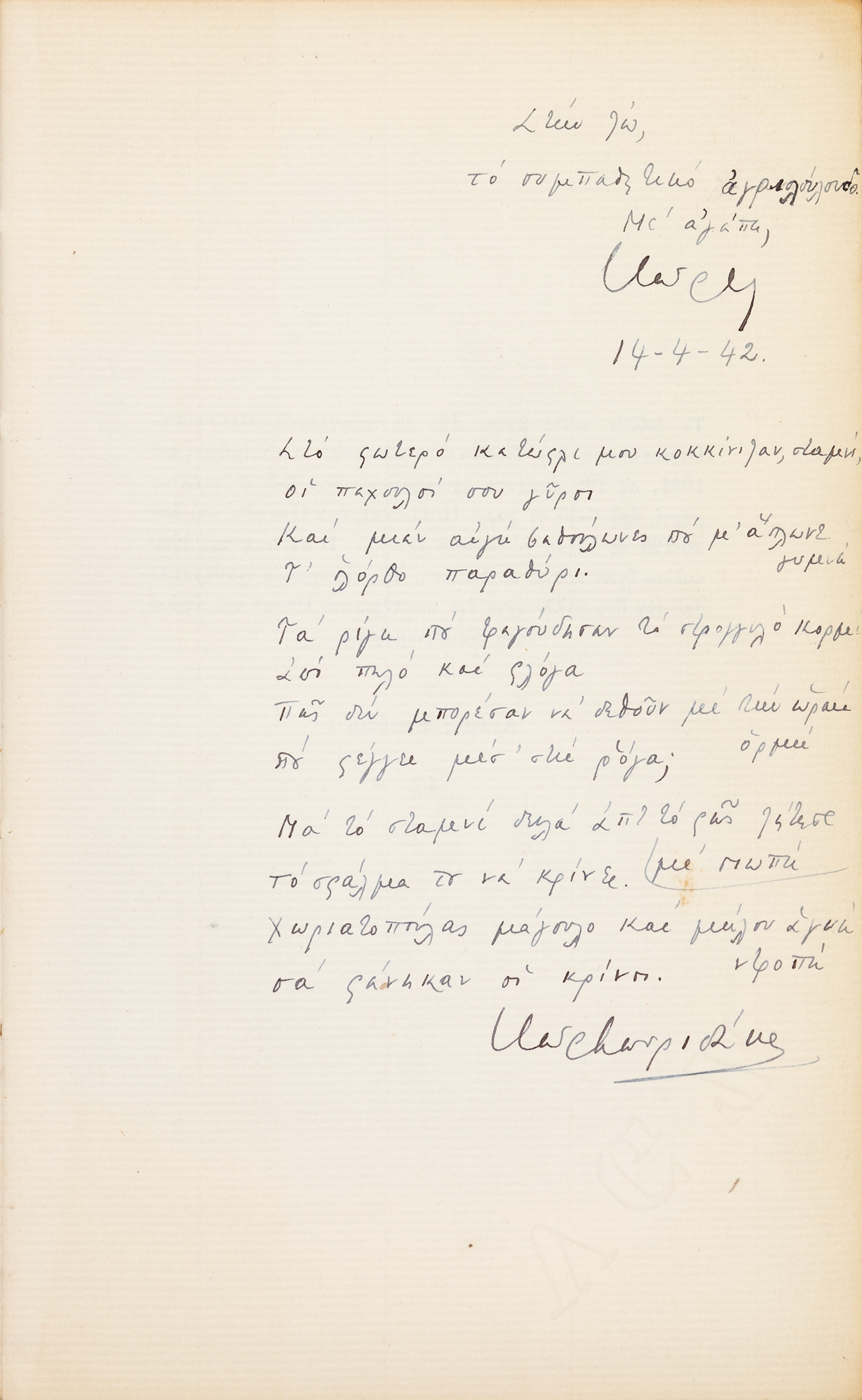 Τιμή εκτίμησης: € 150 - 20079 σ. Έκδοση περιορισμένη σε 125 αριθμημένα αντίτυπα, με εικονογράφηση του Δημητρίου ΓΑΛΑΝΗ, ξυλόγραφες βινιέτες εντός κειμένου και μία οξυγραφία σε θέση προμετωπίδας, ένα από τα 20 αντίτυπα σε χαρτί Hollande Van Gelder, με την οξυγραφία αριθμημένη και υπογεγραμμένη. Αντίτυπο με ιδιόχειρη αφιέρωση του ποιητή («Στήν Ιώ / τό συμπαθητικό ἀγριολούλουδο. / Μέ ἀγάπη, / […] /14-4-42») και αυτόγραφο του ποιή ματός του «Σταμνί» [βλ. σ. 56] στο πρώτο (λευκό) φύλλο. Αρχικά εξώφυλλα. Γαλάνης (Εικονογραφημένα) 1941/1.