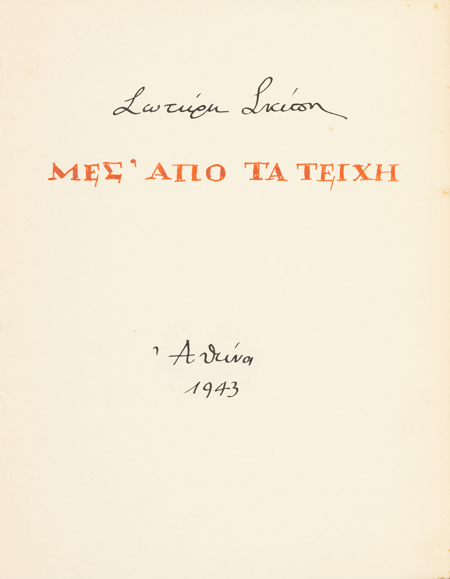 Τιμή εκτίμησης: € 1.000 - 1.500225 x 175 mm., [64] σ. Έκδοση σε 105 αριθμημένα αντίτυπα με χειρόγραφο το μέχρι τότε αδημοσίευτο κείμενο και ξυλογραφίες του Σπύρου ΒΑΣΙΛΕΙΟΥ, όλα τα αντίτυπα υπογεγραμμένα από τον ποιητή, η πρώτη ξυλογραφία αριθμημένη, υπογεγραμμένη και χρονολογημένη από τον καλλιτέχνη, σε άρραφα δίφυλλα (όπως κυκλοφόρησε). Αρχικά εξώφυλλα (μικρές φθορές).