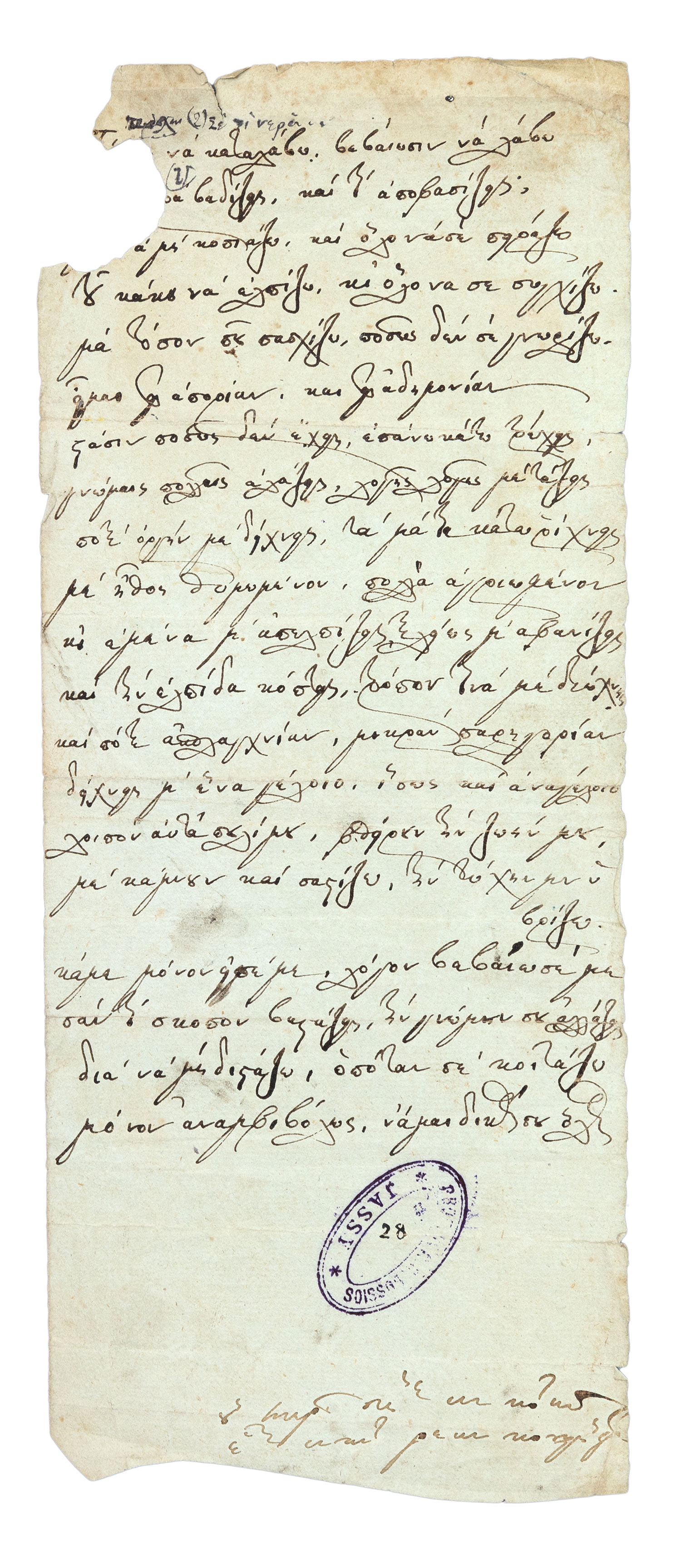 Τιμή εκτίμησης: € 500 - 7001. Έχει επιγραφή: Στίχοι τοῦ Μαυροκορδάτου. Αρχ.: Ὦ ἀπουσία! Πηγὴ δακρύων / καμάτων βρύσις φθορᾶς σημεῖον / αἰτία πρώτη ἀμφιβολίας / σκώλιξ τιτρώσκει πολλῶν καρδίας. Σύνολο στίχων 21. 2. Ανεπίγραφο. Αρχ.: Πάσχω νὰ καταλάβω, / βεβαίωσιν νὰ λάβω / Σὲ τὶ νερὰ βαδίζεις, / καὶ τὶ ἀποφασίζεις; Σύνολο διπλών στίχων 20. • Και τα δύο γραμμένα με το ίδιο χέρι, με διαφορετικό μελάνι και χαρτί. Φέρουν επίσης οβάλ γαλάζια σφραγίδα με την επιγραφή […] M.G. DOSSIOS. JASSY. Και τους αριθμούς εσωτερικά 28 και 31.